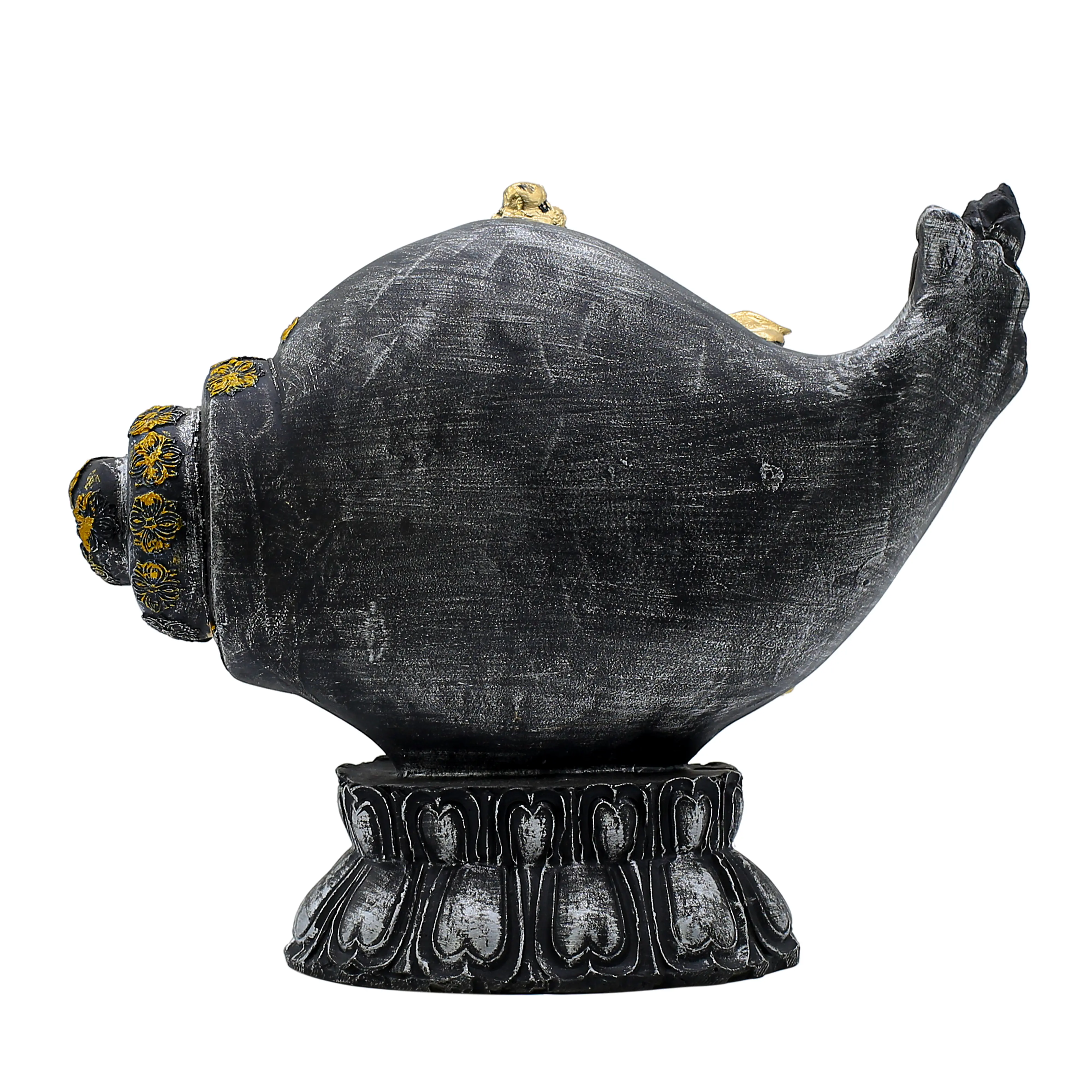 Elevate the spiritual ambiance of your home or office with our Antique Black & Gold Resin Ganesha on Conch Statue. In Hindu mythology, the Shankh (Conch Shell) is associated with Lord Vishnu and Goddess Lakshmi, representing the preservation of life and the flow of wealth. When Lord Ganesha, the Vighnaharta (Remover of Obstacles), is seated upon it, the idol becomes a potent symbol for overcoming financial hurdles and attracting good fortune.