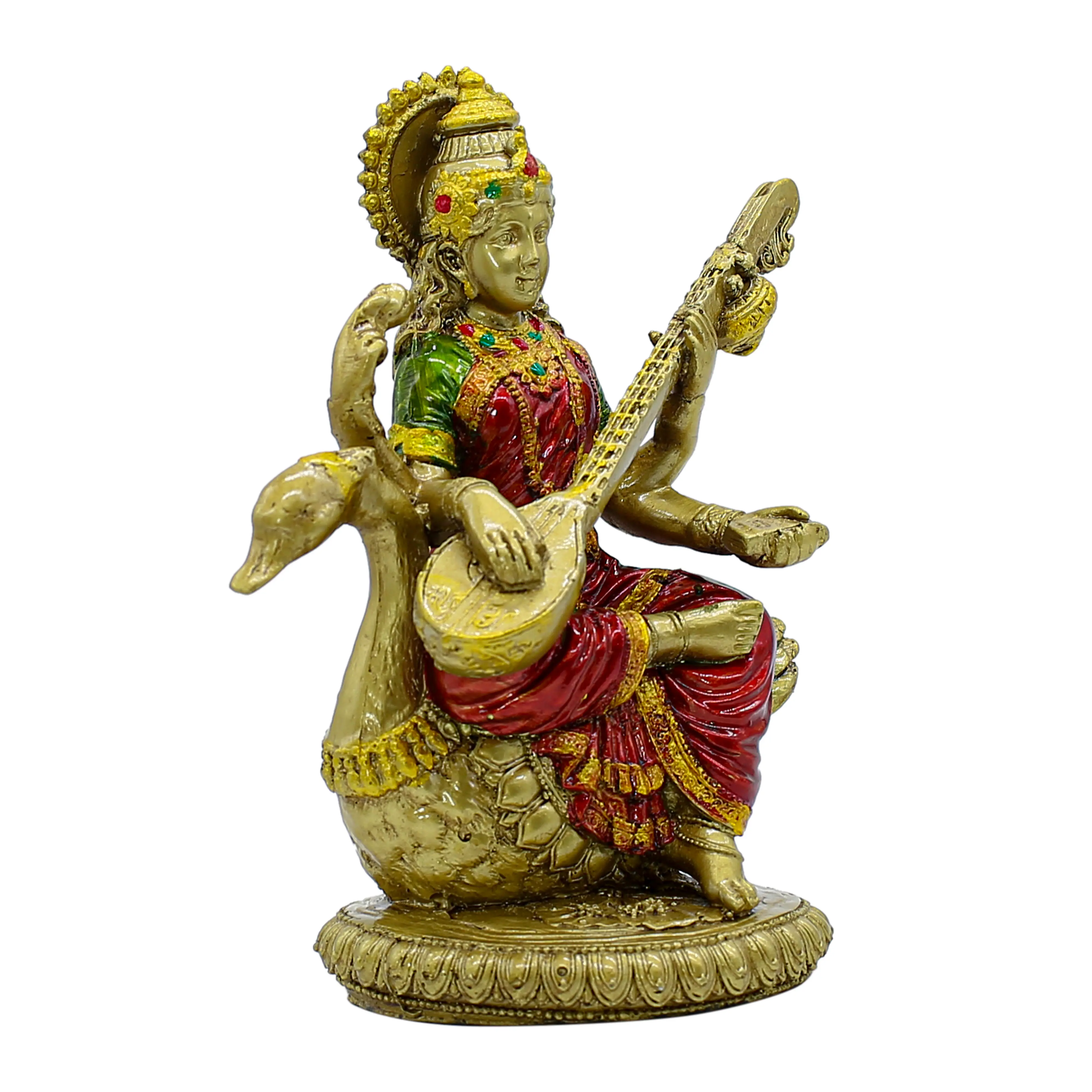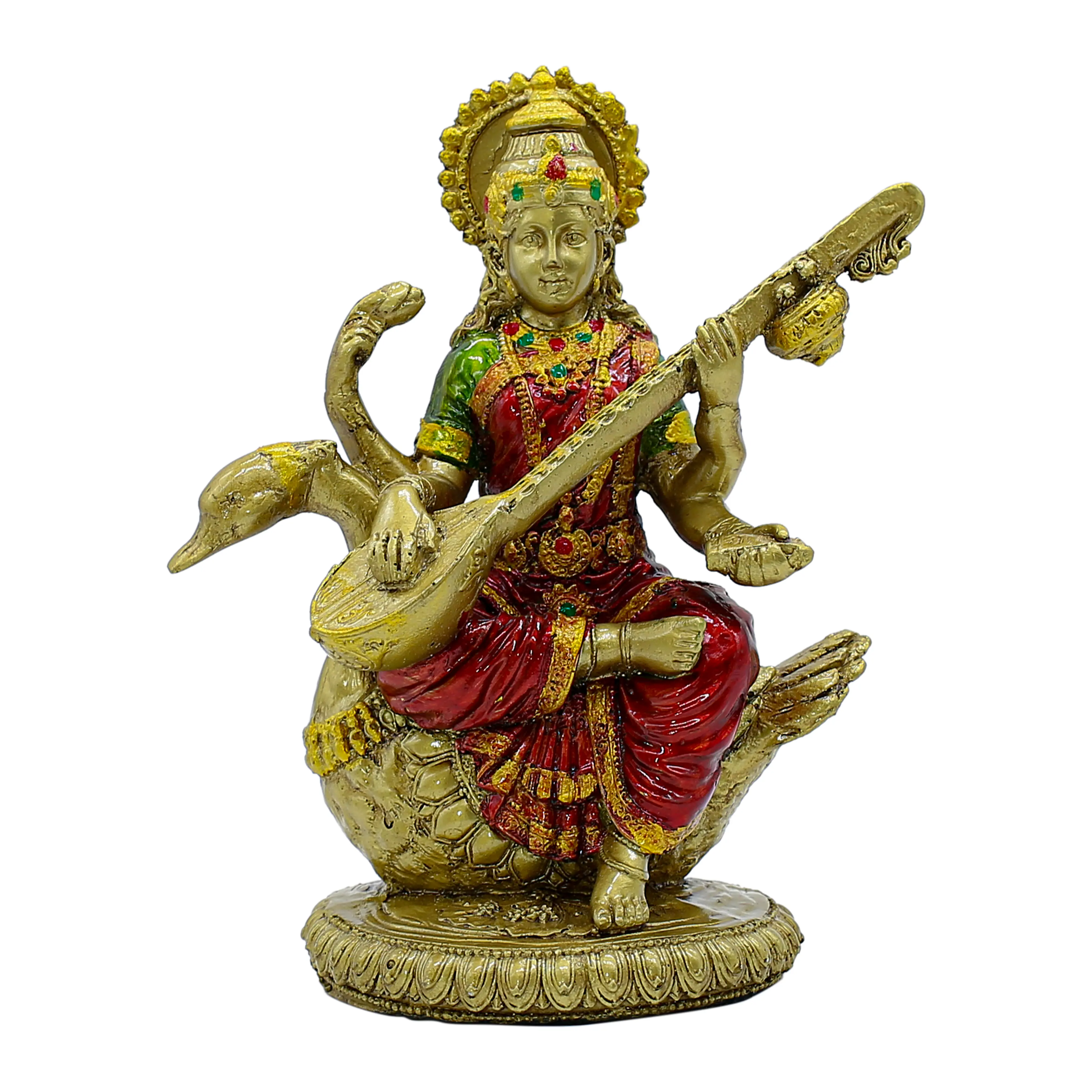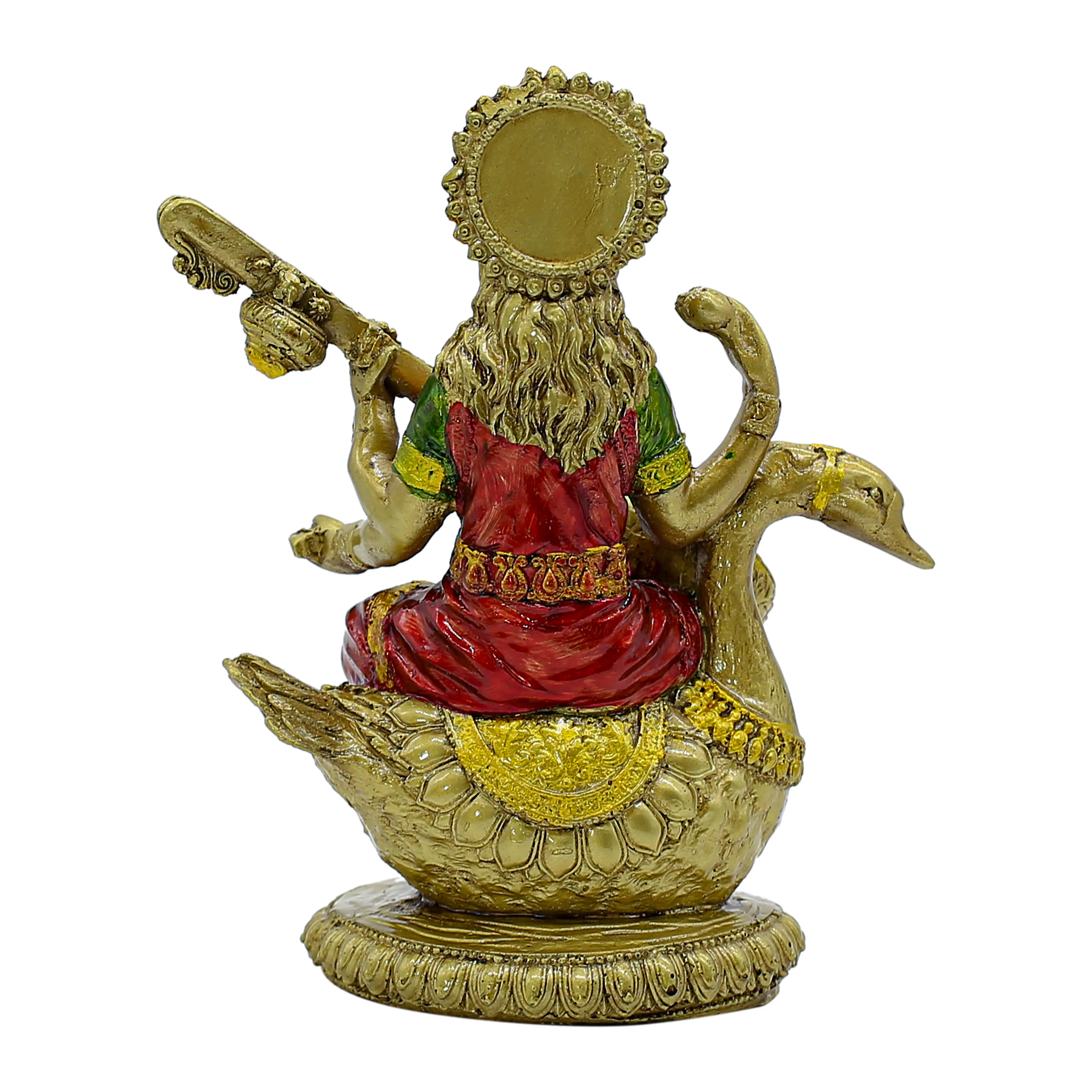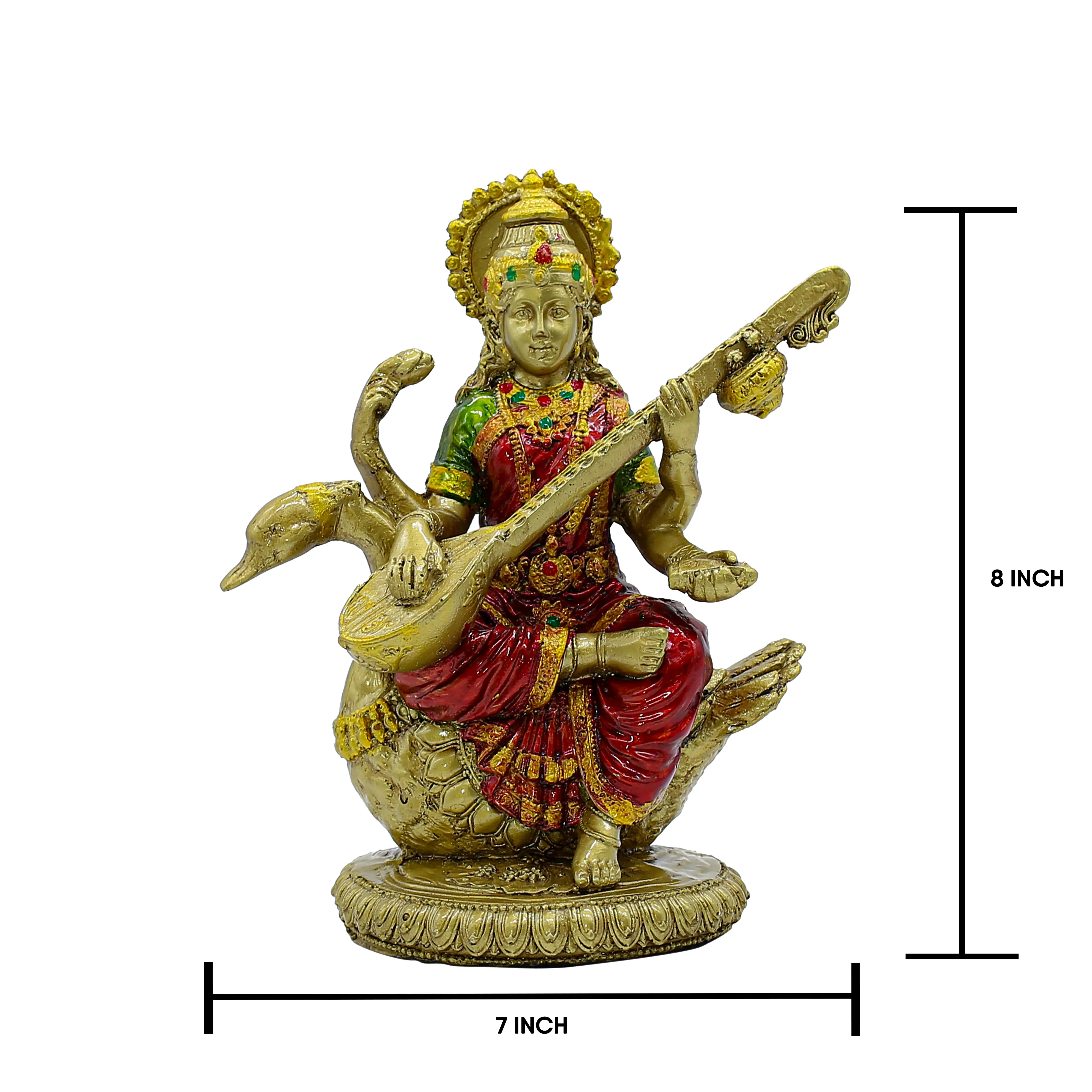 Embrace the divine energy of knowledge, arts, and music with this exquisite resin Saraswati idol. The goddess is depicted in a serene pose, seated on her sacred swan (hamsa) and playing the veena. Handcrafted with attention to detail, the statue features a rich antique gold finish, beautifully highlighted with vibrant red and green accents on her attire and jewelry. Made from high-quality resin, this durable idol is perfect for your home altar, study desk, or office. It serves as an inspiring decor piece and a thoughtful gift for students, artists, and teachers on occasions like Vasant Panchami. Premium Material: Expertly crafted from high-quality, durable resin for a long-lasting finish. Exquisite Design: Features Goddess Saraswati seated on a swan, playing the veena, with intricate detailing. Elegant Finish: Adorned with a rich antique gold finish and vibrant red and green accents for a traditional look. Symbol of Wisdom: Represents knowledge, music, arts, and wisdom, making it ideal for study areas. Versatile Placement: Perfect for home decor, puja rooms, office desks, and educational institutions. Perfect Gift: An auspicious gift for students, artists, teachers, and for occasions like Vasant Panchami and housewarmings.