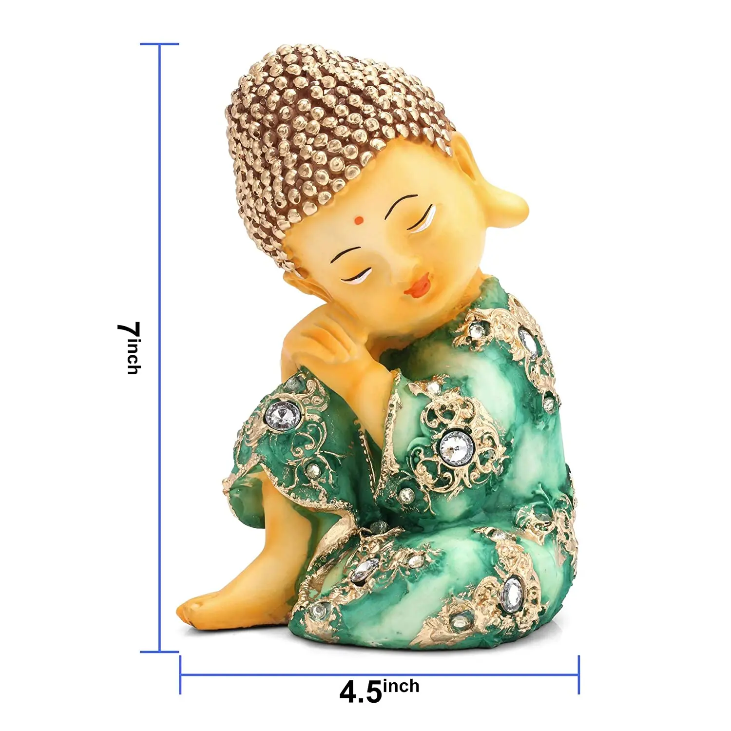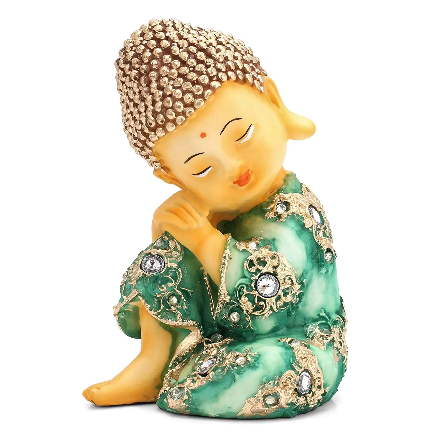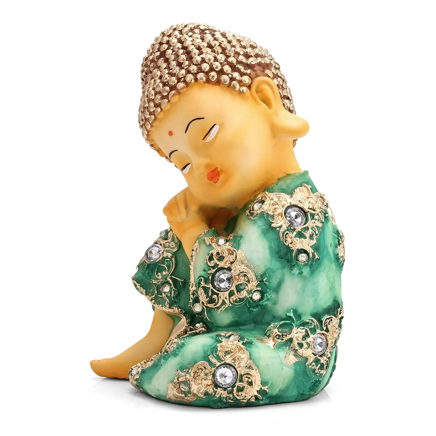 Infuse your surroundings with innocence and tranquility with our Polyresin Resting Baby Buddha Statue. This adorable figurine captures the essence of inner peace, featuring a "Little Monk" taking a restful pause with his eyes closed and a gentle smile on his face. The statue is a visual delight, dressed in a vibrant green robe that mimics the look of jade or marble, beautifully contrasted by rich gold filigree work and studded with shimmering artificial diamonds. The intricate texture of the golden curly hair and the serene facial expression add depth and character to this handcrafted piece. Whether you place it on your car dashboard to keep you calm during traffic or on your work desk to remind you to breathe, this cute Buddha idol is sure to bring a smile to your face. It blends spiritual symbolism with whimsical charm, making it a must-have decor item.