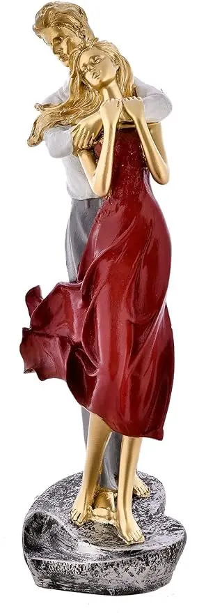 Exquisite Design and Detailing This stunning sculpture showcases a man holding his partner lovingly from behind, a pose that signifies protection and deep affection. The woman is depicted in a spectacular, flowy red dress that appears to be dancing in the breeze, adding a dynamic sense of movement to the piece. The couple’s skin is finished in a luxurious antique gold tone, giving the statue a high-end, gallery-quality appearance. The contrast between the vibrant red, the calming white of the man's shirt, and the textured grey base creates a visual harmony that blends effortlessly with any interior color scheme.
