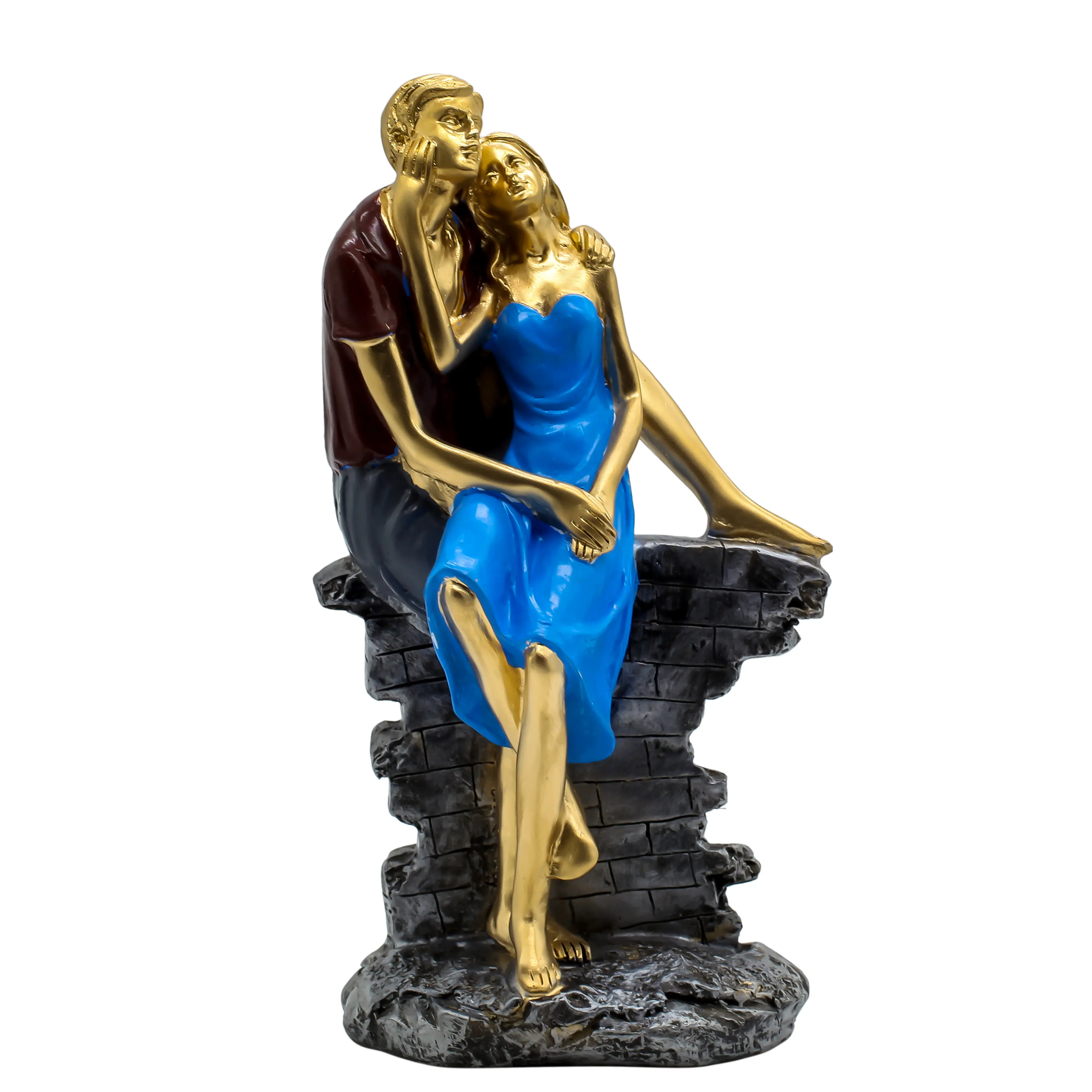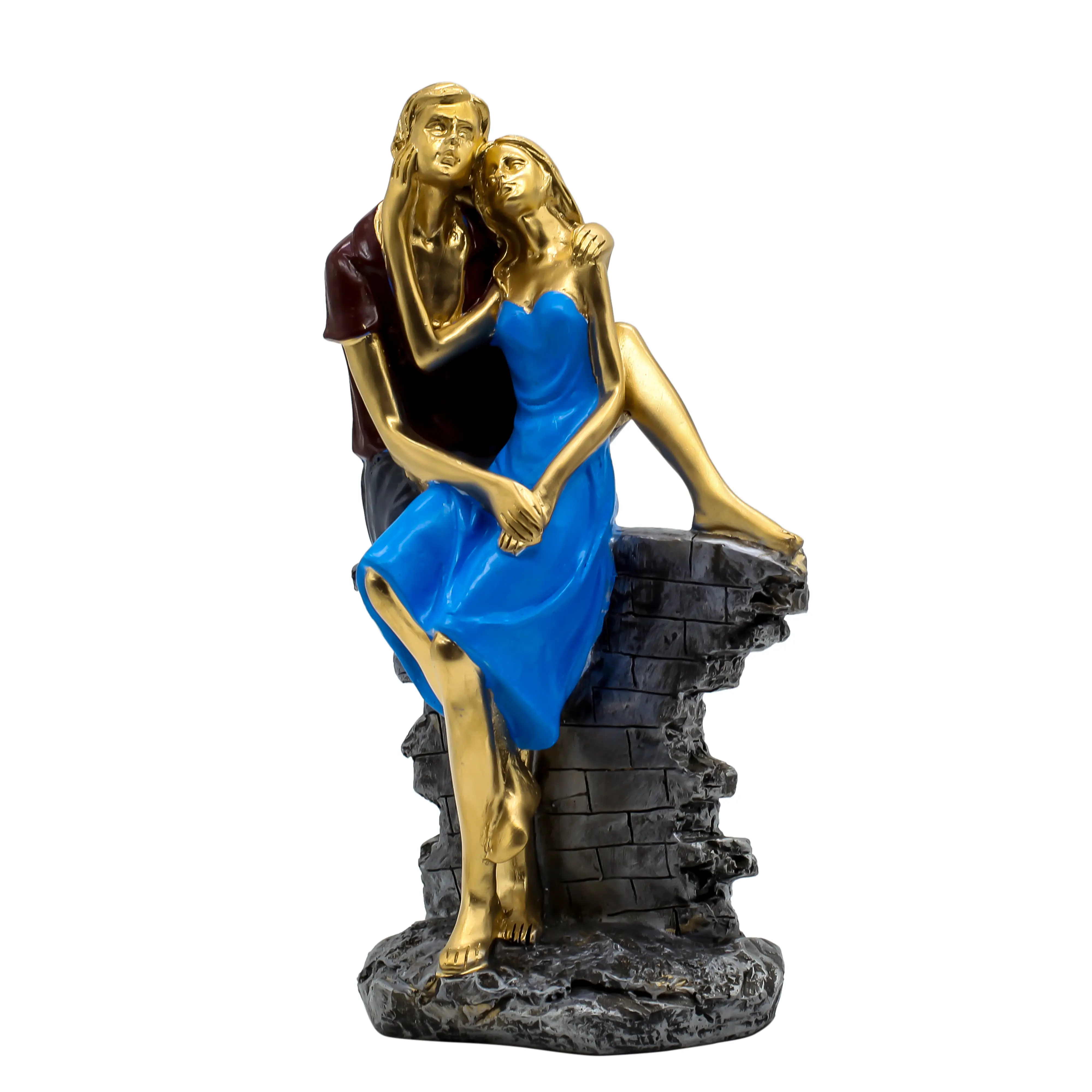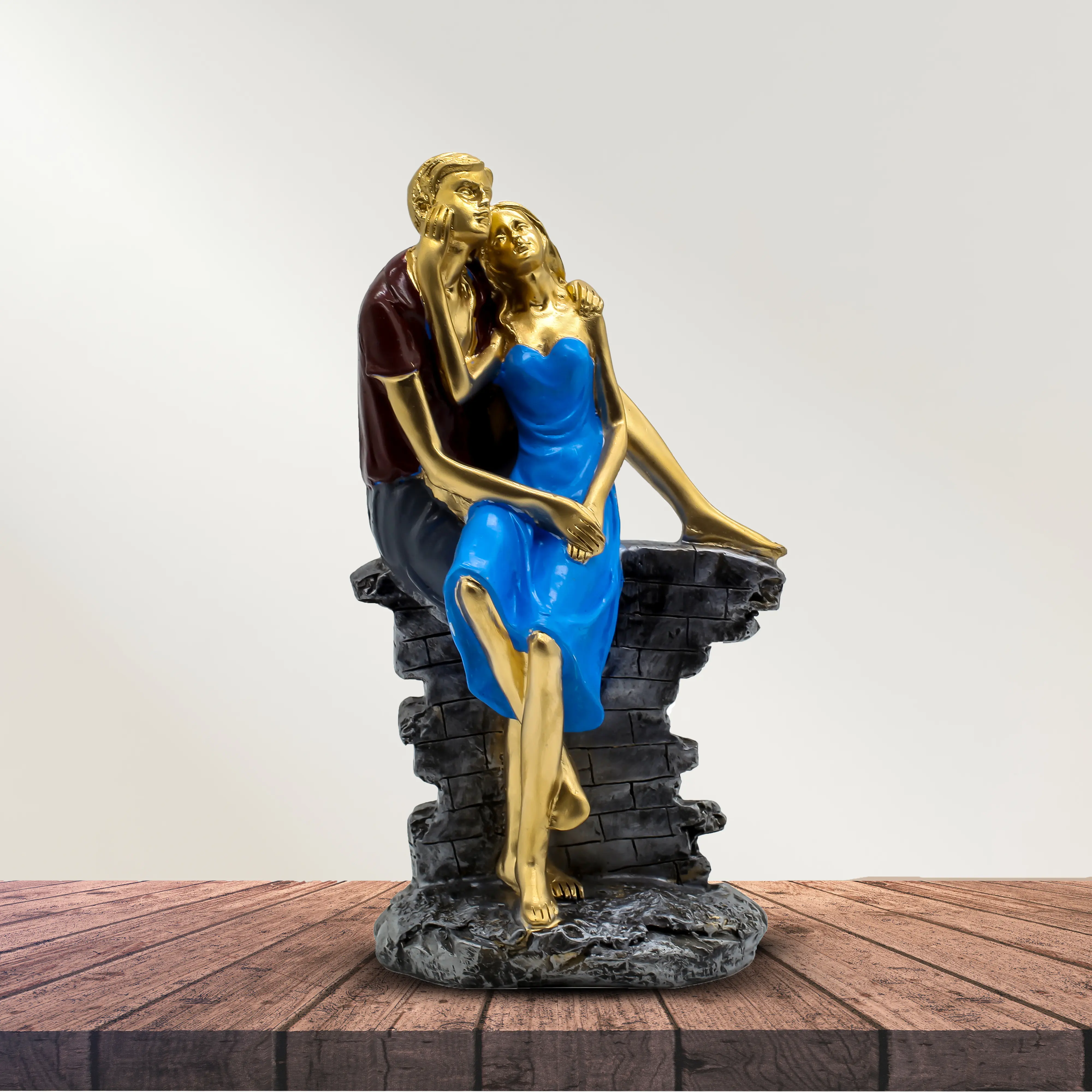 Artistic Design & Striking Details The statue portrays a couple in a tender, relaxed pose, sitting closely together on a rugged, dark grey brick wall. Their bodies are rendered in a luxurious metallic gold finish that catches the light beautifully, giving the piece a premium, artistic feel. The design is further enhanced by the vibrant colors of their clothing—the woman in a flowing blue dress and the man in a deep maroon top—which pop against the gold and dark base, creating a sophisticated and eye-catching contrast.