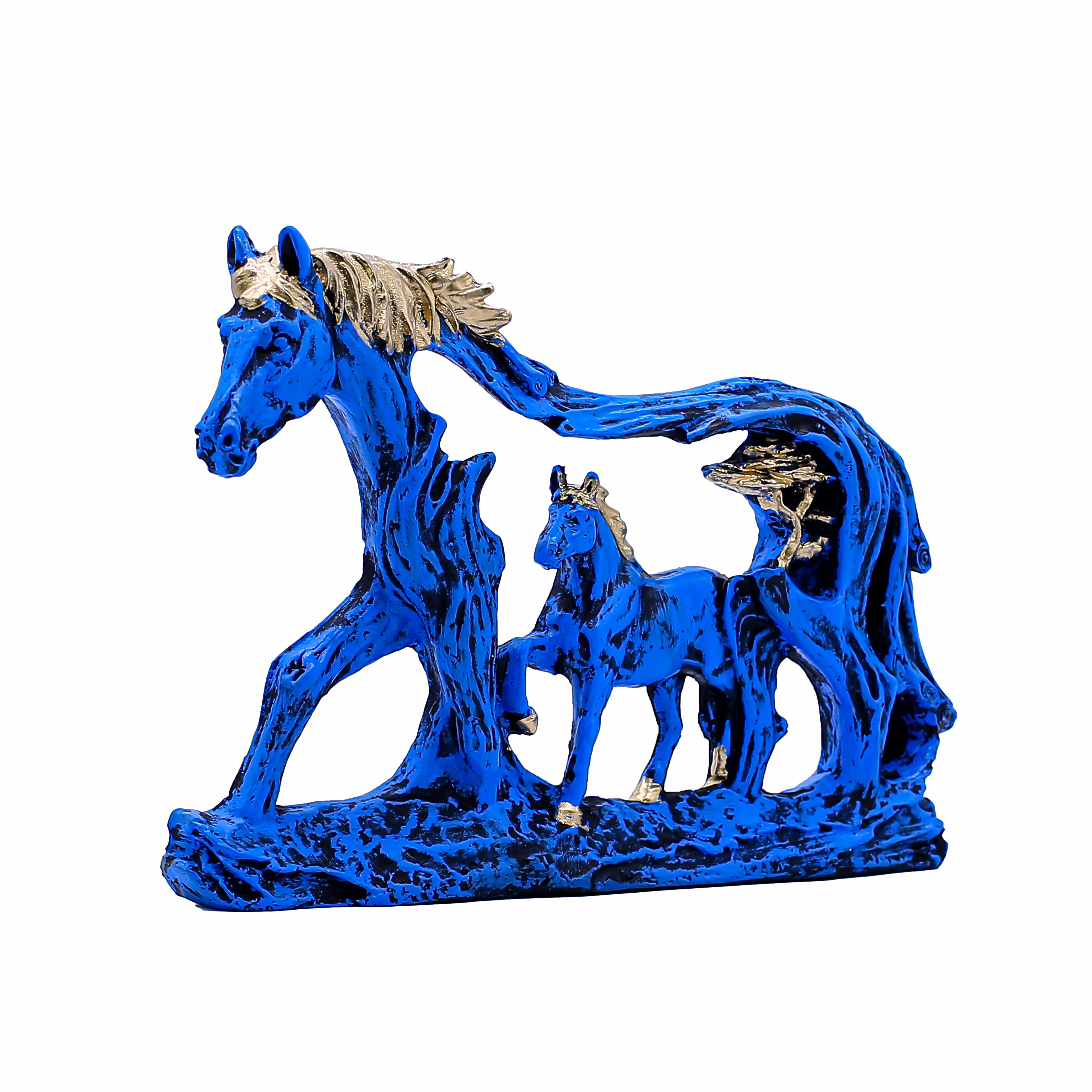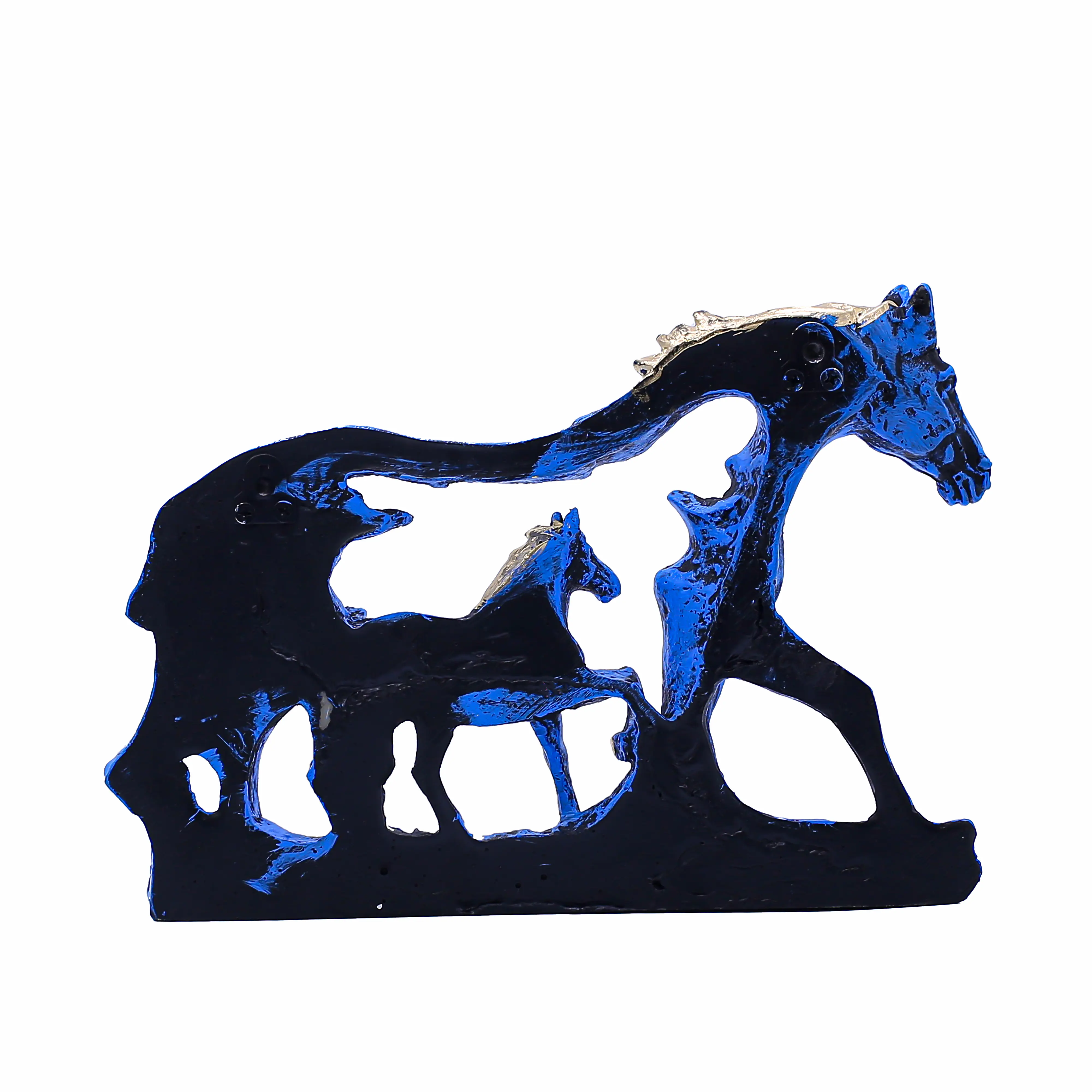 Artistic Design Meets Modern Aesthetics Gone are the days of flat paintings. This 3D relief sculpture brings your walls to life. The artwork depicts a mare and her foal running in unison, stylized with abstract, fluid lines that mimic the flow of water or wind. The deep, rich royal blue finish suggests depth and tranquility, while the hand-painted gold highlights on the mane, tail, and hooves provide a luxurious contrast that catches the light beautifully.