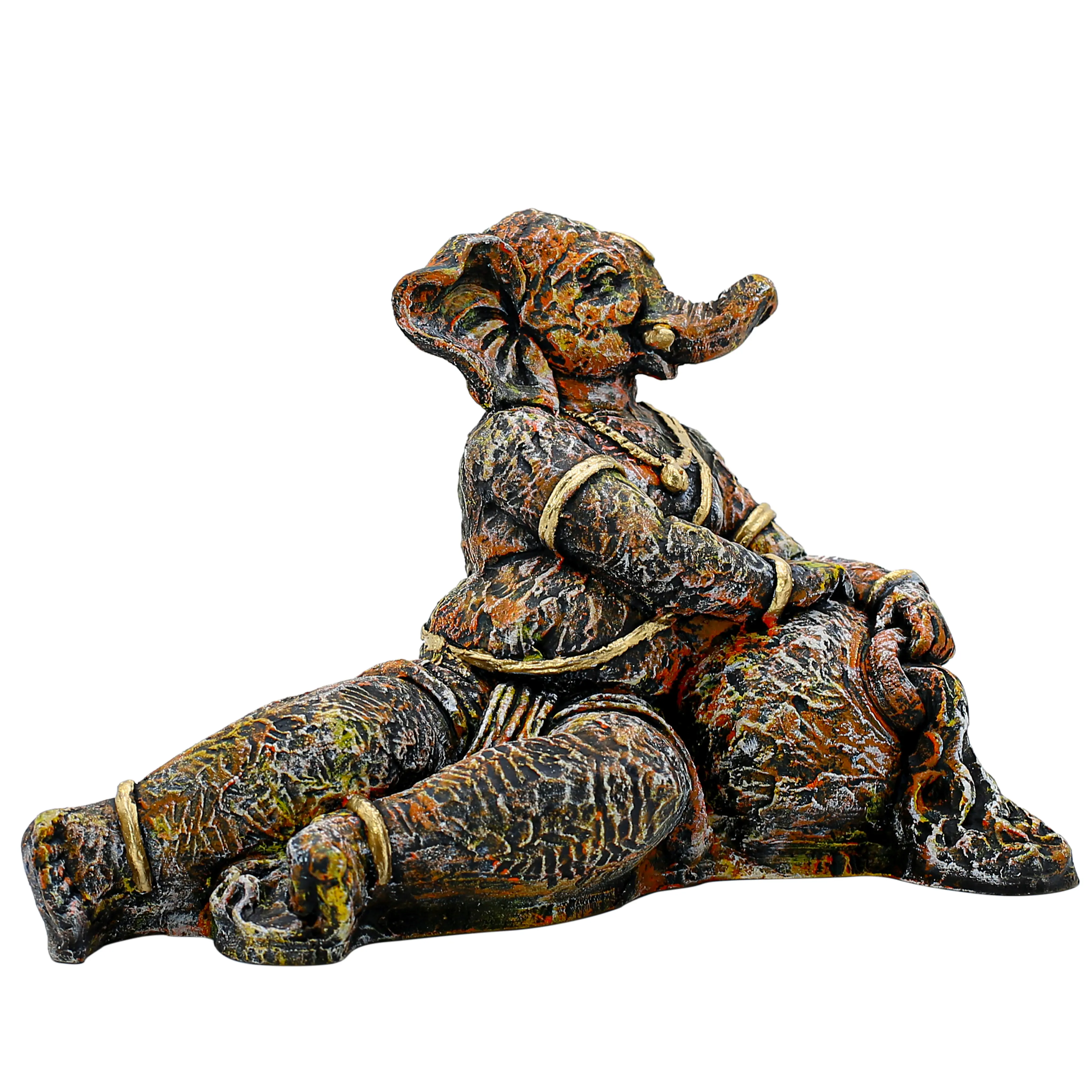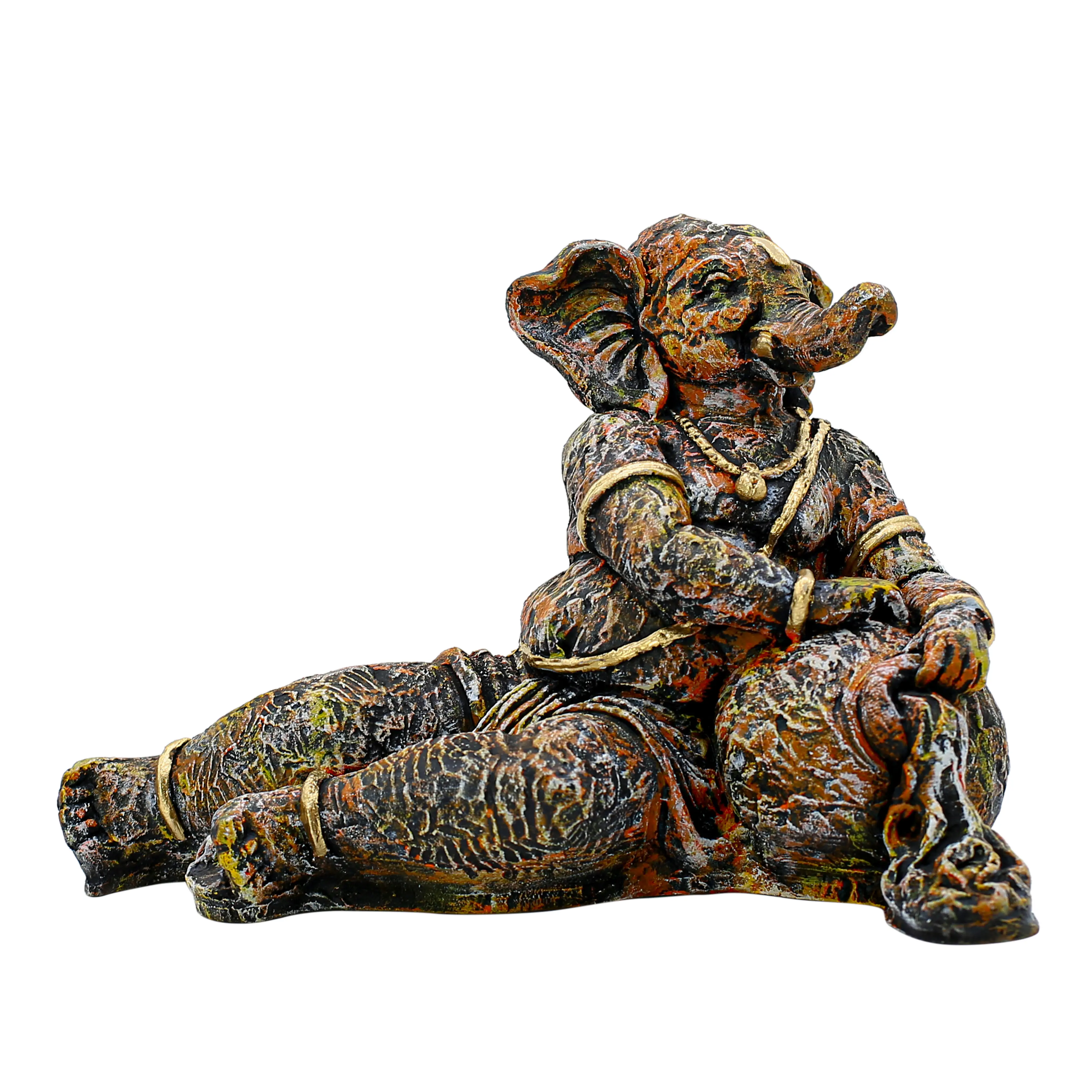 Distressed "Vintage" Aesthetic What sets this statue apart is its incredible finish. It is designed for the art lover who prefers subtlety over shine. The body of the idol features a heavily textured, "cracked" effect that mimics ancient artifacts or weathered rock found in historic temples. The color palette is a sophisticated mix of deep earth tones—charcoal, bronze, and rust—which makes the gold-leaf style highlights on the jewelry pop. From the trunk to the toes, every inch is detailed to look like a timeless treasure.
