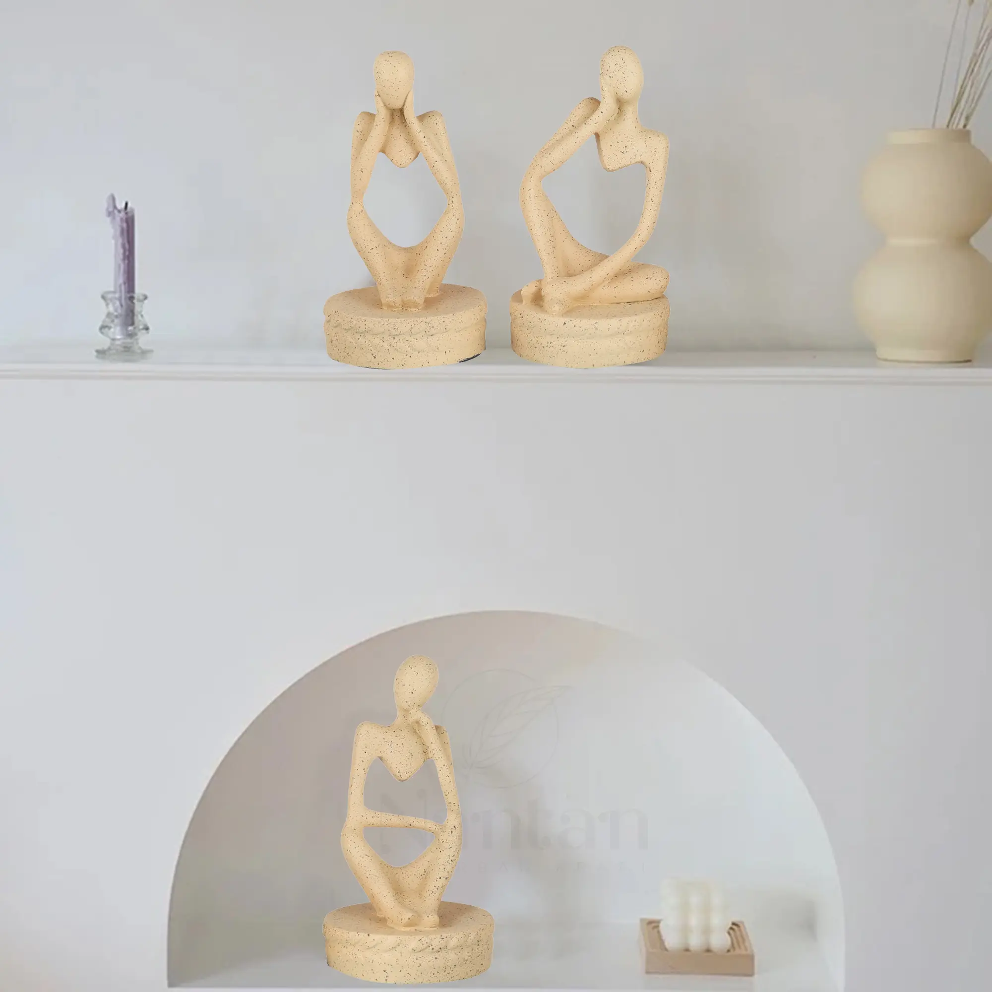 The Texture: We moved away from glossy, plastic-looking finishes. Instead, this set boasts a tactile, sandy texture. The beige/cream hue is dotted with tiny dark speckles, replicating the organic imperfections of natural stone. This makes the statues look significantly more expensive and luxurious than standard resin items.