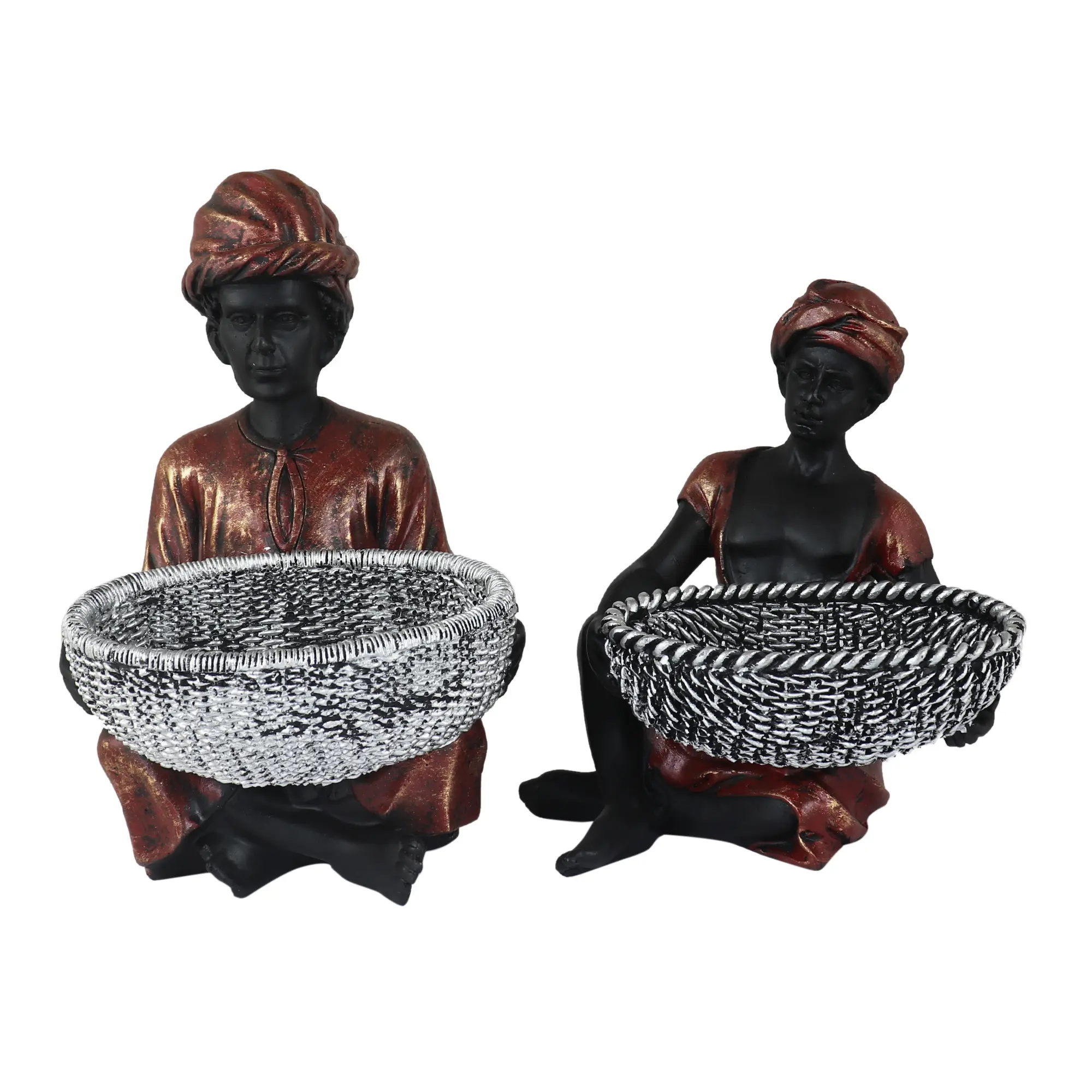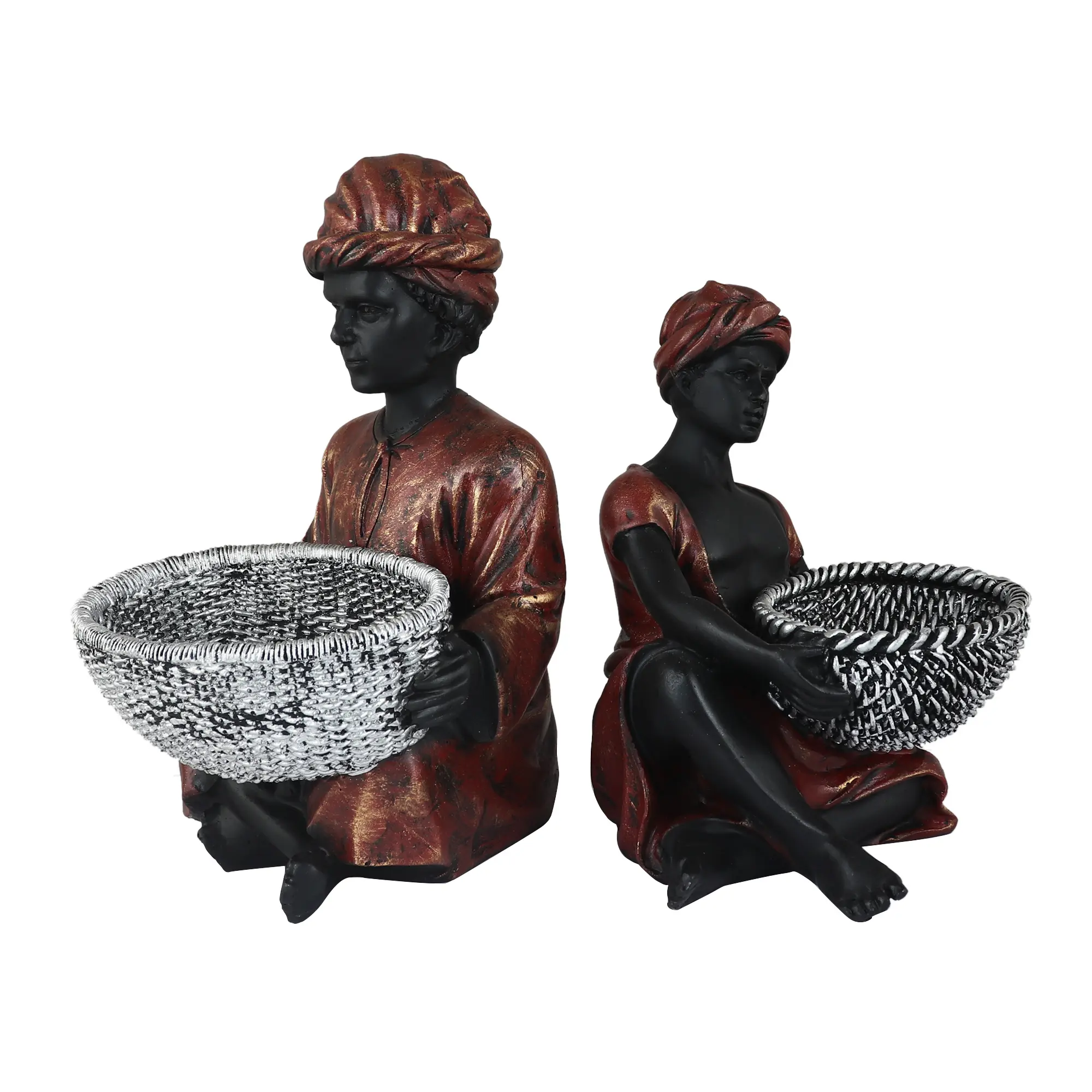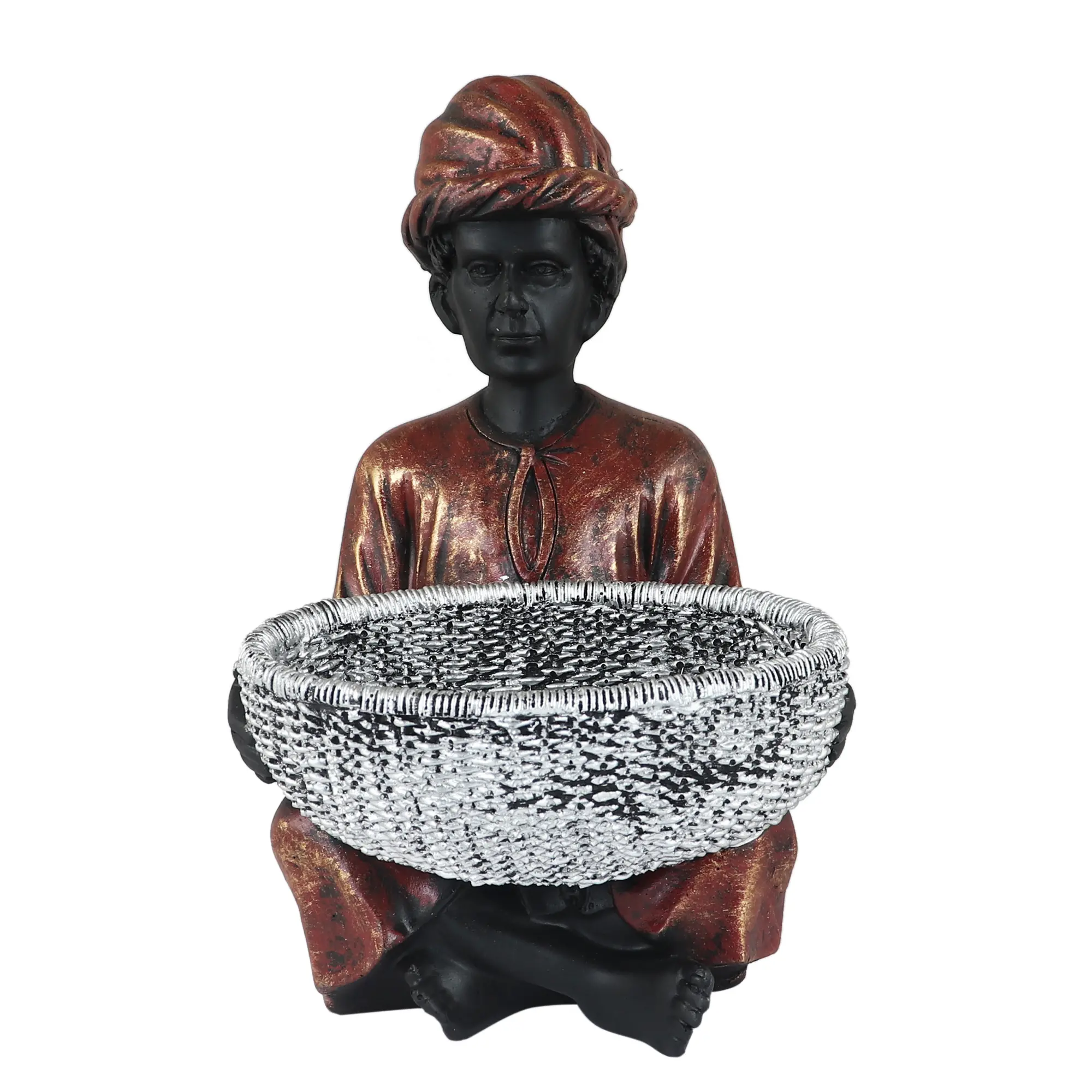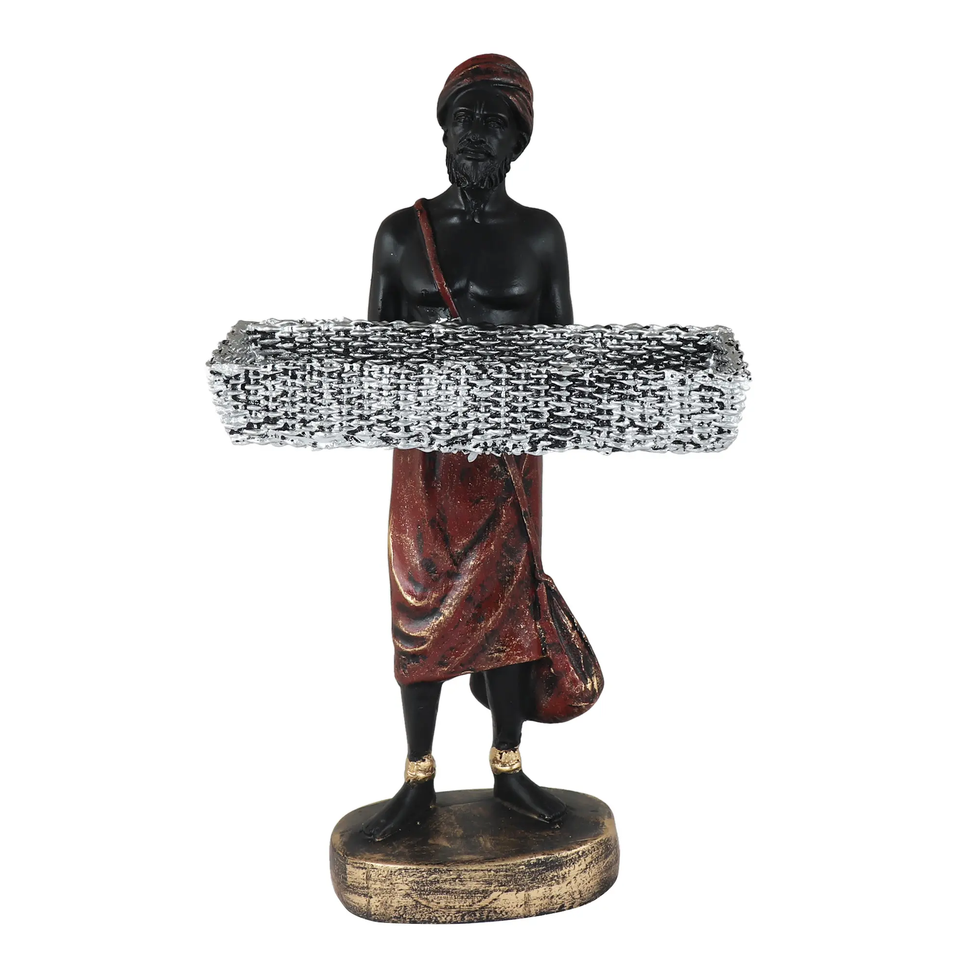 The Standing Figure: The centerpiece of the collection, this figure stands tall in a draped dhoti and sash, holding a rectangular silver basket. This shape is ideal for holding longer items like remote controls, sunglasses, or letters.