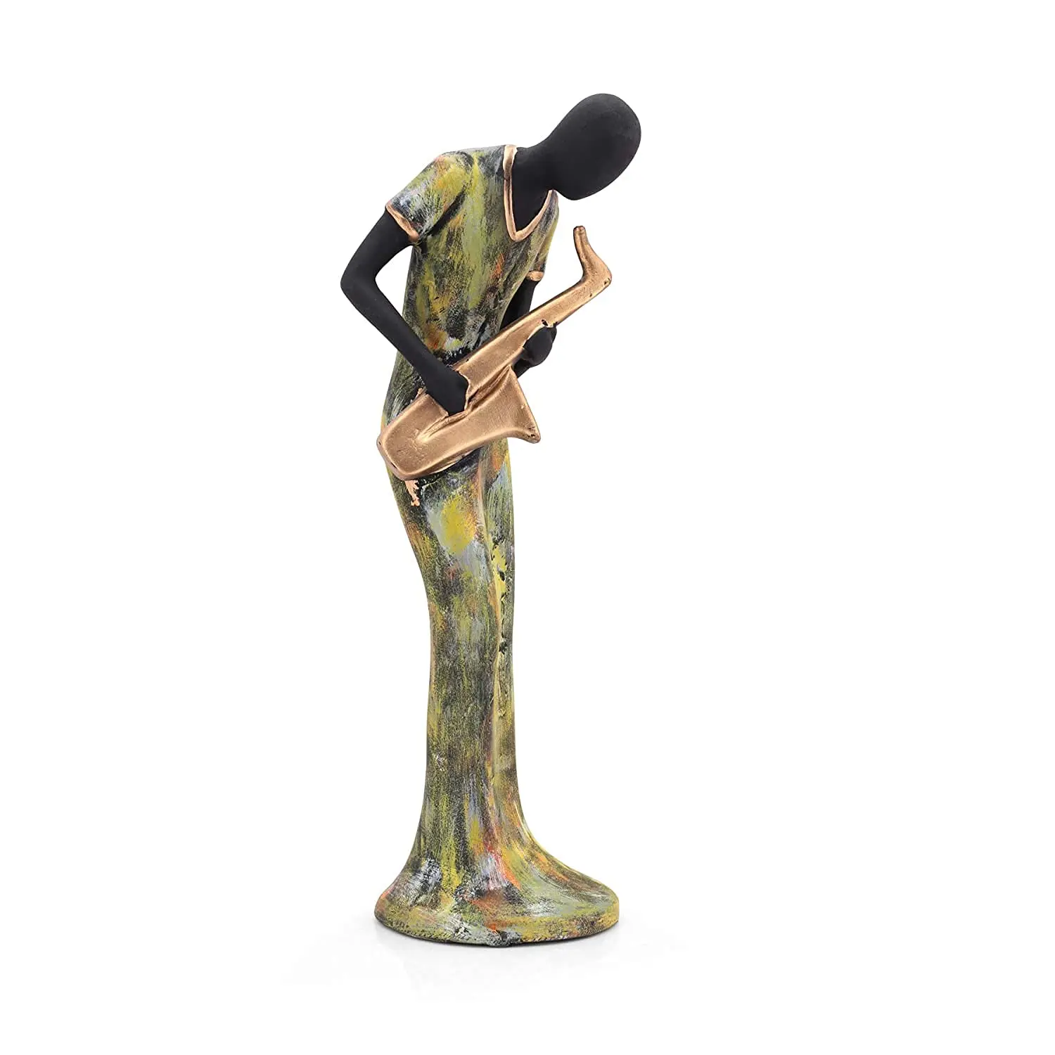 A Fusion of Modern & Tribal Art These figurines stand out due to their unique silhouette. The elongated limbs and fluid curves draw inspiration from Modern Abstract Art and traditional African Tribal Sculptures. The choice to make the figures faceless (with smooth black heads) is intentional—it universalizes the musicians, allowing you to imagine the intense focus and emotion on their faces as they play their gold-hued instruments.