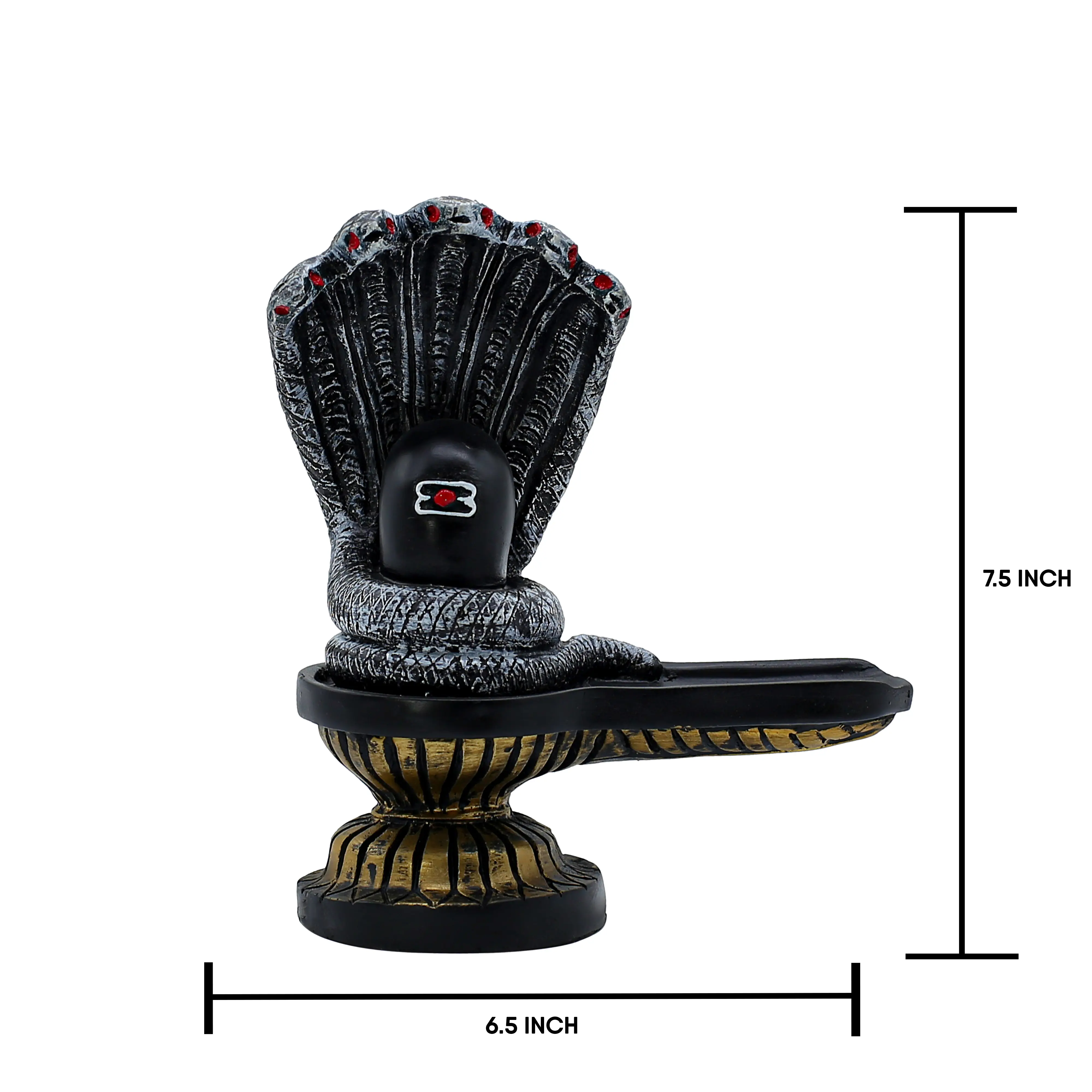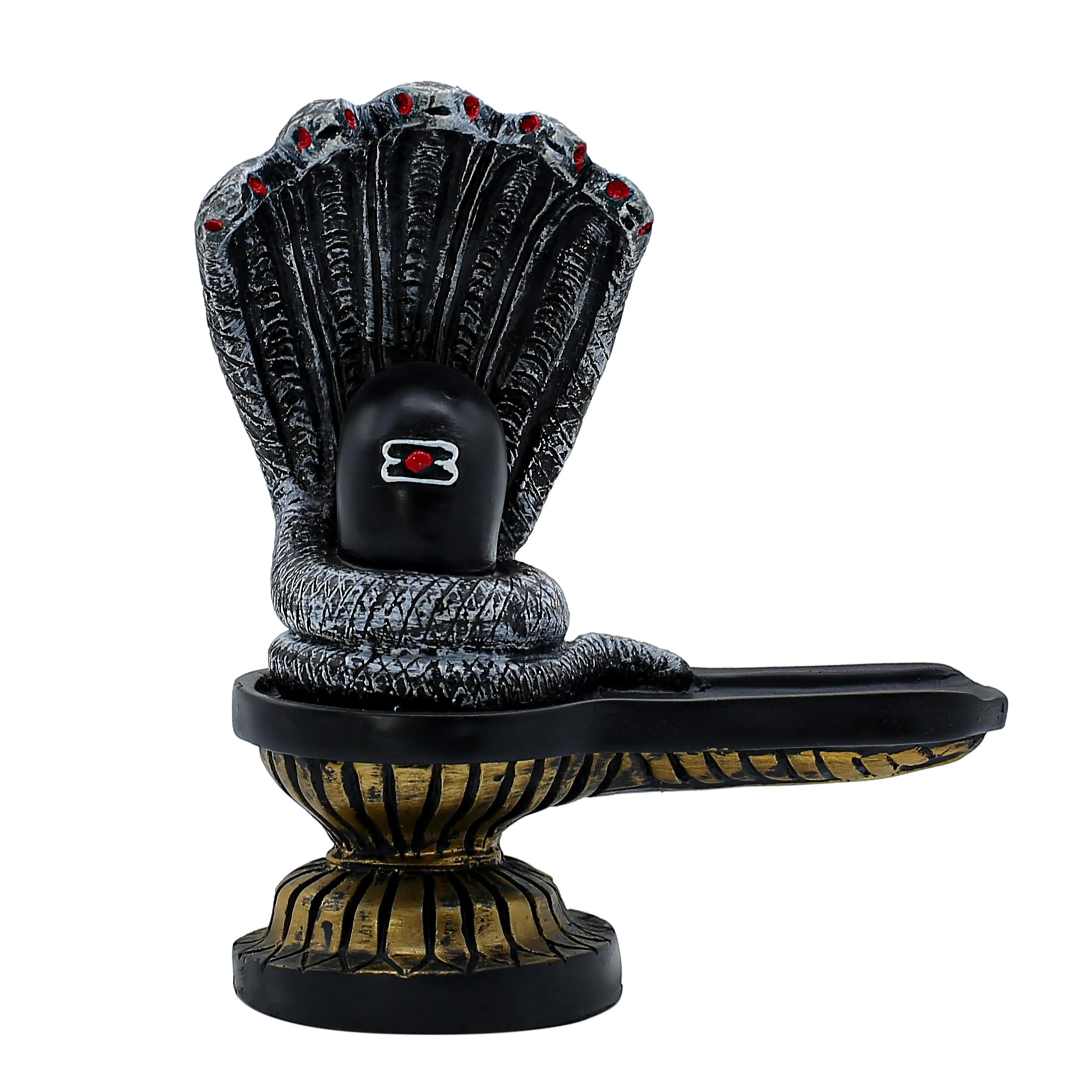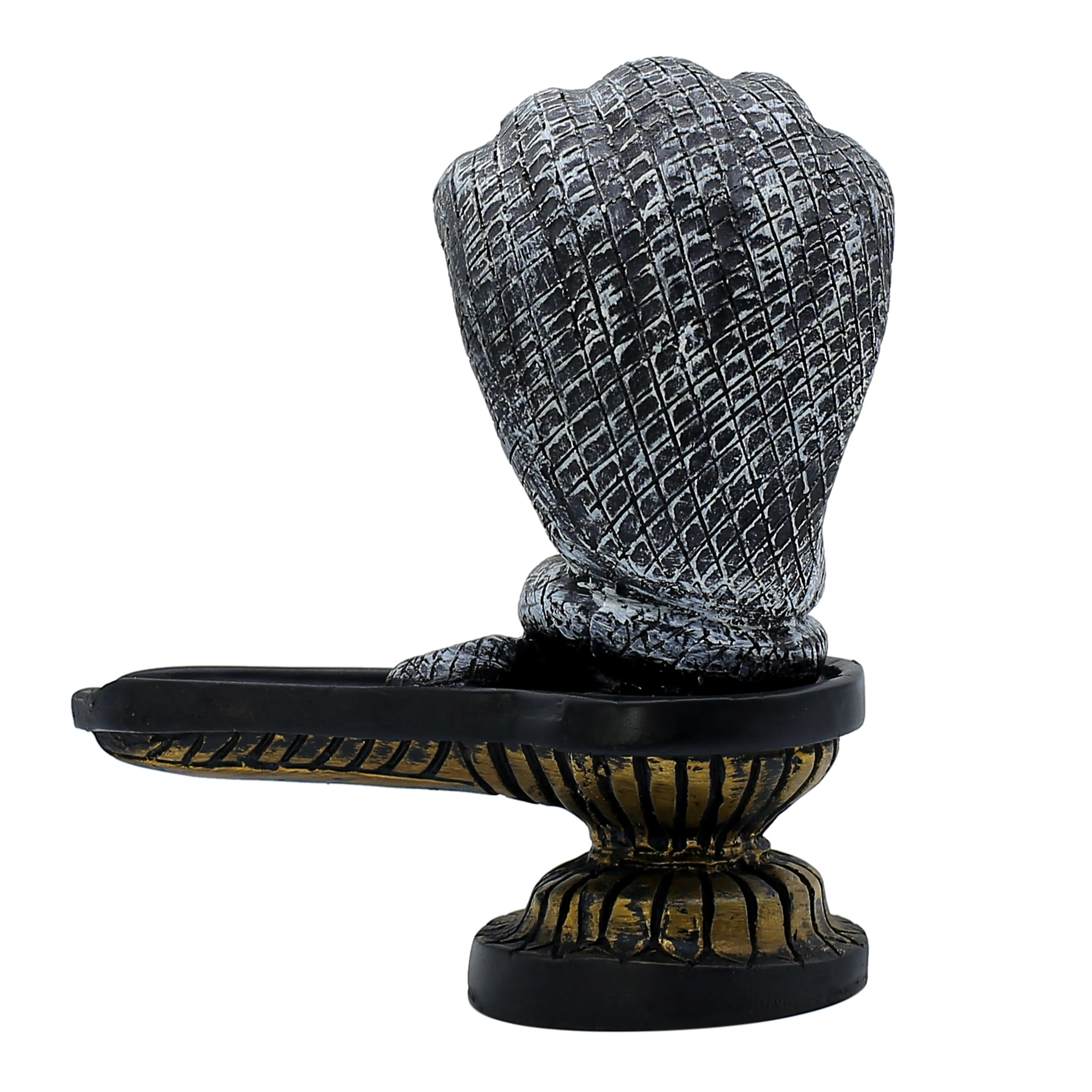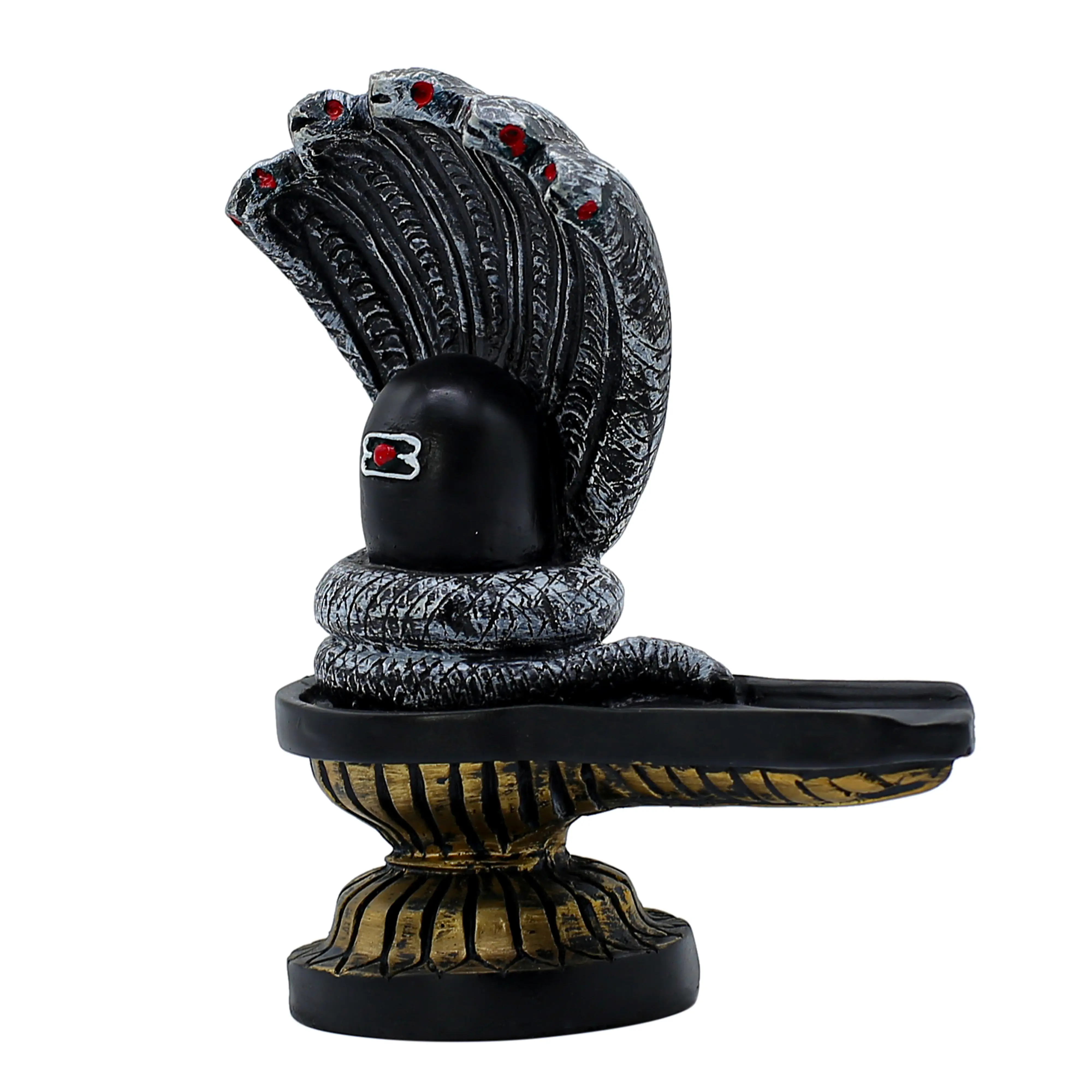 Masterful Design & Finish This figurine is not just a religious idol but a piece of art. It features a black Shivling that stands as the focal point, marked with the holy Tripundra and the 'Om' symbol, representing focus and meditation. The Sheshnag is sculpted with incredible attention to detail—each scale on its body is visible, finished in a metallic silver-grey that shimmers subtly under light. The hoods of the snake are accented with red dots, giving them a fierce yet protective gaze. The entire structure is supported by a golden pedestal base with a lotus-petal-inspired design, ensuring the idol sits flat and stable on any surface.