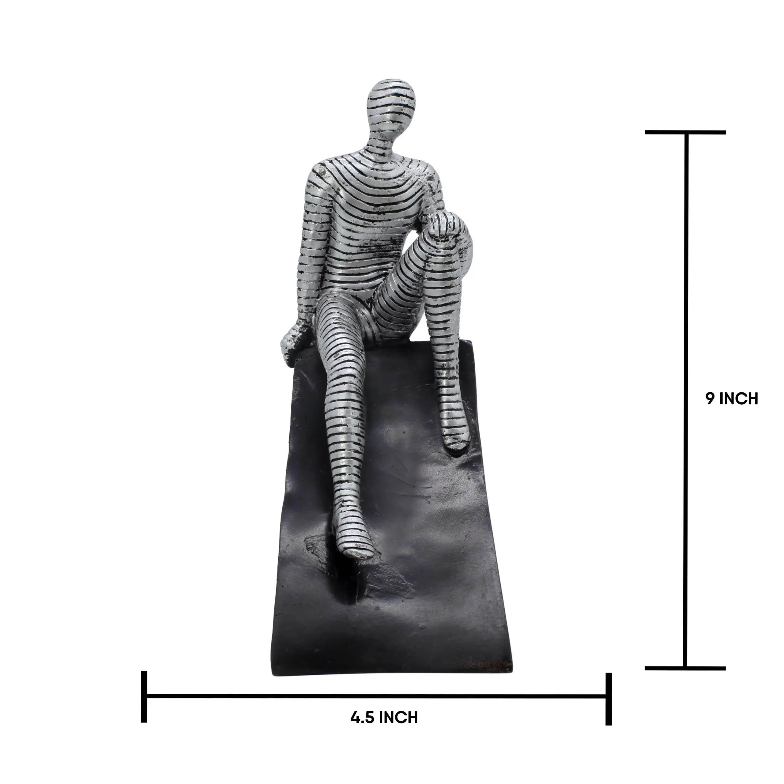 Distinctive Design & Finish The sculpture's defining feature is its surface. Instead of smooth skin, the figure is composed of stacked metallic strips, giving it the appearance of a futuristic being or a figure wrapped in silver ribbons. This texture creates a stunning visual effect as light hits the silver ridges and casts shadows in the dark grooves. The figure is posed casually, one knee raised, resting on a modern black wedge base that anchors the composition and provides a stark, elegant contrast.