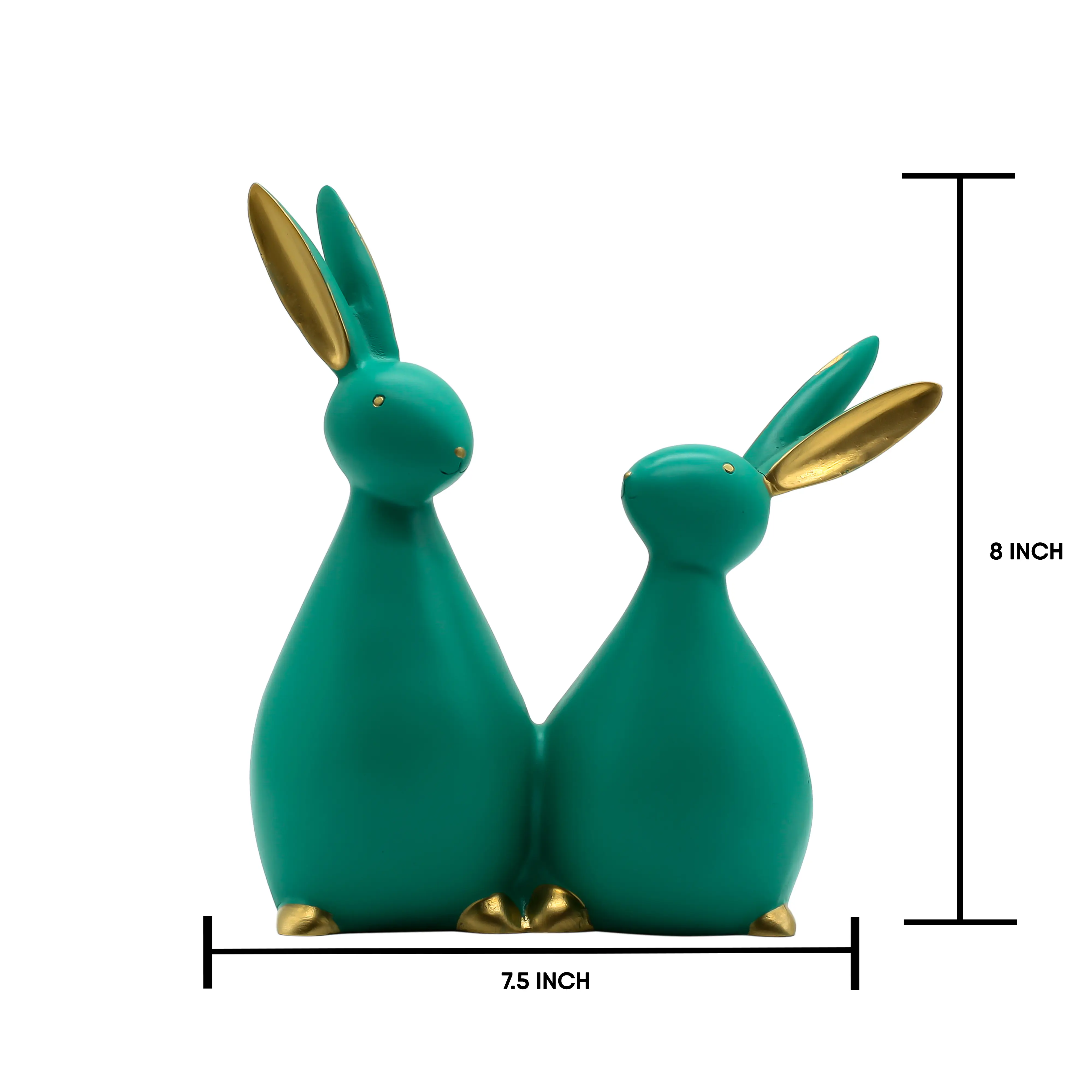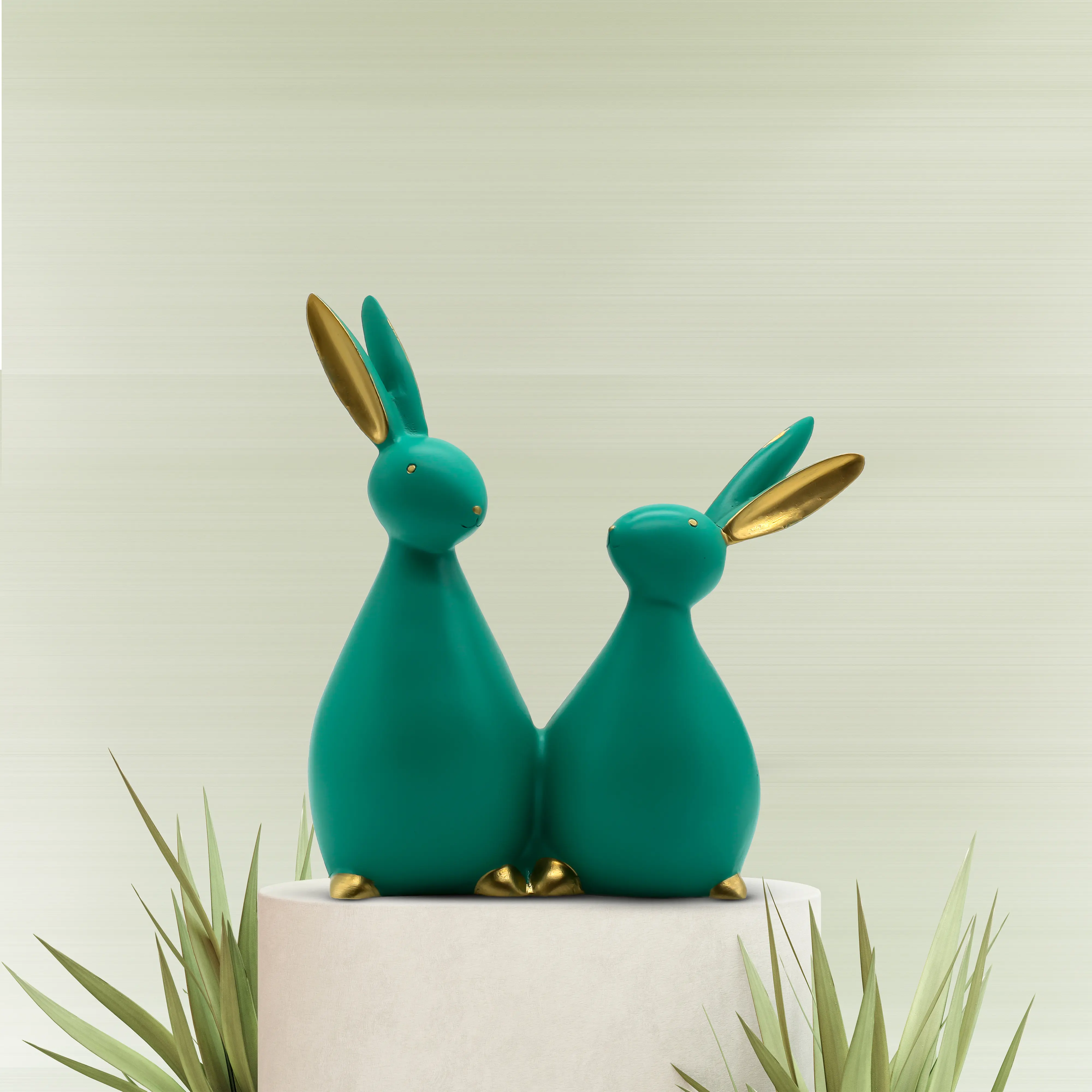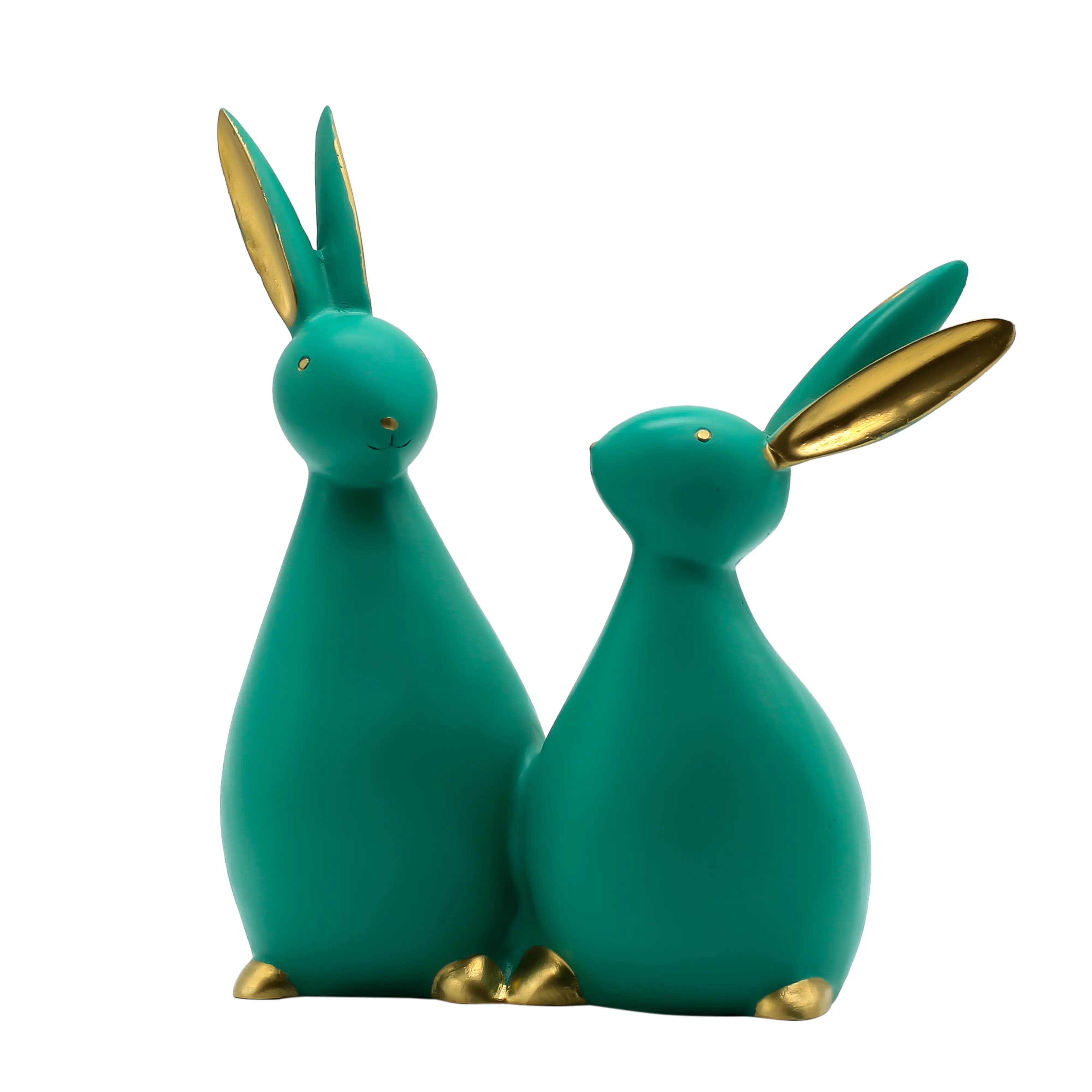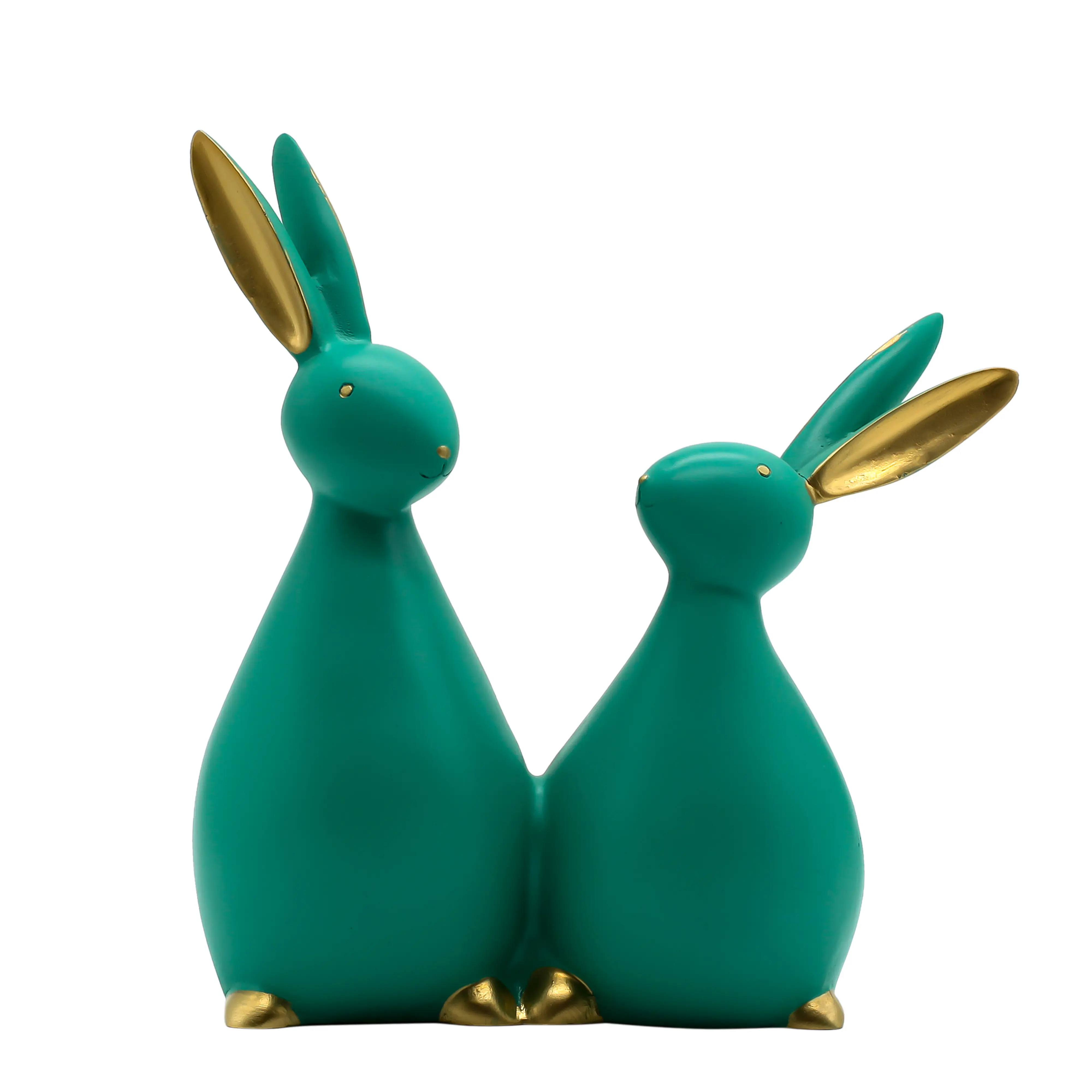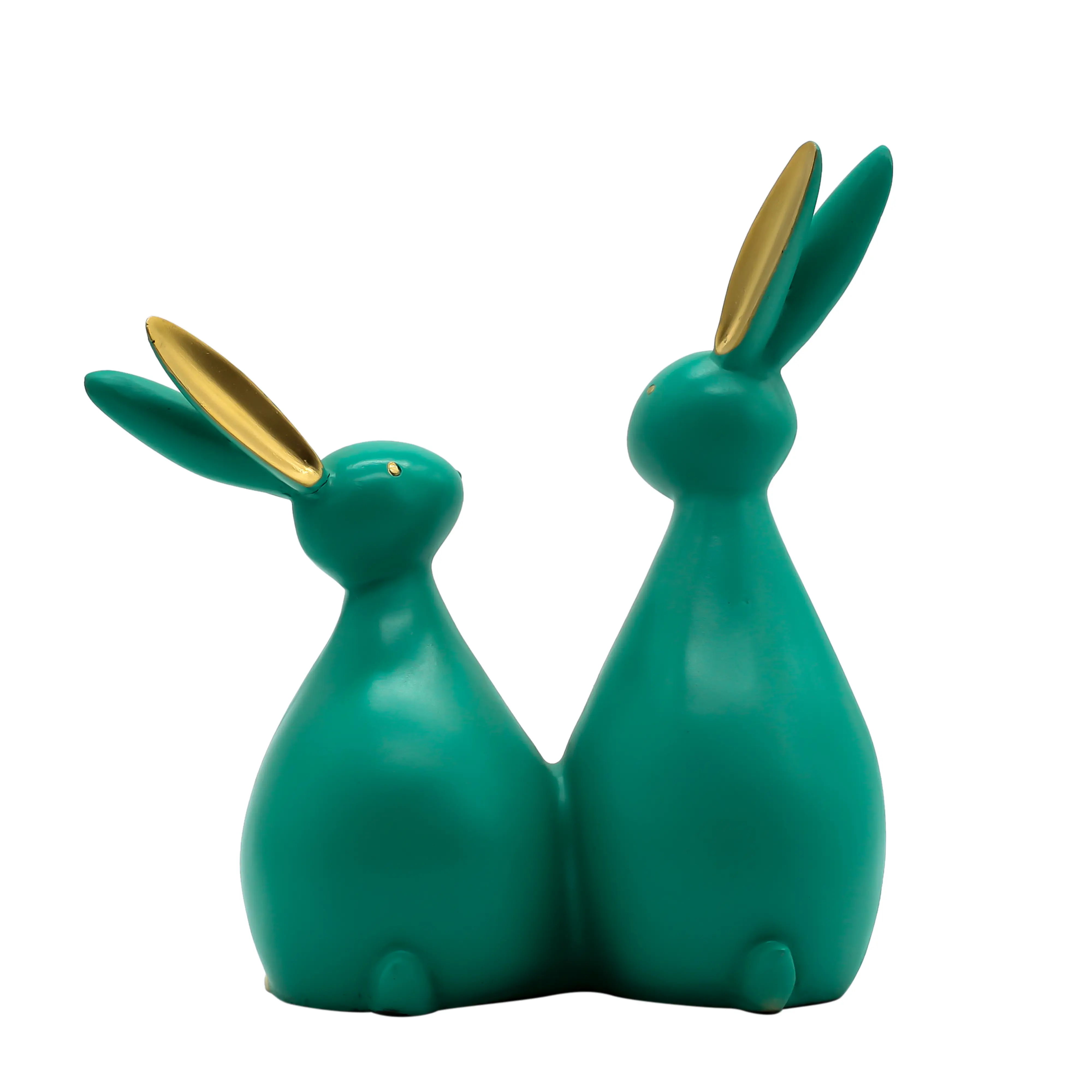 Design & Craftsmanship Gone are the days of boring, traditional figurines. This piece stands out with its abstract, smooth-lined silhouette. The rabbits are molded from high-quality polyresin, a material known for its ability to capture fine details and its lasting durability. The statue features a unique "matte teal" finish—a color that sits beautifully between calming blue and refreshing green. To elevate the look, the inner ears, eyes, and toes are hand-painted in a shimmering gold, creating a luxurious contrast that catches the light and draws the eye.