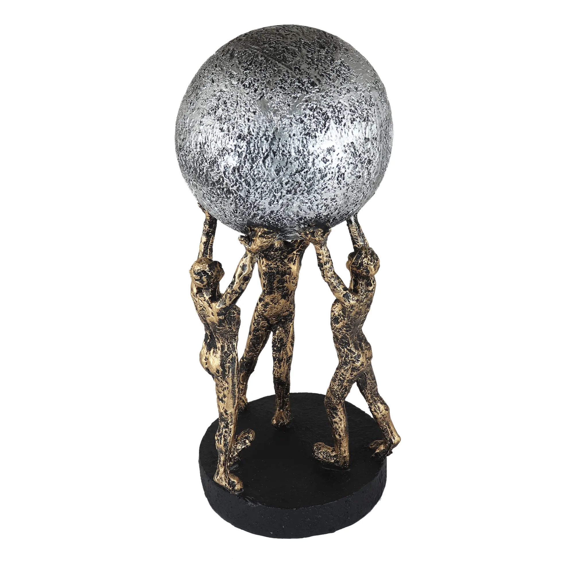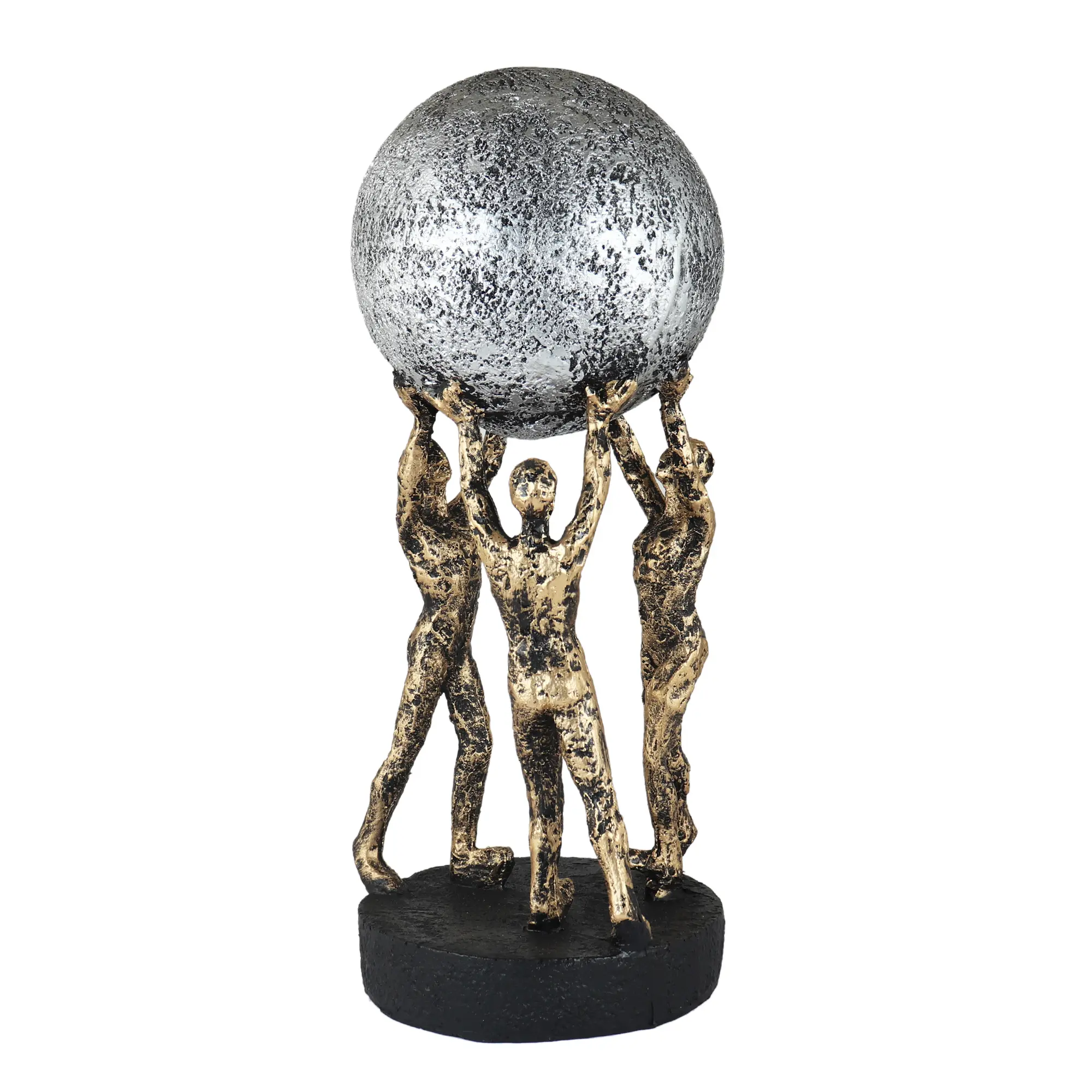 The Figures: The three figures are stylized and abstract, representing humanity rather than specific individuals. Their arms are raised in unison, demonstrating that balance and success require equal effort from all sides. The antique gold finish gives them a timeless, enduring quality.