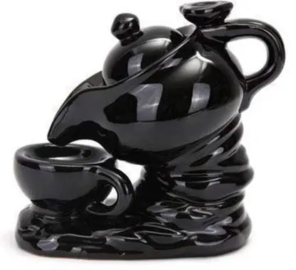 The Structure: The sculpture depicts a classic teapot suspended at an angle, perfectly positioned to pour into a small teacup resting on a unified base. The cone holder is discreetly integrated into the top of the teapot handle/lid area.