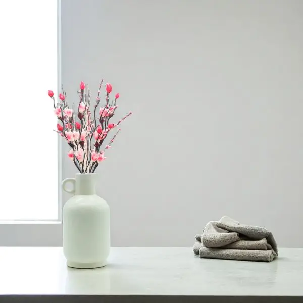 The Spa Look: As seen in the lifestyle image, placing this vase in a bathroom next to neatly folded towels creates an instant serene, spa-like atmosphere. The white-on-white aesthetic looks clean and hygienic.