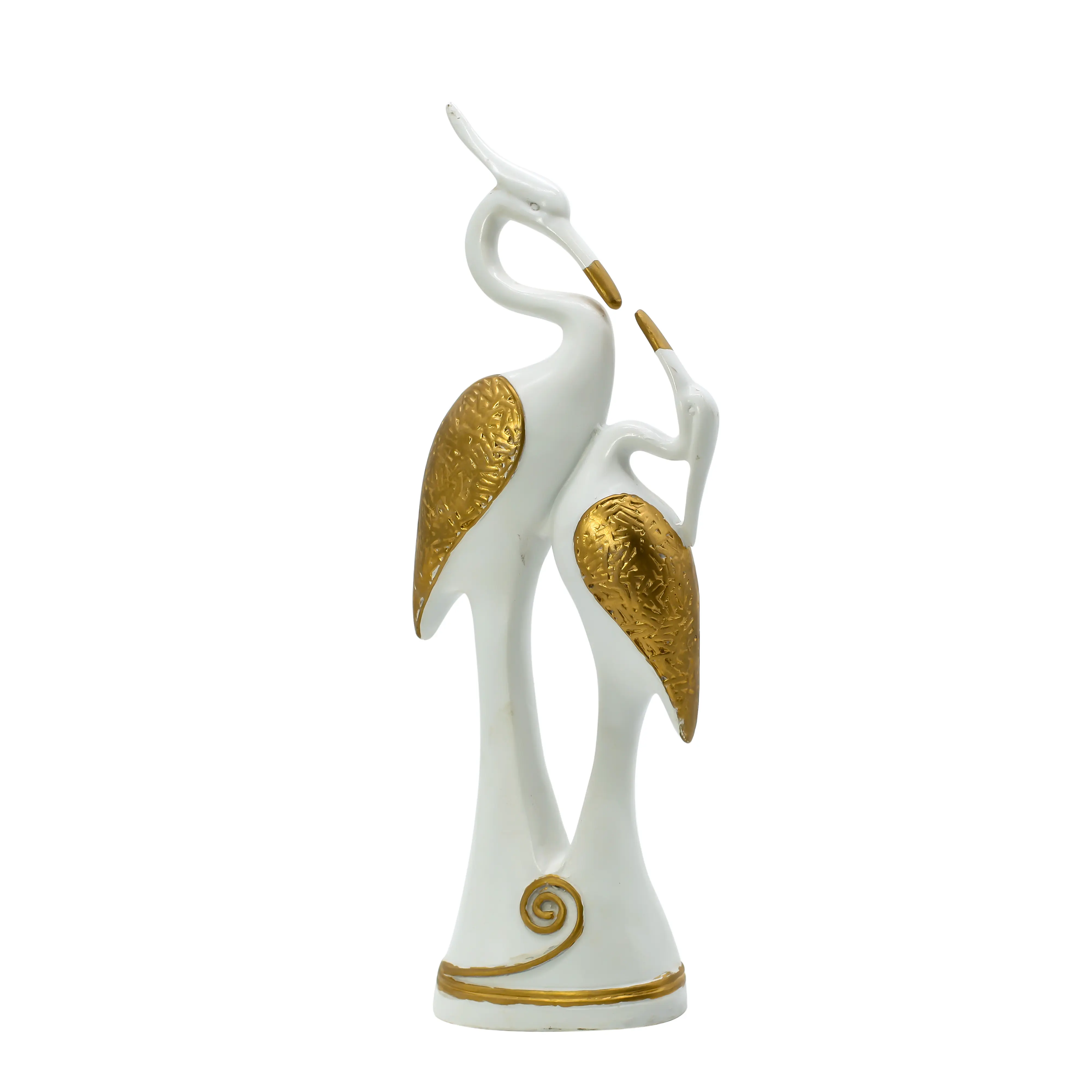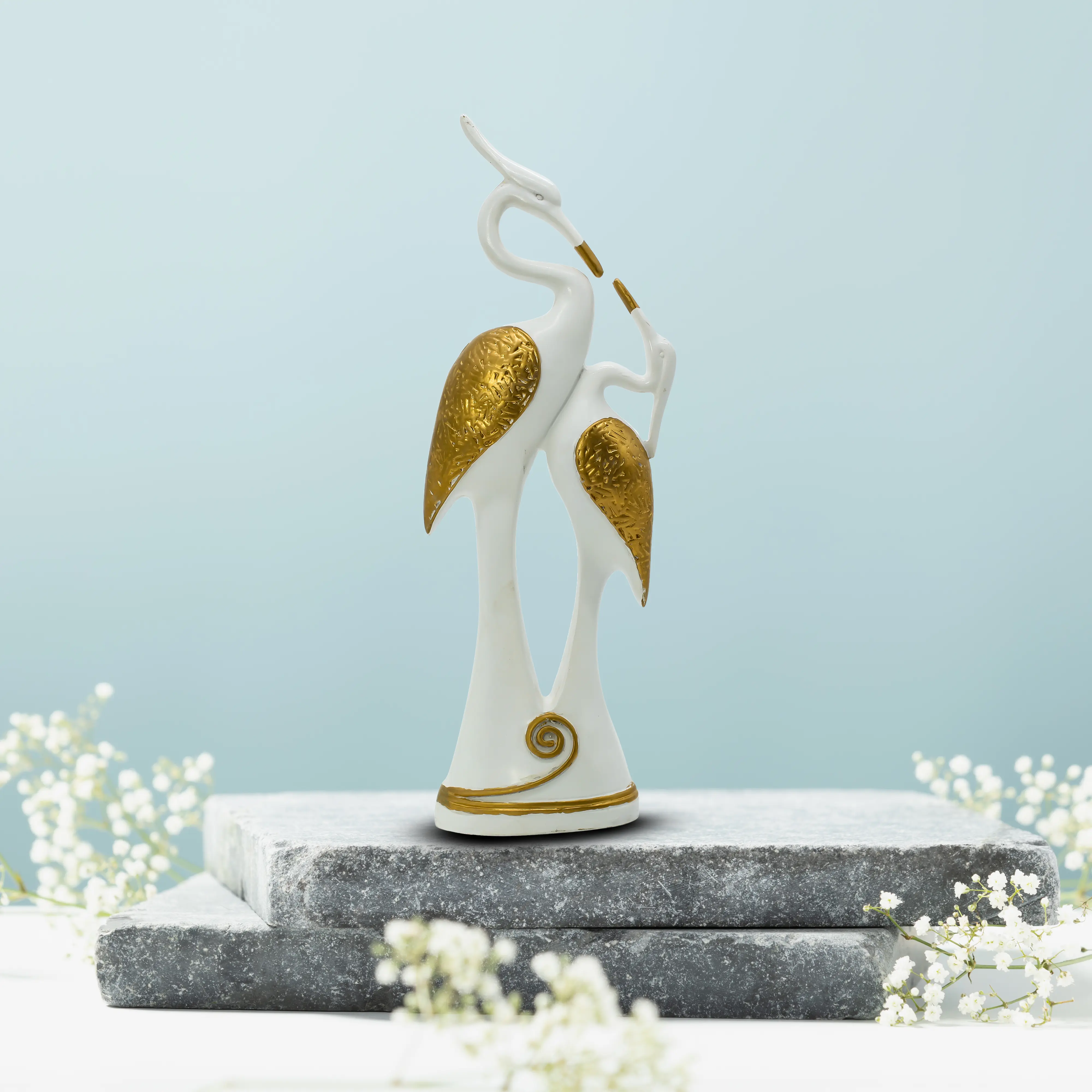 Add a touch of luxury and elegance to your space with this White & Gold Abstract Bird Couple Resin Showpiece. Featuring a modern artistic design, this décor piece beautifully represents love, harmony, and togetherness. Crafted from premium-quality resin, it showcases a smooth white finish highlighted with rich gold textured wings for a sophisticated look. Perfect for living rooms, bedrooms, offices, shelves, and console tables, this bird couple statue complements modern, minimalist, and luxury interiors effortlessly. Its tall sculptural form makes it an eye-catching centerpiece while maintaining subtle elegance. Ideal for gifting on weddings, anniversaries, housewarmings, festivals, or corporate occasions, this showpiece reflects refined taste and artistic craftsmanship. Durable, easy to maintain, and timeless in appeal, it is a must-have décor accent for stylish homes.