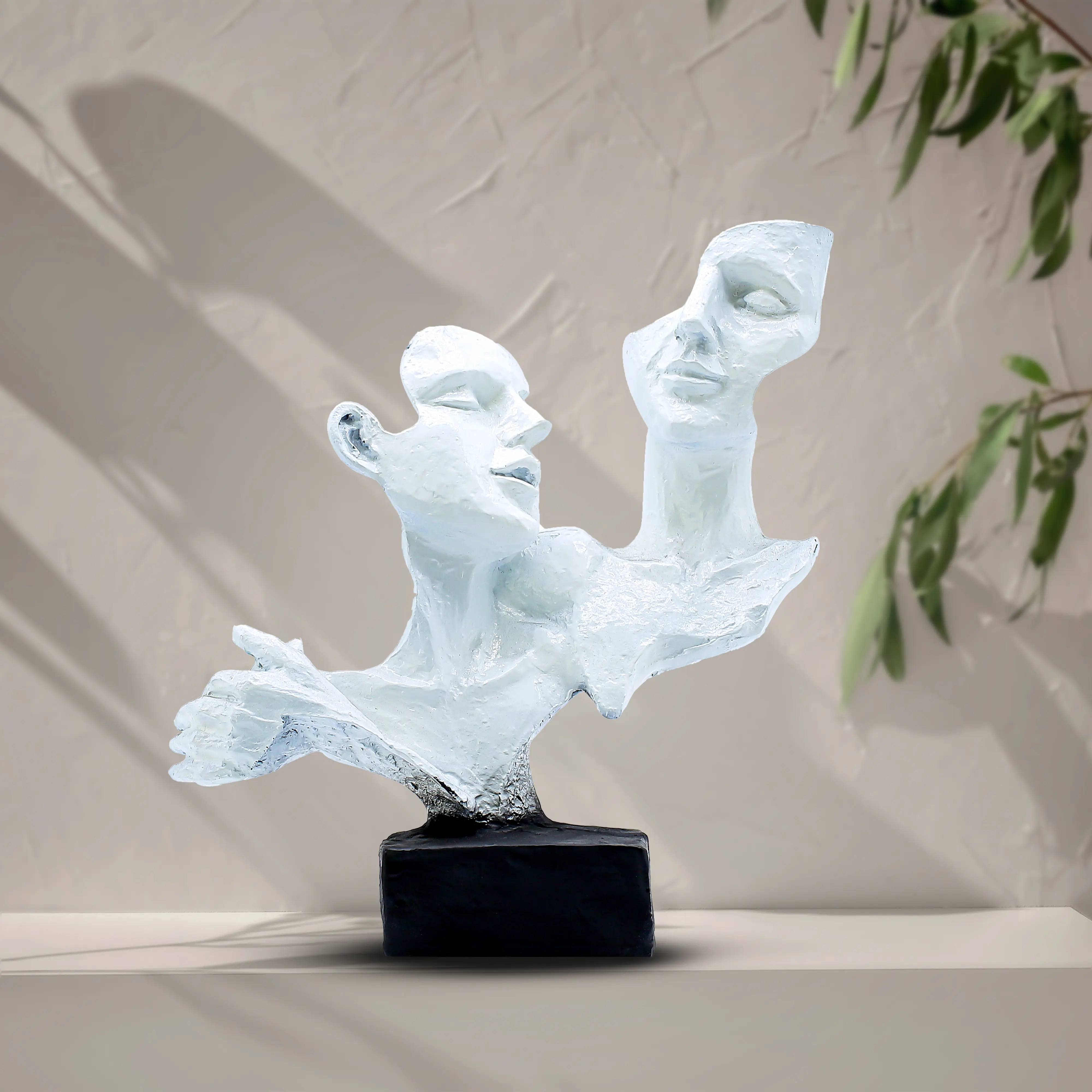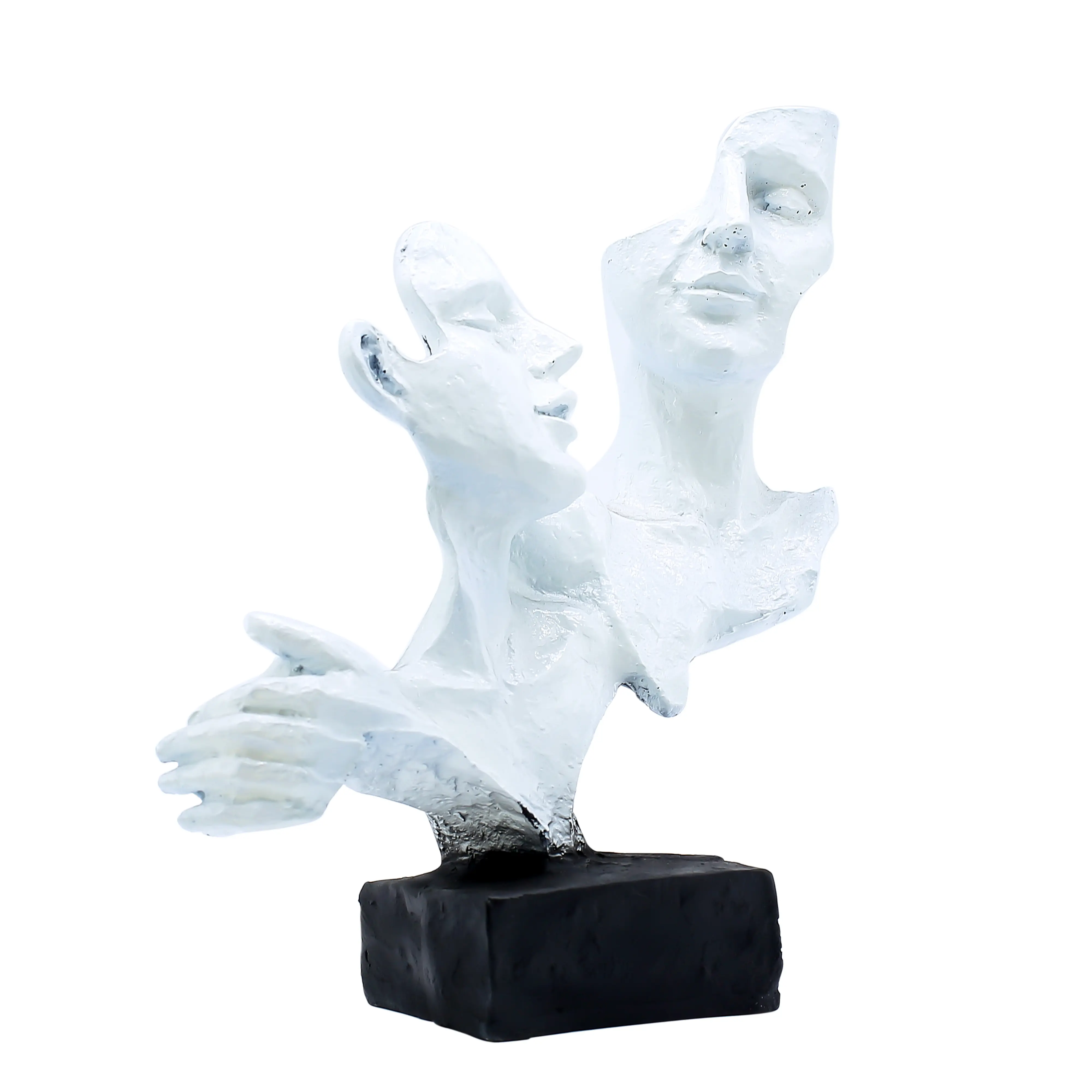 Transform your home or office into a space of inspiration with the Modern Abstract Couple Face Sculpture. Unlike traditional figurines that depict realistic scenes, this piece embraces the beauty of abstraction. It features two human visages—one slightly lower and looking forward, the other positioned higher and merging with the first—creating a silhouette that is both mysterious and captivating. This design invites viewers to interpret its meaning, whether it be a couple in harmony, a split personality, or the merging of past and future. Sophisticated Material & Finish Crafted from robust polyresin, this statue is designed to stand the test of time. The finish is particularly noteworthy; instead of a glossy shine, it features a matte, textured white surface. This deliberate design choice mimics the raw, organic feel of plaster or limestone sculptures found in art museums. The rough texture catches the light beautifully, adding depth and dimension to the facial features. The sculpture is anchored by a solid black block base, which not only ensures stability but also elevates the white figure, making it pop against any background color. Versatile Styling for Any Room This abstract face statue is incredibly versatile. In a corporate office or home study, it serves as a symbol of creativity and forward-thinking. In a living room, it complements modern furniture, monochrome color schemes, and industrial-style decor. It is also an excellent prop for shelf styling, looking sophisticated when placed next to hardcover books, succulents, or candles. The Perfect Gift for Art Lovers Struggling to find a gift for someone who "has everything"? This sculpture is a fantastic solution. It is unique, artistic, and gender-neutral, making it suitable for men and women alike. It is a popular choice for housewarming gifts, birthday presents for creative friends, or as a sophisticated token of appreciation for a colleague or boss. Maintenance Despite its textured look, the statue is easy to care for. A soft brush or dry cloth is all that is needed to keep dust away, ensuring your art piece remains pristine.