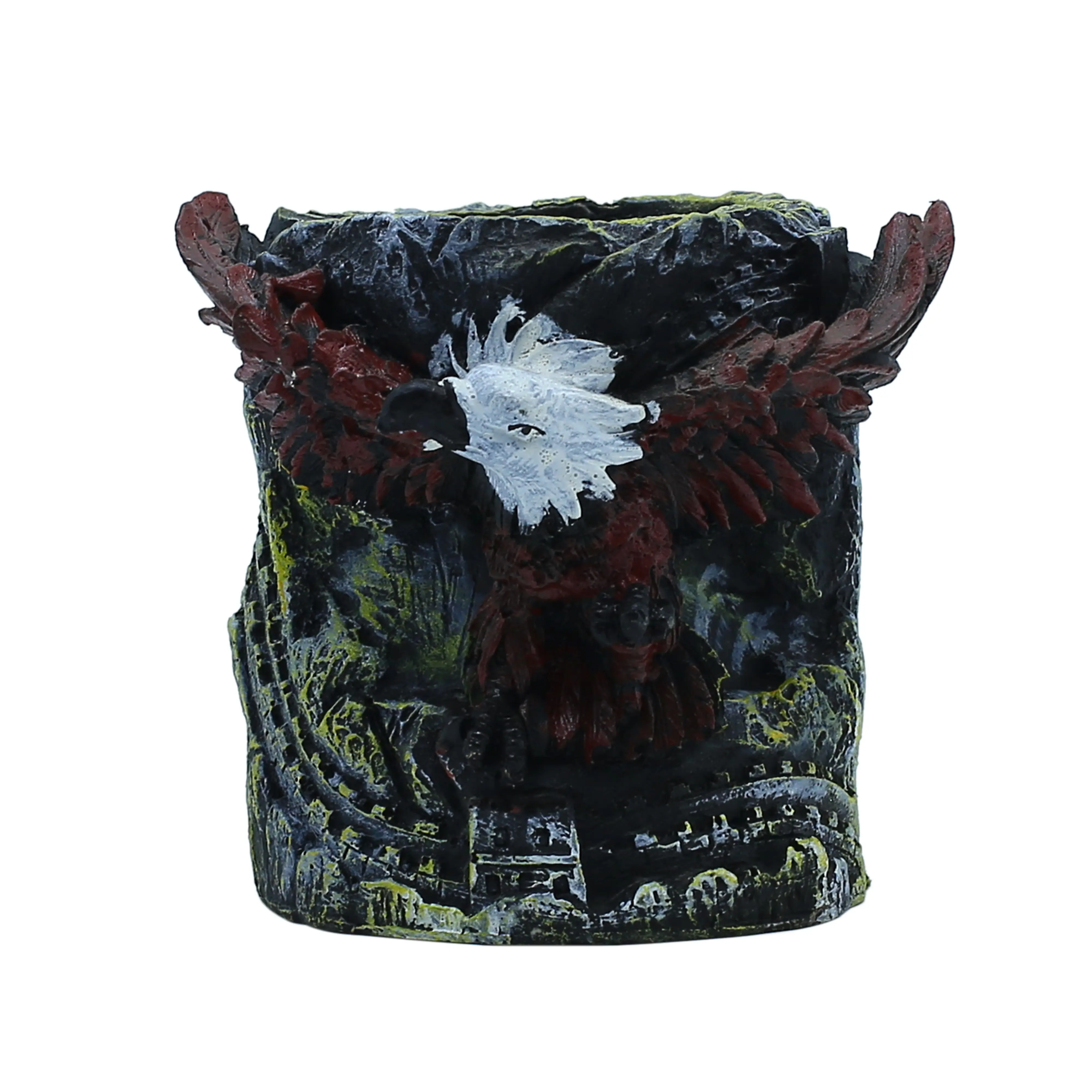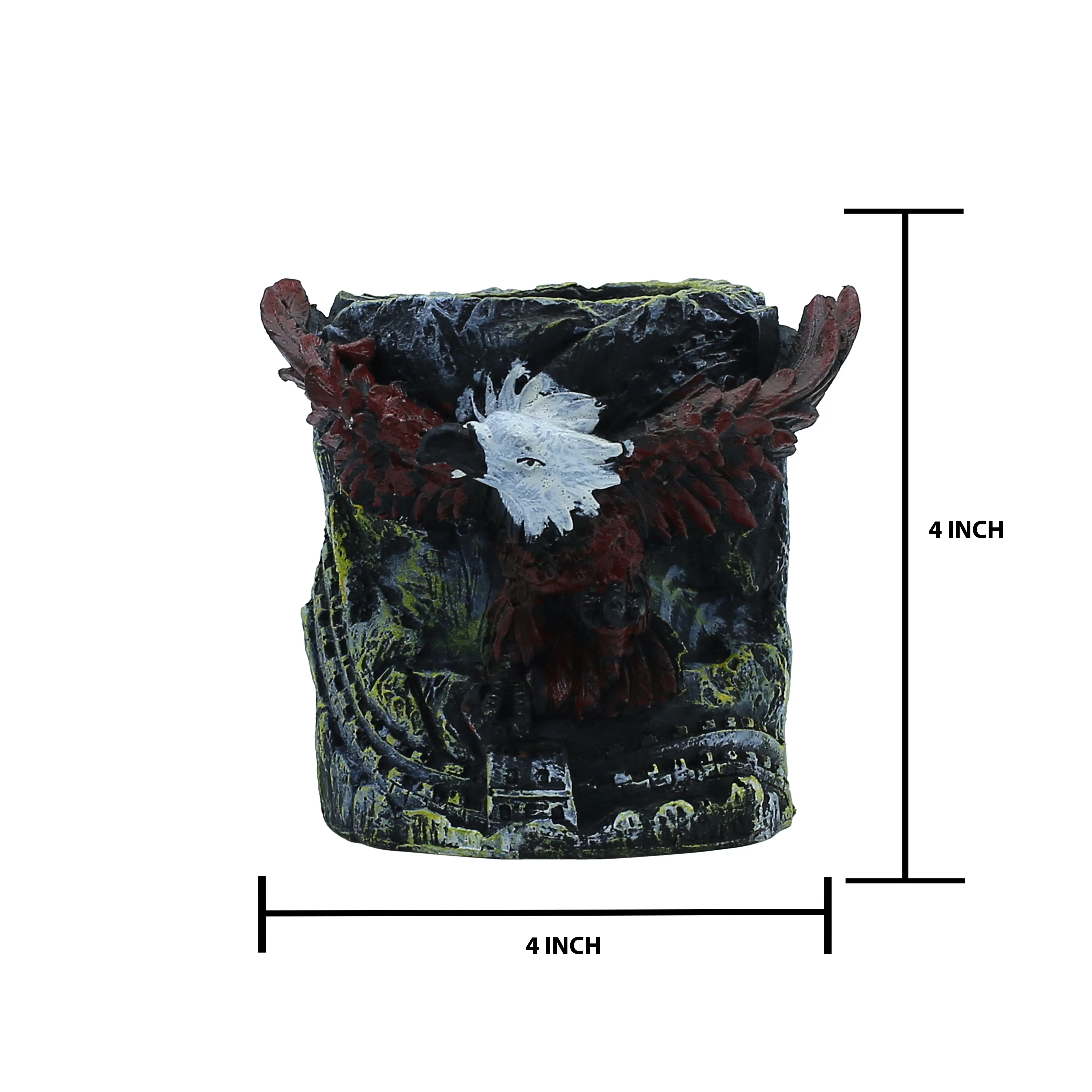 The Soaring Eagle: Representing freedom and sharp vision, this design features an eagle in high relief. The bird, with its classic white head and expansive wings, is perched above what appears to be an ancient stone fortification or mountain range. The dark, rocky background contrasts beautifully with the bird's detailed plumage.