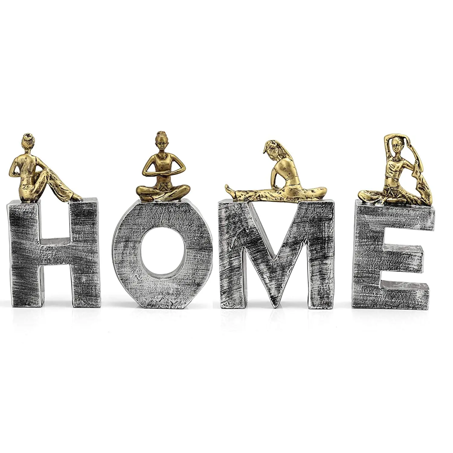 Create a welcoming and peaceful atmosphere in your living space with our Polyresin HOME Letters with Yoga Figurines. This unique decor set reimagines the classic "HOME" sign by integrating elements of mindfulness and physical grace. The set consists of four separate letter blocks—H, O, M, E—finished in a stylish antique silver texture that mimics weathered metal. Perched atop each letter is a beautifully sculpted golden yoga lady, each captured in a different pose of meditation or stretching. The contrast between the cool silver base and the warm gold figures adds a touch of modern luxury to any room. Whether arranged together on a shelf or spread out across a console table, this showpiece serves as a gentle reminder to breathe, relax, and find comfort in your own home. It is an ideal gift for yoga lovers or new homeowners.