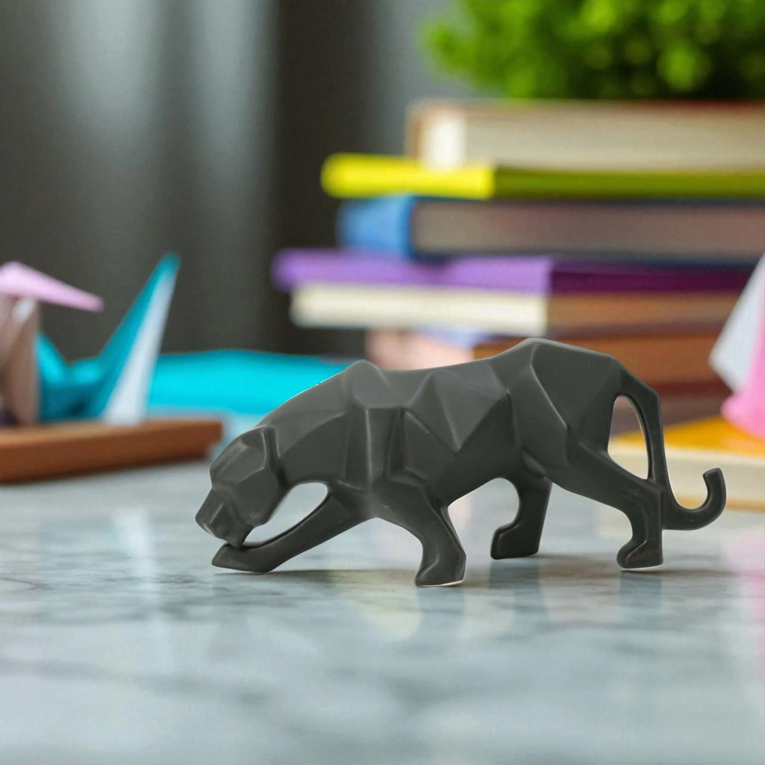 Add a subtle touch of power and elegance to your space with our Small Black Geometric Ceramic Panther Figurine. While compact in size, this statue makes a big impact with its striking design. It features a wild panther (or jaguar) in a low, intense stalking pose, ready to pounce. Unlike traditional realistic statues, this piece uses a modern geometric/origami style, where the animal's muscular form is defined by sharp, faceted angles. Crafted from 100% solid ceramic with a sleek matte black glaze, it feels substantial and looks high-end. It is the perfect size to perch on a stack of books, sit on a computer monitor stand, or hide among the leaves of your house plants, bringing a sophisticated "jungle" vibe to your modern home or office.