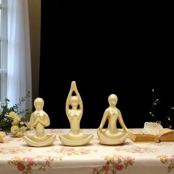 Bring a sense of calm and luxury to your daily routine with our Set of 3 Golden Ceramic Yoga Figurines. This curated trio celebrates the art of mindfulness through three distinct, fluid poses. Expertly molded from premium ceramic, each figure is coated in a stunning metallic gold finish that instantly elevates your decor. The set features three variations: one in a grounding prayer pose (Namaste), one stretching upwards to welcome energy, and one seated in deep meditation. Their smooth, abstract design removes distraction, allowing them to serve as pure symbols of peace and balance. Whether displayed on a floating shelf, a fireplace mantel, or next to your yoga mat, these golden sculptures remind you to breathe, stretch, and find your center amidst the chaos of daily life.