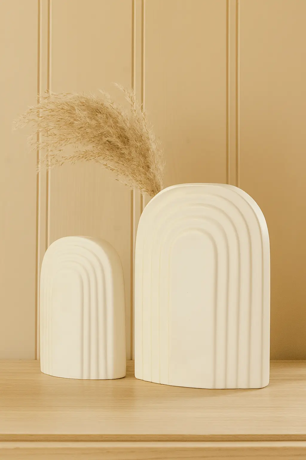 Bring a sense of calm and cohesion to your home with our Set of 2 Matte Cream Ceramic Vases. This beautiful pair is designed to effortlessly elevate your interior styling with the popular "Japandi" aesthetic. The set features a tall, sleek bottle vase for height and drama, paired with a cute, ribbed pumpkin-shaped pot for texture and grounding. Crafted from durable ceramic with a velvety matte cream finish, these vases exude a warm, organic feel that glossy vases simply can't match. They are the ultimate styling accessories for coffee tables, sideboards, or bedside tables. Whether you fill the tall vase with trendy pampas grass to add softness or display them empty as sculptural objects, this duo promises to transform any corner into a serene, magazine-worthy vignette.