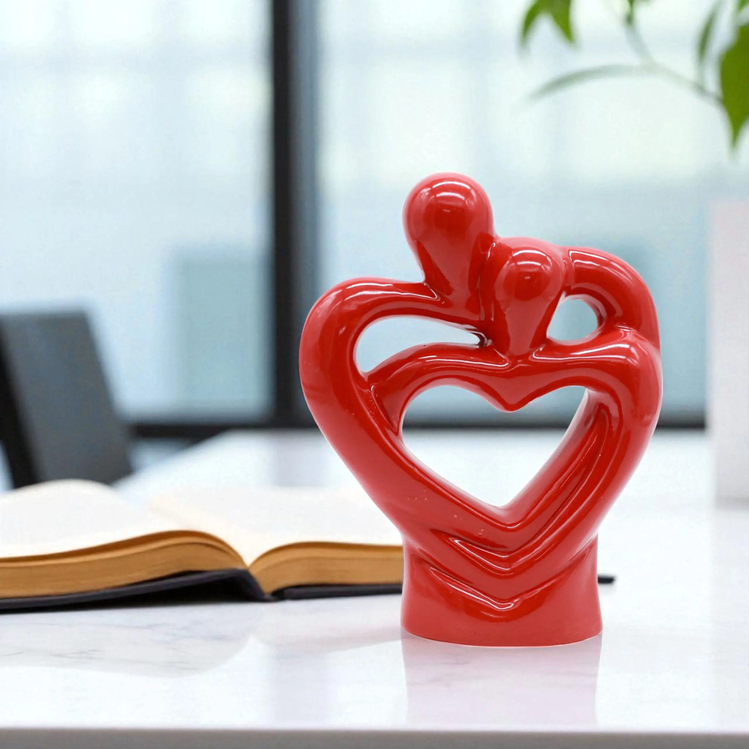 Ignite the romance in your living space with our Glossy Red Ceramic Abstract Couple Statue. This captivating piece of modern art beautifully captures the essence of togetherness. Crafted from durable, high-quality ceramic, it features two stylized figures merging into one another to form a perfect heart shape at the center. Finished in a passionate, deep red glaze, this sculpture radiates warmth and love. Its smooth, glossy surface reflects light, making it a stunning focal point on a nightstand, bookshelf, or coffee table. Whether you are looking to enhance the romantic ambiance of your bedroom or searching for a meaningful gift that speaks louder than words, this heart-shaped couple statue is a timeless expression of devotion.