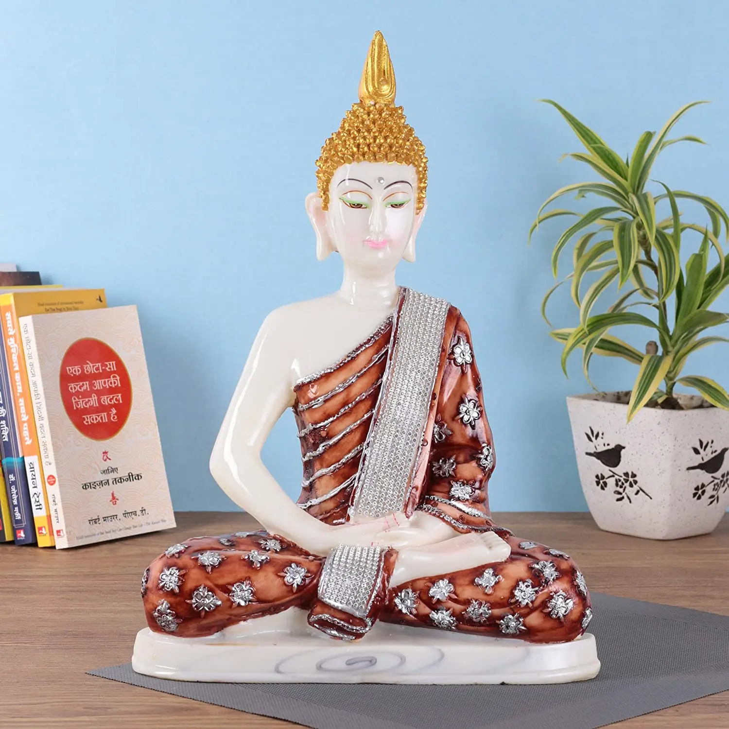 Premium Polyresin Meditating Buddha Statue – White & Brown Thai Buddha Idol with Silver Embellishments for Home Decor, Living Room & Gifts ₹ 1 ₹ 399