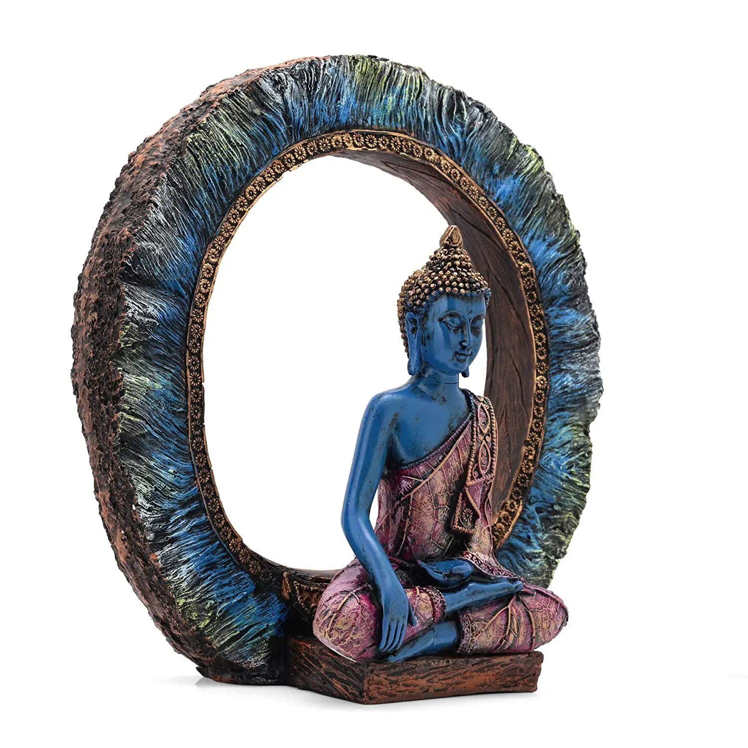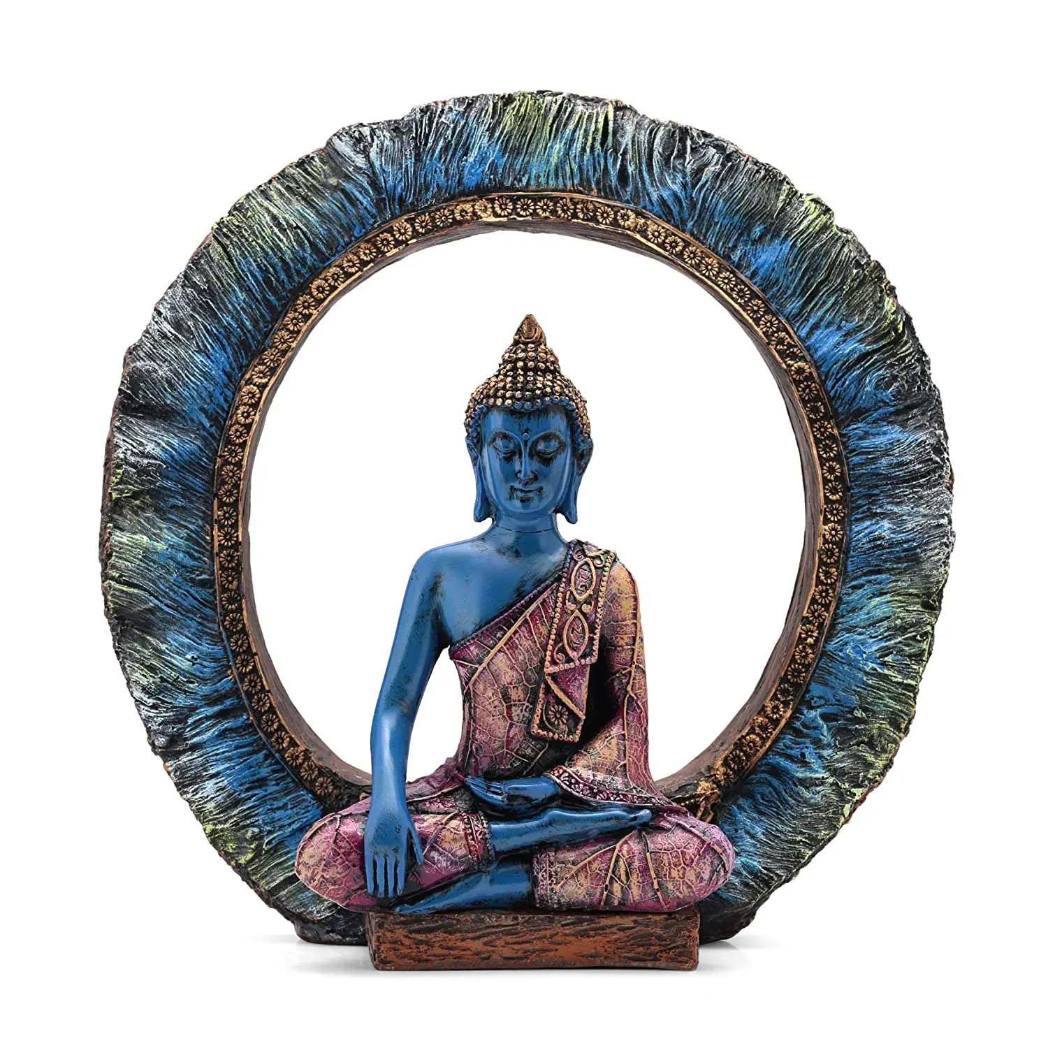 Infuse your home with vibrant energy and profound peace with our Blue Polyresin Meditating Buddha Statue. This handcrafted masterpiece creates an immediate visual impact with its unique color palette. The Buddha is depicted with soothing blue skin, symbolizing healing and infinite wisdom, and is seated in the Bhumisparsha Mudra, calling upon the earth to witness his enlightenment. Framing the deity is a spectacular textured ring, hand-painted with strokes of teal, black, and gold, resembling a celestial aura or an artistic abstract halo. The Buddha's robe is equally detailed, featuring intricate gold patterns over a warm pinkish-purple base, offering a stunning contrast to the cool blue tones. Whether you place it in your entryway to greet guests or in your meditation corner for focus, this statue is not just decor—it is a vessel of tranquility. Durable and easy to clean, it is a perfect blend of modern art and traditional spirituality.
