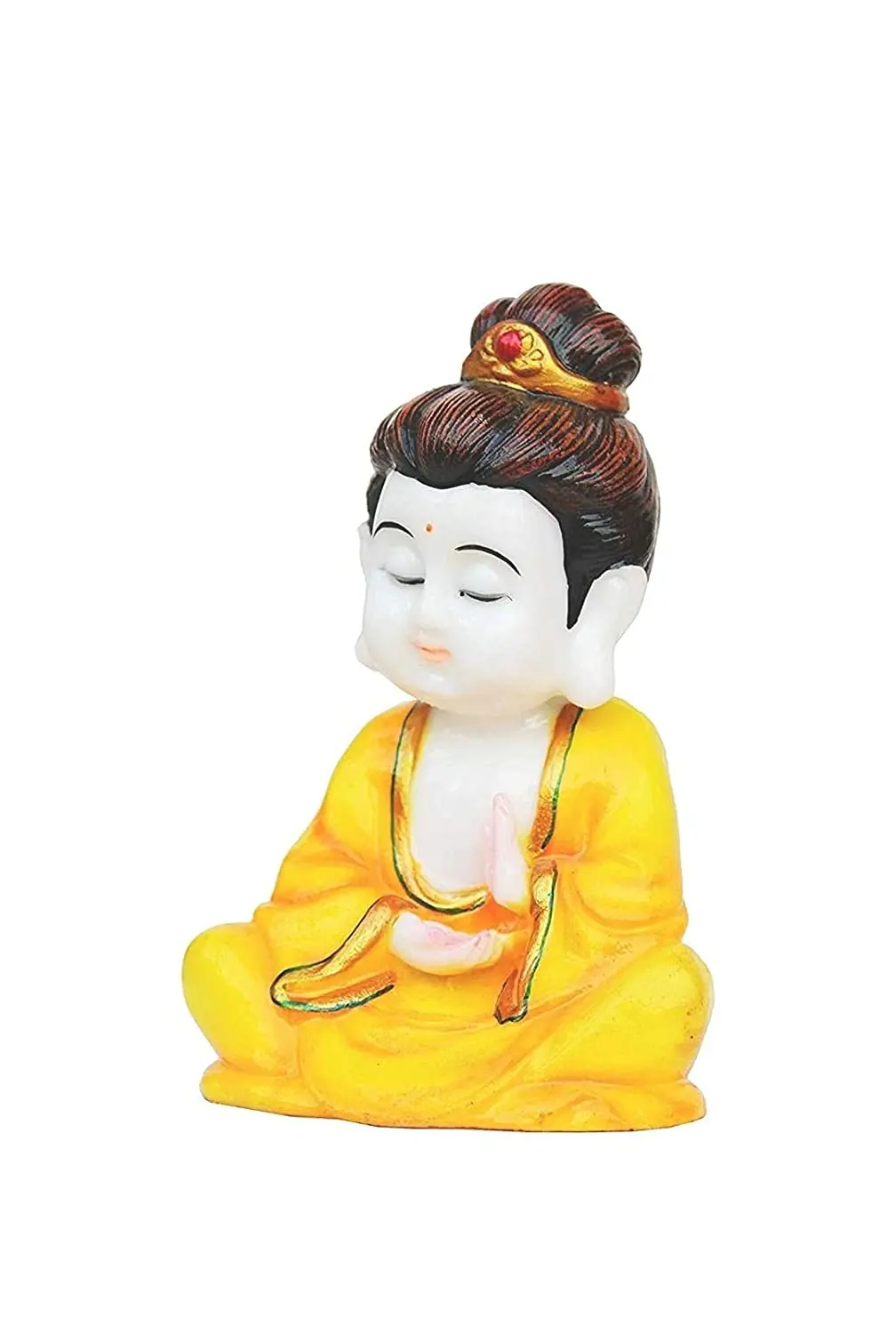 Infuse your surroundings with innocence and tranquility with this Cute Thinking Baby Buddha Statue. This delightful figurine captures a young monk in a moment of deep, peaceful contemplation, resting his head on his hand. The charming design features a serene white face and body, draped in a vibrant Yellow Robe which is traditionally associated with grounding and humility in Buddhist culture. The statue is adorned with beautiful details, including golden curly hair and a sparkling gem accent on the robe, making it look premium and precious. Crafted from durable polyresin, it is perfectly sized to sit on your car dashboard, office desk, or living room shelf. Whether you use it to bring a smile to your face during traffic or to add a touch of Zen to your workspace, this little monk is a bundle of joy and positive vibes.