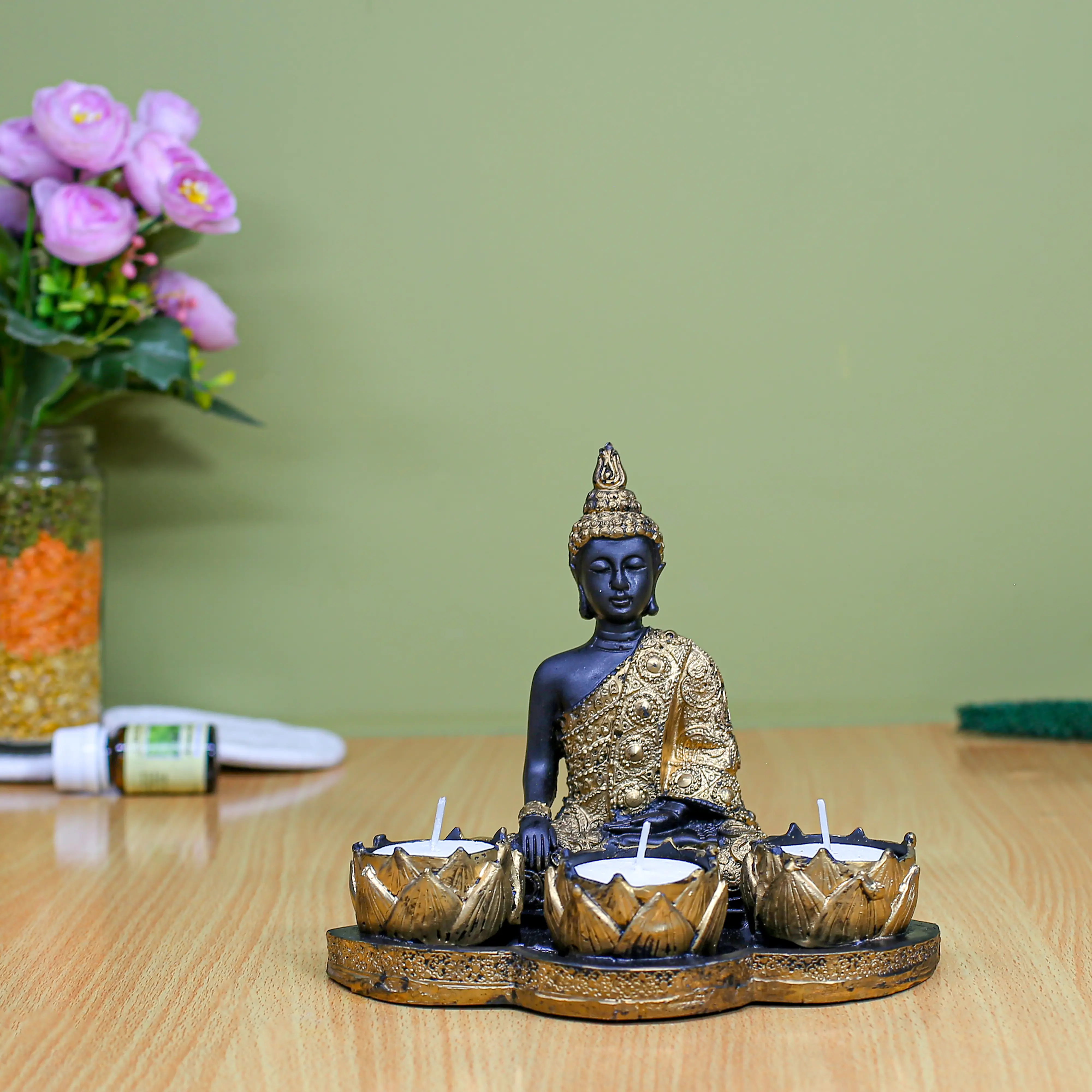 Black & Gold Buddha Statue with 3 Lotus Tea Light Candle Holders – Resin Zen Monk Figurine Centerpiece for Home Decor, Aromatherapy & Meditation | Spiritual Gift for Diwali & Spa ₹ 1 ₹ 499