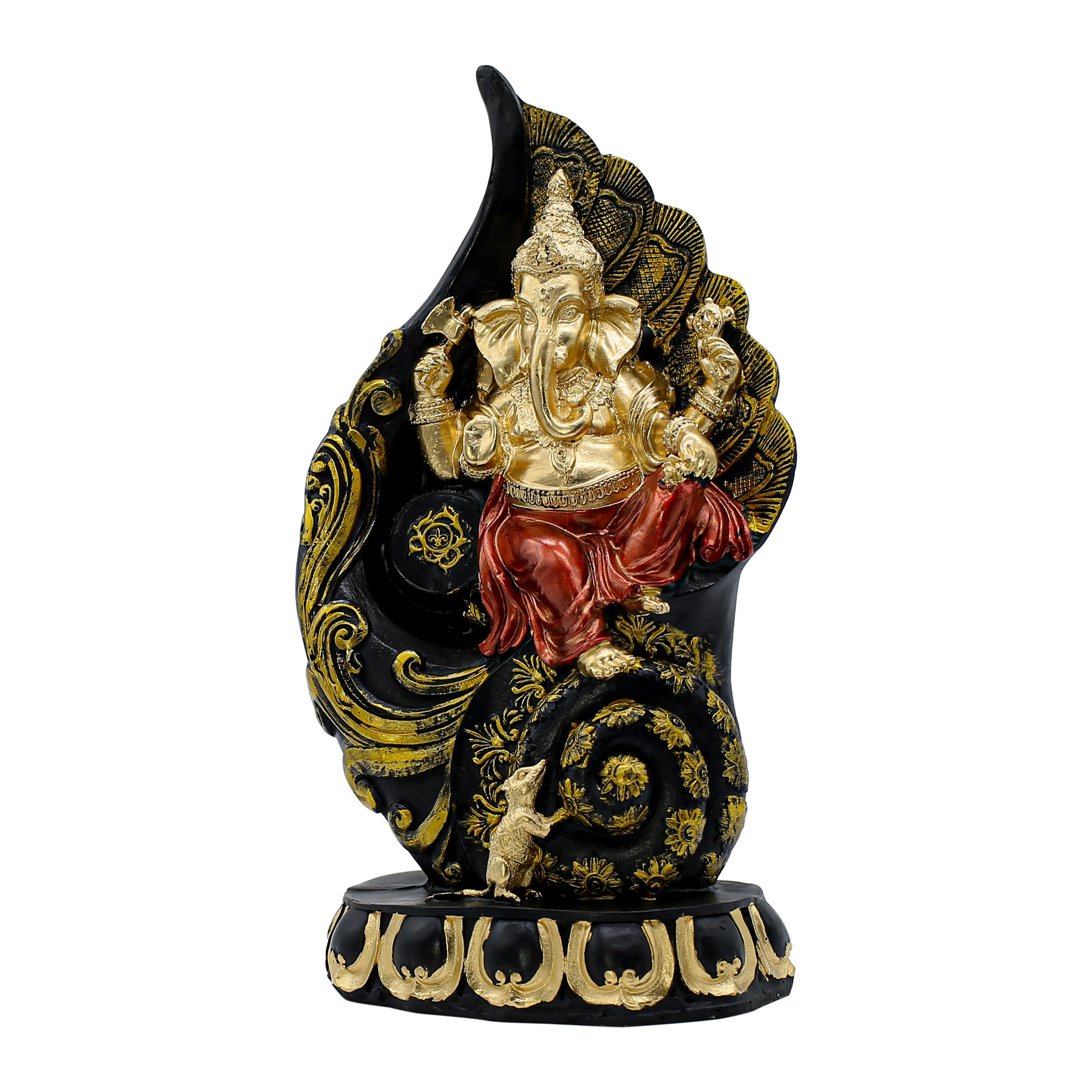 Add a touch of playful divinity and traditional grandeur to your home with this stunning Resin Ganesha on Swing Statue. This unique idol captures Lord Ganpati in a joyous mood, seated on a swing suspended from an elaborate archway. Crafted from durable, high-quality polyresin, this statue is designed to last. It features a magnificent antique gold finish that gives it the timeless appeal of aged metal, highlighted with subtle touches of red and green on the decorative arch. The intricate detailing of the chains, the floral motifs on the Prabhavali, and Ganesha’s ornaments are all exquisitely rendered in resin. This idol is not just a religious symbol but a piece of art that brings a sense of celebration and divine presence to any space, making it an ideal choice for your prayer room or as a cherished gift.