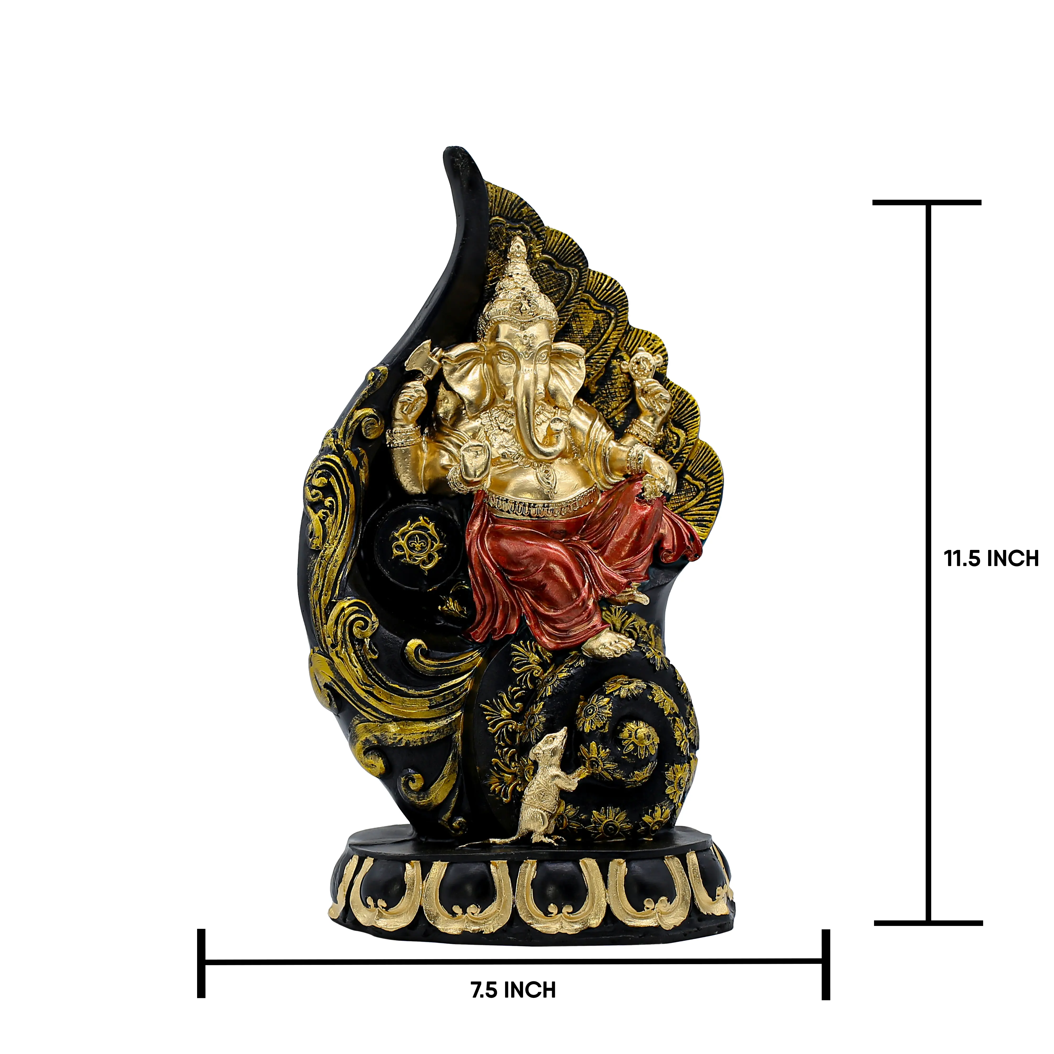 Invite serenity and divine elegance into your living space with this stunning Antique Gold Resin Ganesha Statue. Unlike traditional poses, this unique idol depicts the beloved Lord Ganesha playing a melodious tune on the flute (bansuri), standing gracefully beside a peacock. This artistic fusion blends the wisdom of Ganesha with the playful charm associated with Lord Krishna. Expertly crafted from high-grade resin, the statue boasts a rich, antique gold finish with intricate dark detailing that highlights the jewelry, the folds of the dhoti, and the texture of the peacock’s feathers. It serves not just as a religious idol but as a sophisticated piece of home decor. Whether placed in your pooja room, on a living room console, or an office desk, this Bansuri Ganesha attracts positive energy and serves as a constant reminder of joy and prosperity. It is a perfect spiritual gift for loved ones.