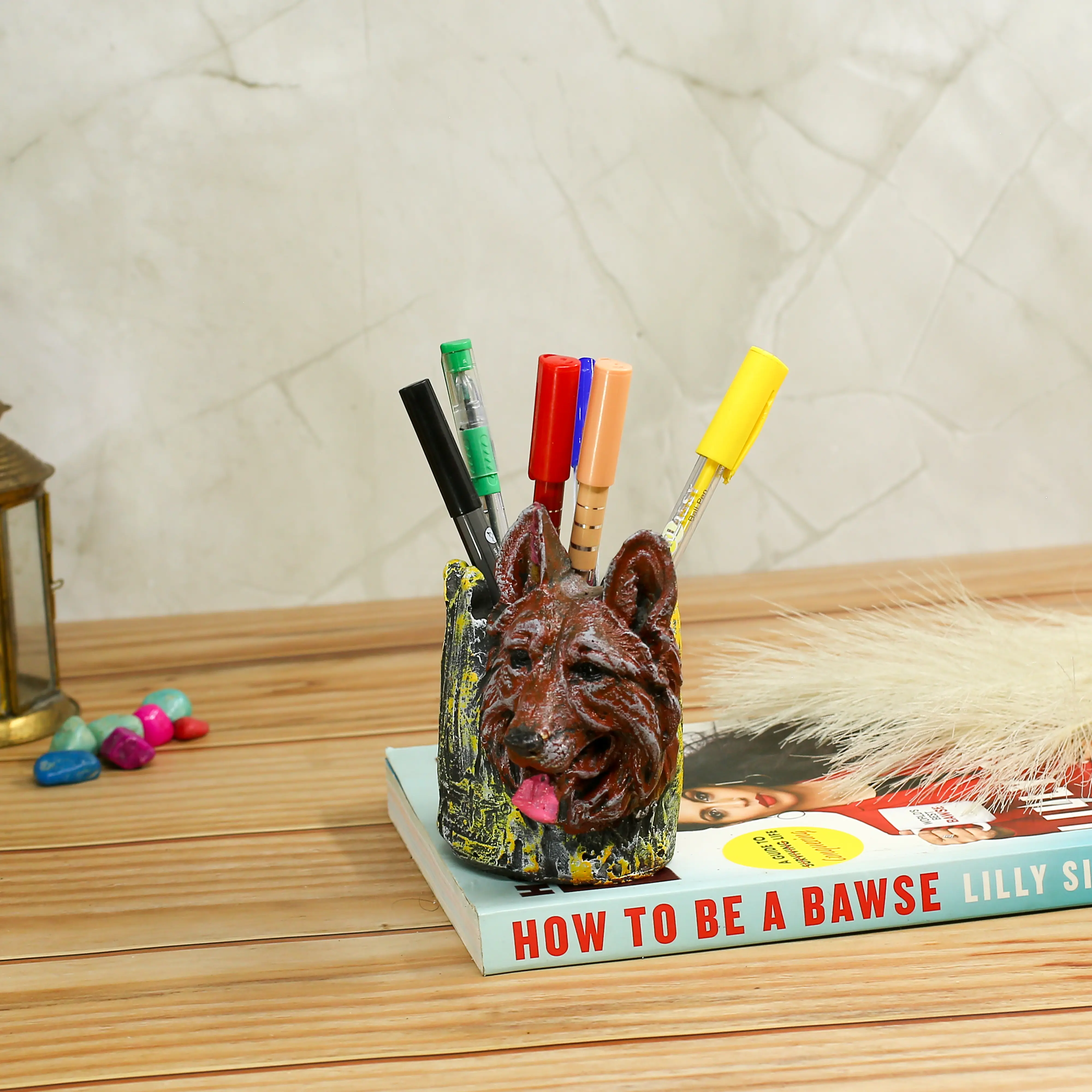 Add a touch of canine loyalty to your workspace with this adorable German Shepherd Pen Holder and Planter. Designed for dog lovers and decor enthusiasts alike, this piece is more than just a statue—it is a functional work of art. The sculpture features a happy German Shepherd with its tongue out, leaning against a rustic tree stump which serves as the container utility. Whether you want to organize your pens, pencils, and markers, or you want to bring some greenery inside by planting a small succulent or cactus, this versatile holder does it all. Made from high-grade polyresin, it boasts intricate detailing—from the fur texture to the realistic coloring—making it look almost alive. It fits perfectly on office desks, bedside tables, or living room shelves. It is the ultimate fusion of utility and aesthetics, making it a heartwarming gift for birthdays, housewarmings, or simply to treat yourself.
