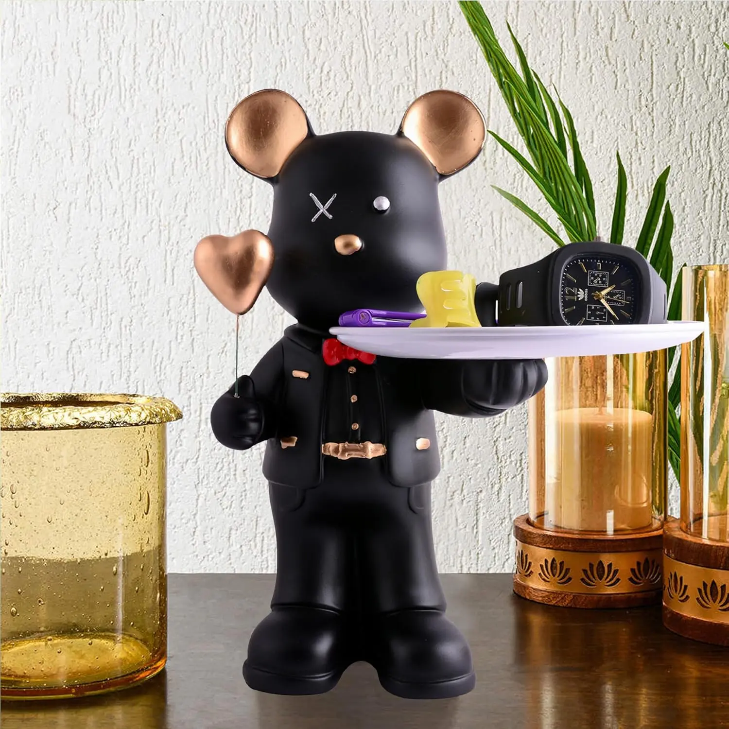 Upgrade your organization game with our Black Bear Butler Statue with Tray. This isn't just a figurine; it's your personal assistant for keeping clutter at bay. The statue depicts a stylish bear character dressed like a gentleman with a Red Bow Tie and gold buttons, standing in a welcoming pose. The design is packed with personality. From the Gold Heart Balloon held in its right hand to the quirky "X" eye detail, it exudes a modern, artistic flair that appeals to fans of pop culture and urban art. The White Serving Tray is perfectly positioned to hold your valuables—as seen in the image, it easily accommodates a wristwatch and accessories. Whether you place it in your foyer to catch keys or on your desk to hold office supplies, this bear brings a smile and a sense of order to your daily routine.