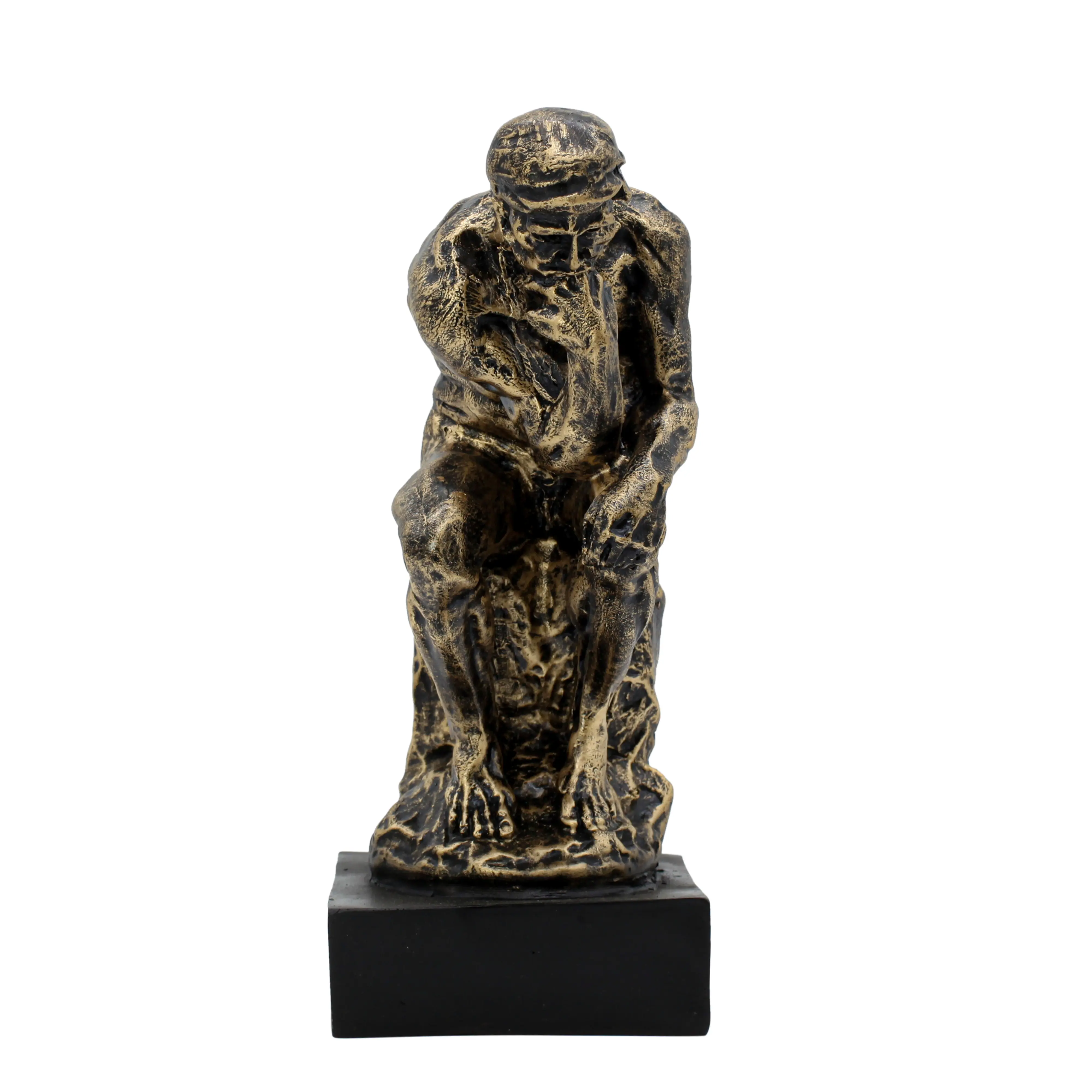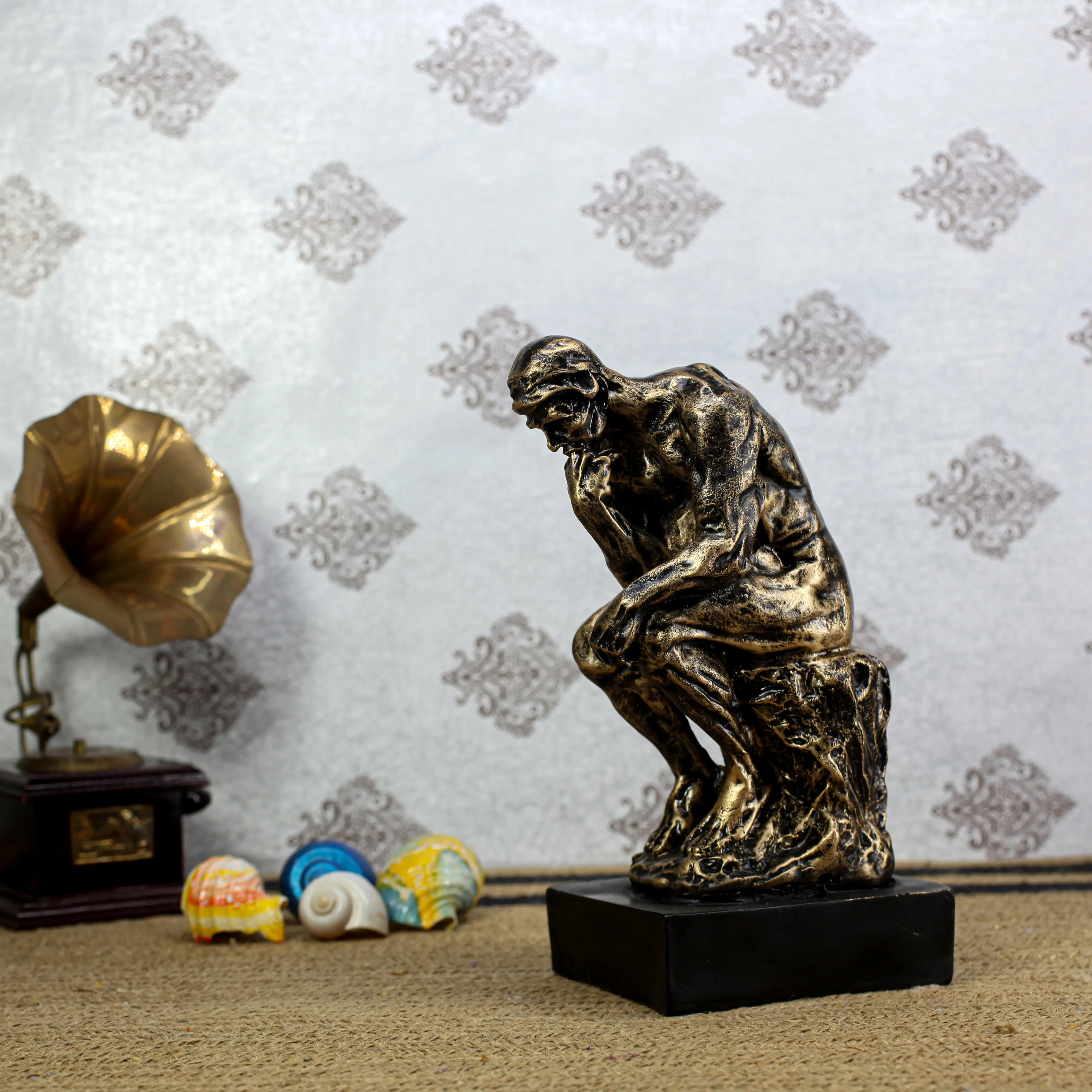 Elevate your environment with the silent power of "The Thinker" Statue. This piece is more than just a decoration; it is a tribute to the history of art and human thought. Modeled after the renowned sculpture by Auguste Rodin, this figurine depicts a nude male figure sitting on a rock, deeply immersed in problem-solving and contemplation. The craftsmanship is designed to impress. The Antique Gold Finish gives it a weathered, museum-quality appearance, mimicking the look of aged bronze or cast iron. The play of light and shadow on the muscular definition adds depth and drama to the piece. Whether placed on a stack of books in your library or serving as a paperweight on an executive desk, this statue commands respect and encourages a moment of pause in a busy day.