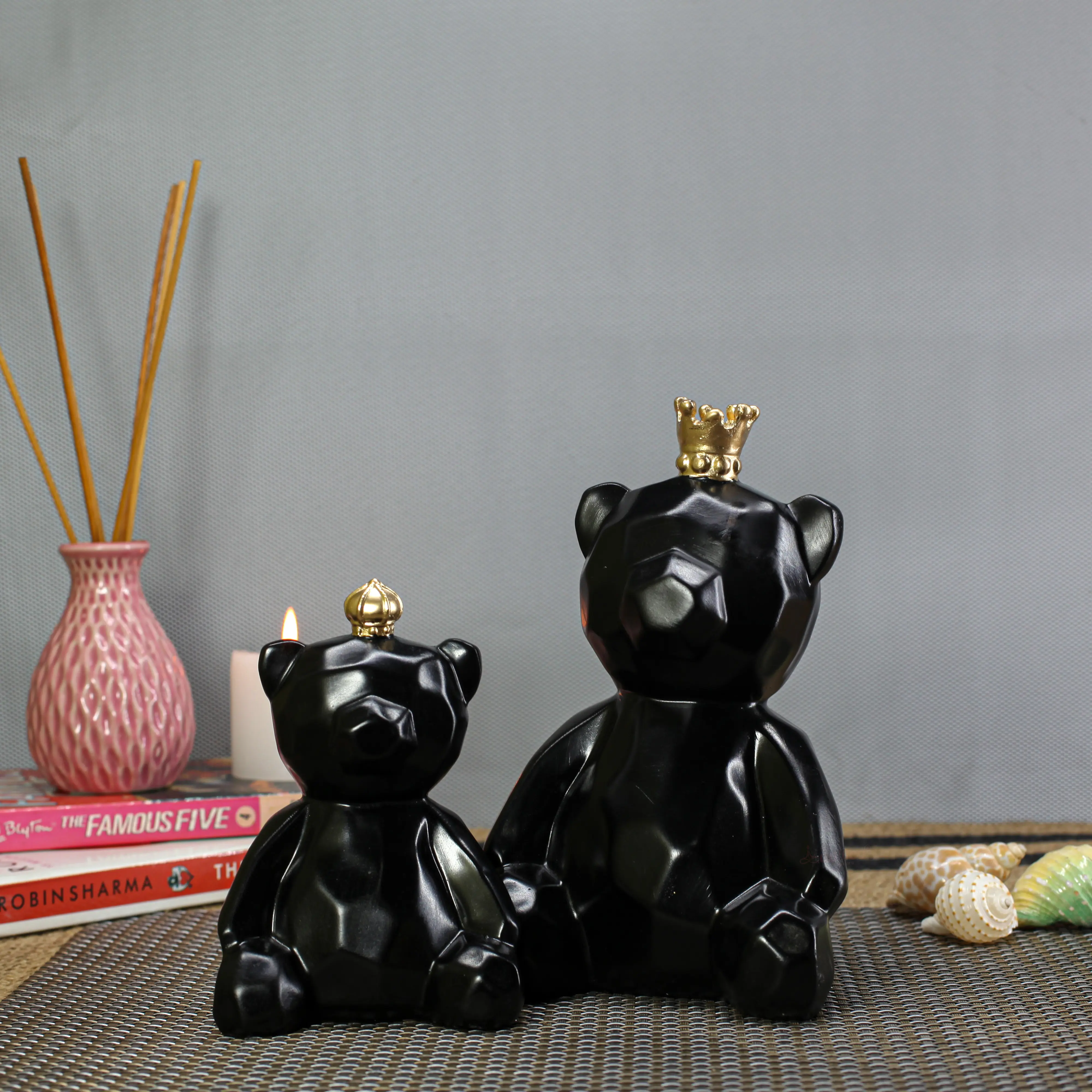 Add a royal touch to your décor with the Luxury Black Geometric Teddy Bear Couple Resin Showpiece with Gold Crowns by Urban Kraft. Crafted from premium polyresin, this stylish teddy bear set features a bold matte black finish complemented by elegant gold crown detailing. The modern geometric design symbolizes love, unity, and sophistication. Perfect for living rooms, bedrooms, office desks, shelves, cafés, and boutique interiors, this teddy bear couple enhances both luxury and minimalist spaces. Durable, lightweight, and easy to maintain, it makes an excellent gifting choice for anniversaries, weddings, Valentine’s Day, birthdays, housewarming ceremonies, and festive occasions. A beautiful blend of modern art and emotional value, this décor piece instantly elevates any space.