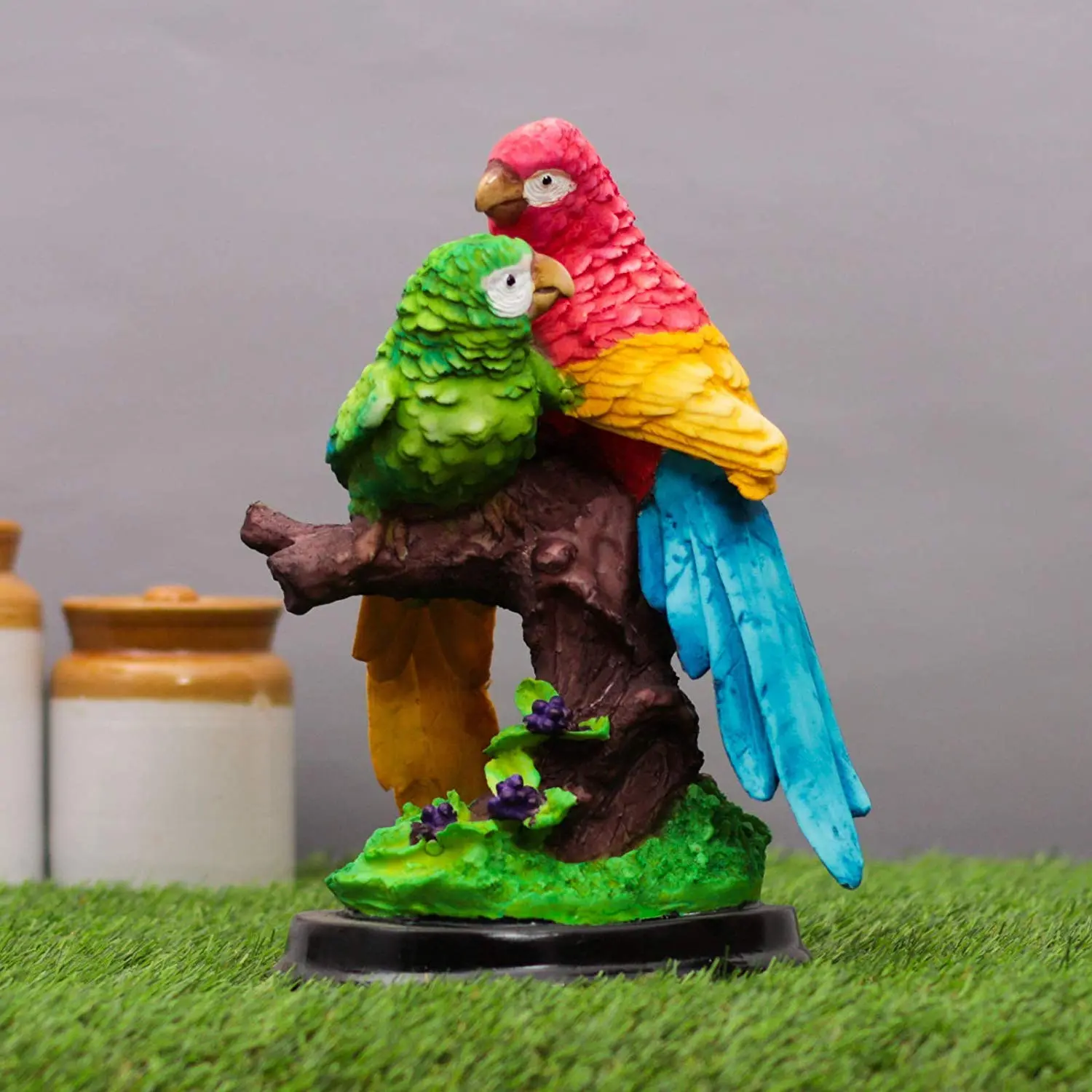 Add a touch of romance and tropical charm to your home with our Multicolor Love Birds Statue. This captivating showpiece features two beautifully sculpted parrots perched side-by-side on a rustic branch, symbolizing deep affection and companionship. The vivid color palette—ranging from fiery reds and deep blues to soothing greens and yellows—instantly brightens up dull corners and adds a lively energy to your space. Crafted from durable polyresin, this figurine rests on a sturdy black circular base, making it easy to display on shelves, side tables, or mantels. Whether you are looking to enhance the Feng Shui of your bedroom or simply want a nature-inspired decor piece, these love birds are the perfect choice. It also serves as a heartwarming gift for couples, reminding them of the beauty of partnership and love.