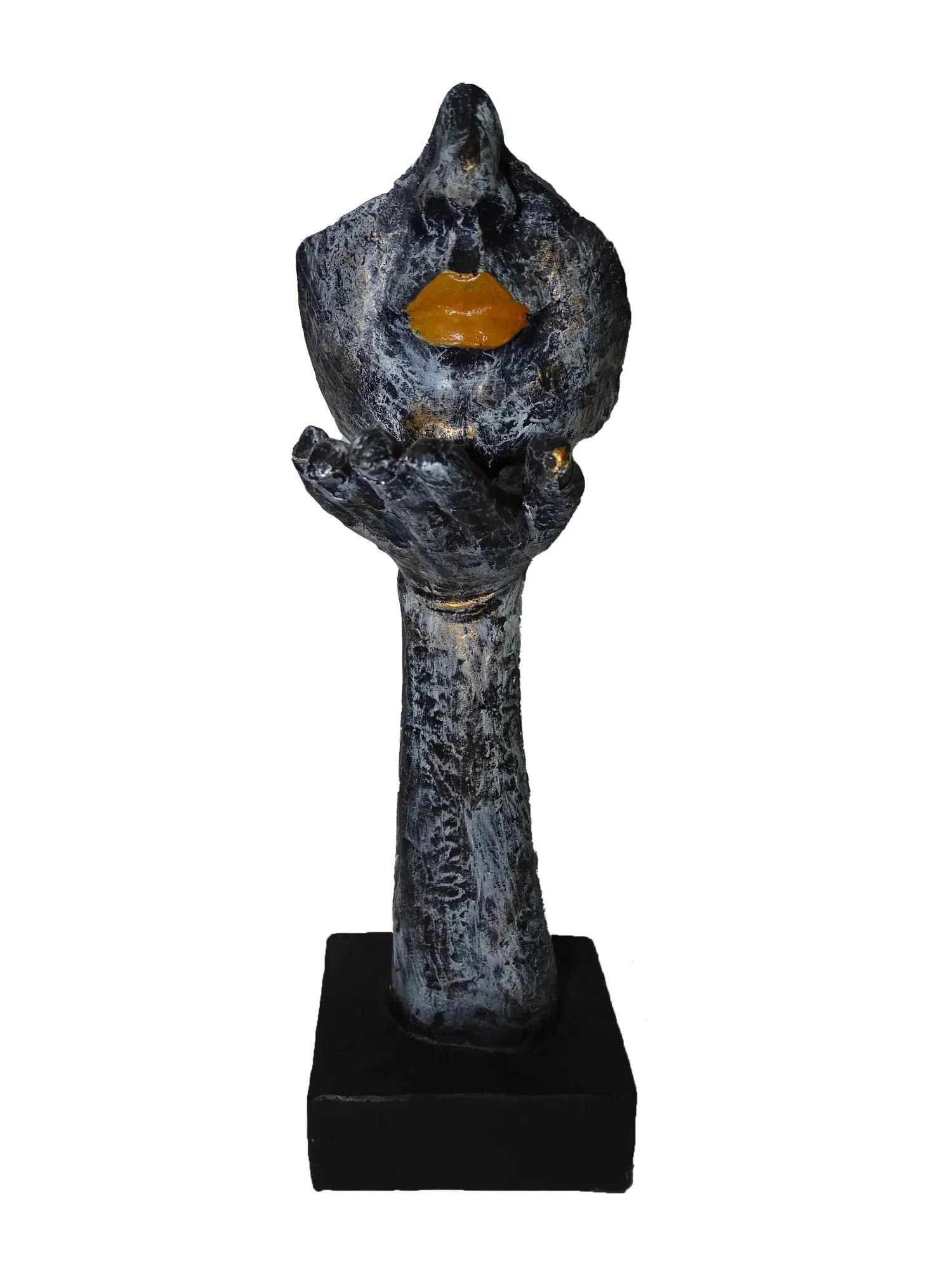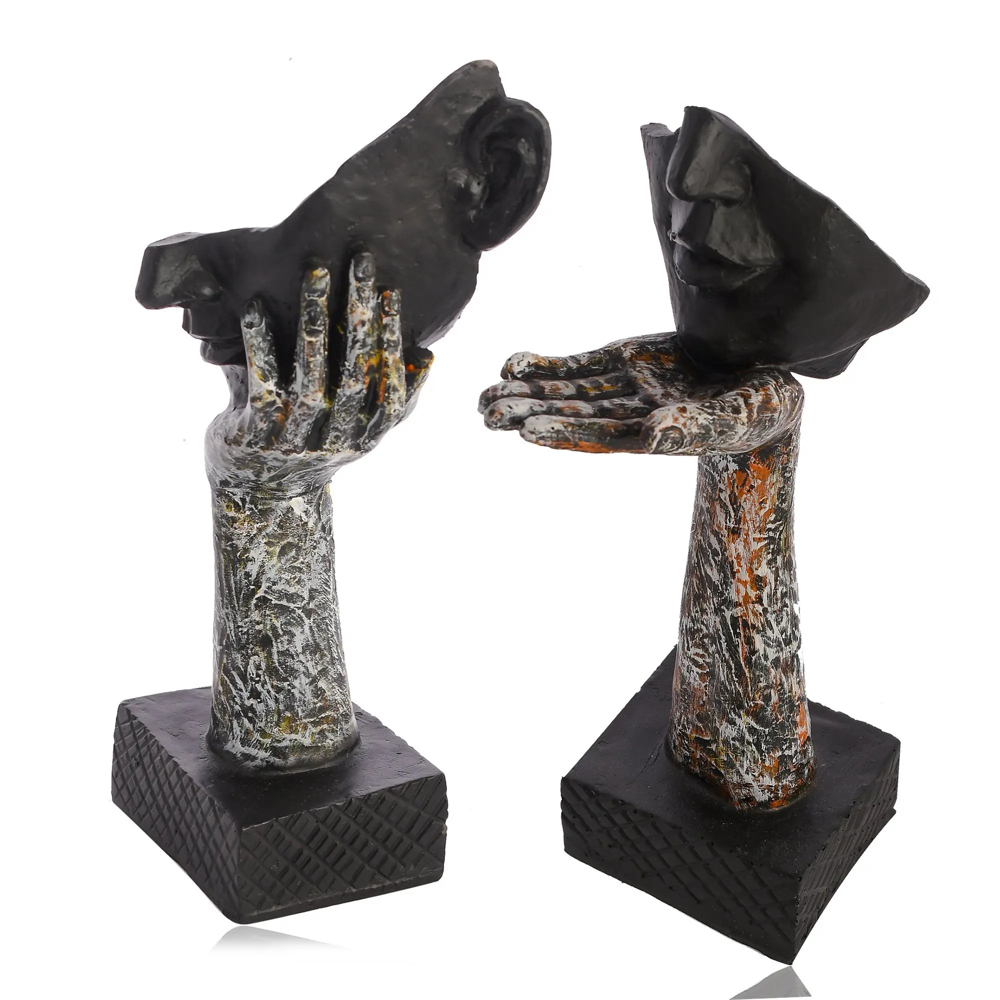 Turn your home into a sanctuary of modern thought with our Abstract "Listener & Speaker" Face Sculpture Set. This duo is a masterclass in visual storytelling. Moving away from traditional portraits, these statues isolate the senses to make a point. One piece focuses on the Art of Listening, depicting a hand gently cupping a face fragment with a detailed ear. The other represents the Power of Speech, presenting a mouth and nose to the world. The aesthetic is raw and contemporary. The Distressed Black & Grey Finish mimics the appearance of heavy metal or aged clay, adding a touch of "Industrial Chic" to your interior. The rough texture contrasts beautifully with the smooth lines of modern furniture. Whether placed together on a mantelpiece or separated across a bookshelf, these statues are not just decorations—they are a reminder of the importance of connection and communication.
