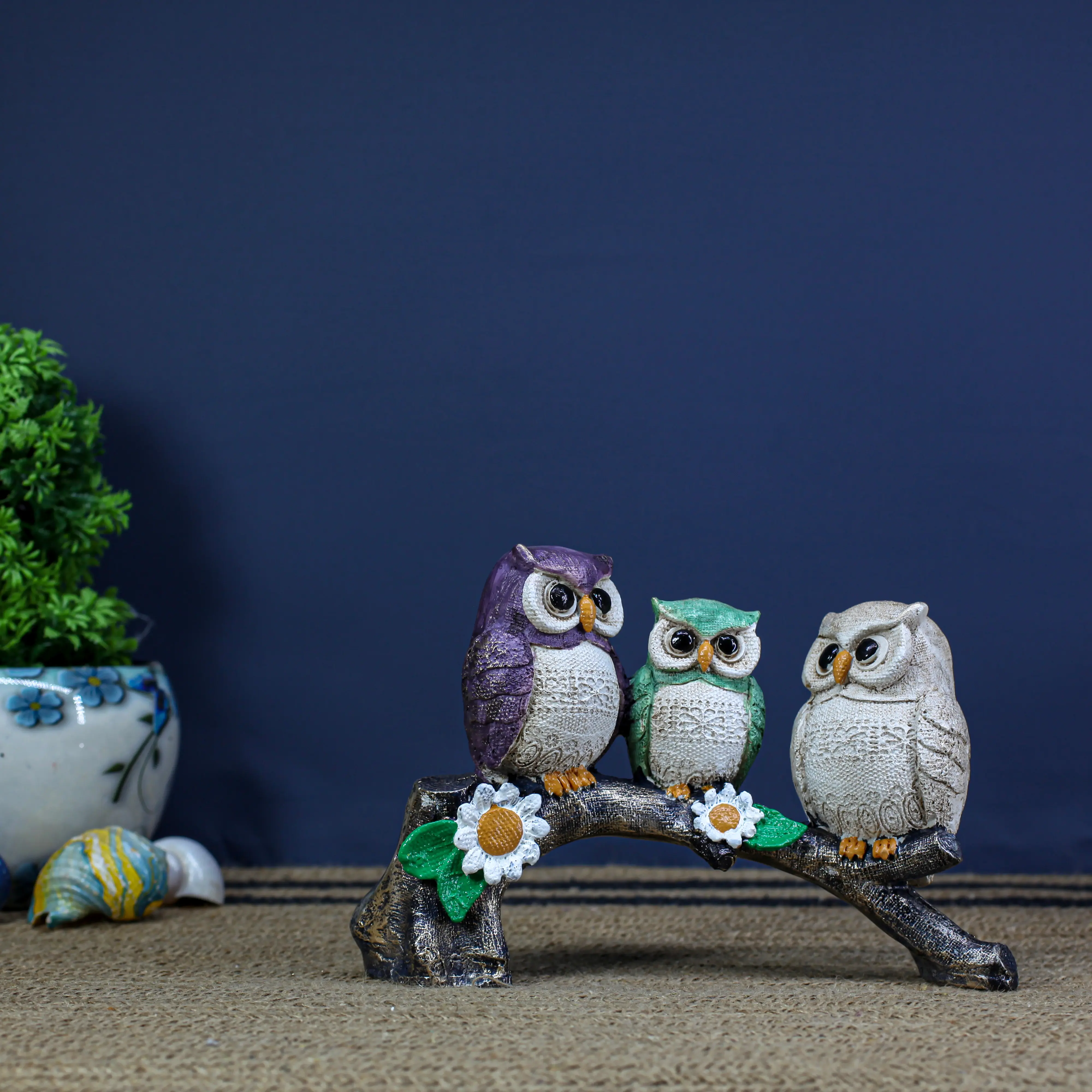 Celebrate the joy of togetherness with this exquisite Colorful Trio of Owls on Branch Statue. This heartwarming figurine features three wide-eyed owls perched side-by-side, representing a family unit or a group of inseparable friends. What sets this piece apart is the unique texture; each owl's belly features an intricate, molded "lace" pattern that gives it a cozy, handcrafted look, contrasting beautifully with the smooth feathers on their heads. The color palette is a visual treat, combining a deep Purple, a fresh Green, and a soft Beige/Cream, ensuring it complements a wide range of interior styles. Perched on a textured tree branch decorated with blooming white flowers and green leaves, this durable polyresin statue brings the freshness of nature indoors. Whether displayed in a child's bedroom, a living room shelf, or gifted to a loved one, these wise little birds are sure to spread happiness.