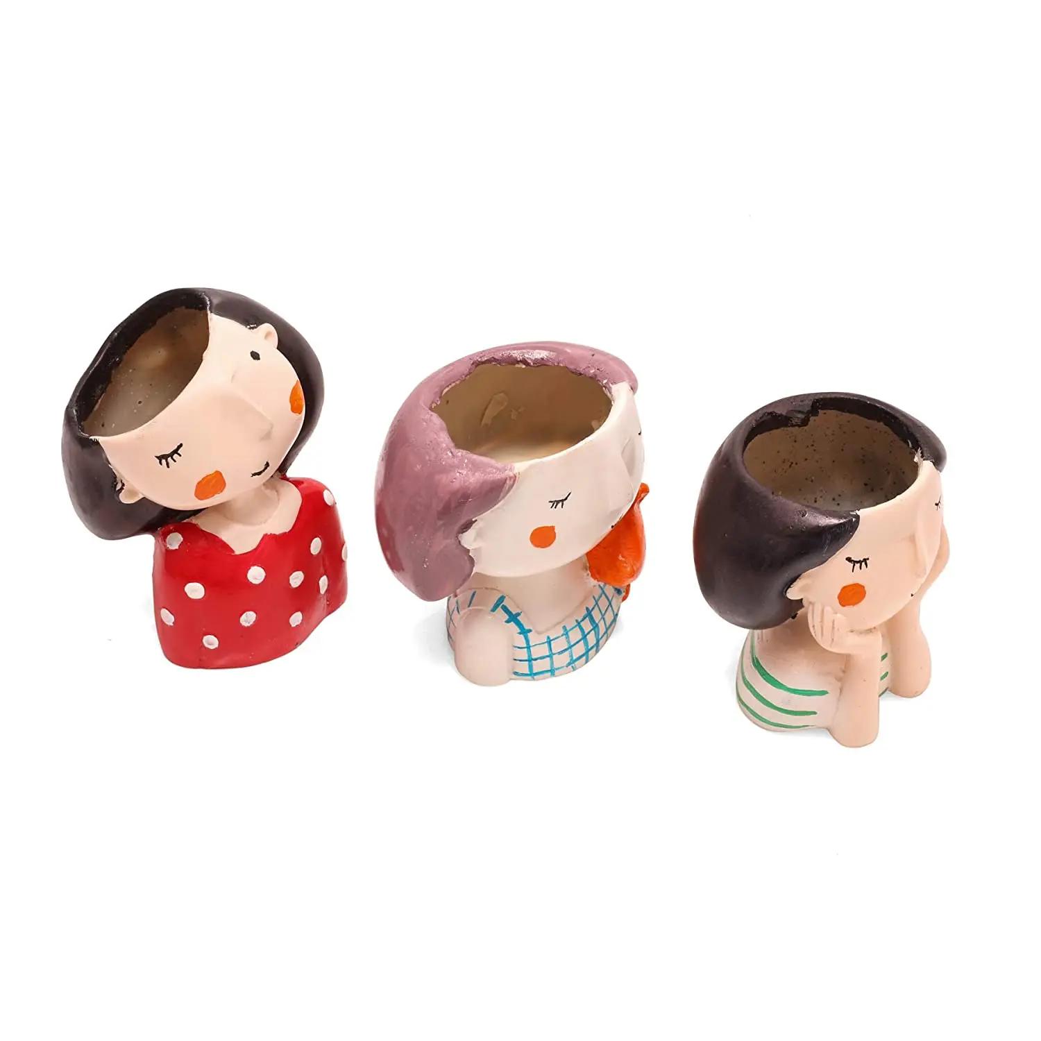 Add a touch of sweetness and personality to your indoor garden with this delightful Set of 3 Cute Girl Head Succulent Planters. These aren't just flower pots; they are characters that bring joy to your daily routine. The set includes three unique designs: a "Daydreamer" in a green striped top, a "Cat Lover" in a blue checkered dress holding a pet, and a "Playful Girl" in a red polka-dot dress. Crafted from durable, high-quality resin, each planter features a hand-painted finish with soft, pastel colors and adorable details like rosy cheeks and peaceful, closed eyes. They are the perfect size for housing small succulents, cacti, or air plants. If you don't have a green thumb, simply use them as quirky desk organizers to hold your pens, pencils, or makeup brushes. Place them together as a trio or separate them around the house to spread the cuteness!