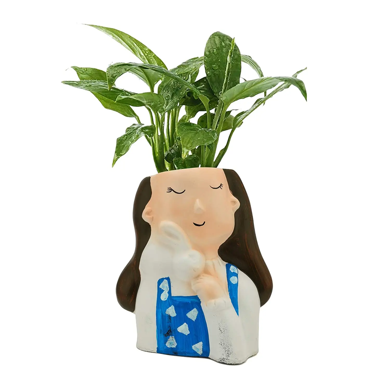 Bring a touch of sweetness and innocence to your indoor garden with this delightful Cute Girl Holding Bunny Head Planter. This charming face pot captures a moment of pure affection, featuring a sweet girl with closed, peaceful eyes gently hugging a fluffy white rabbit. Dressed in a vibrant blue pinafore with white details, she radiates calm and happiness, making her a perfect companion for your workspace or living area. Crafted from high-quality, durable polyresin, this planter is designed to last. The open top is perfectly sized for housing small plants like succulents, lithops, or trailing herbs that look like "hair." If you prefer not to plant in it, it doubles as an adorable desk organizer for your pens, pencils, or even makeup brushes. Whether you are looking for a unique gift for a bunny lover or a cute accent for a nursery, this planter is sure to delight.