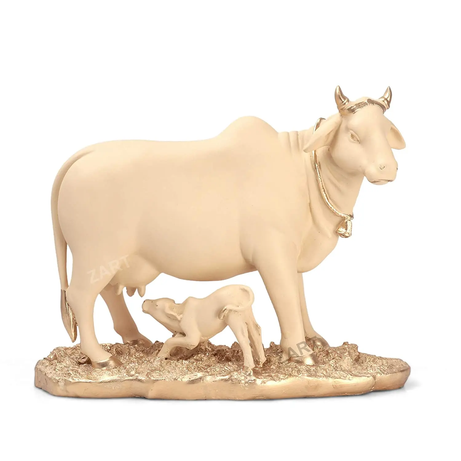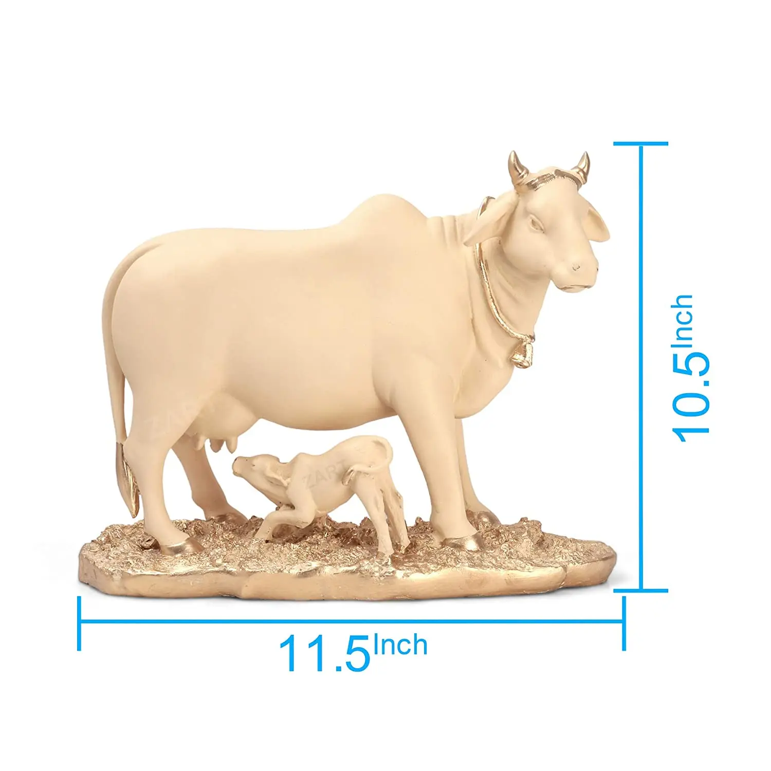 Bring divine blessings and an aura of tranquility to your home with this exquisite Sacred Kamadhenu Cow and Calf Statue. This handcrafted figurine depicts the celestial "Gau Mata" (Mother Cow) lovingly feeding her calf, capturing the purest form of motherly love and nourishment. The statue is finished in a serene cream color, highlighted with opulent Gold accents on the horns, jewelry, and the textured grassy base, giving it a premium and divine look. In Hindu tradition and Vastu Shastra, Kamadhenu is revered as the "Wish-Fulfilling Cow" that removes obstacles and brings wealth, health, and happiness. Crafted from durable high-quality resin, this idol is designed to last. Whether placed in your Puja room to enhance spiritual vibrations or in your living room as a symbol of peace, this beautiful showpiece serves as a constant reminder of abundance and prosperity. It is the perfect spiritual addition to any modern or traditional home.
