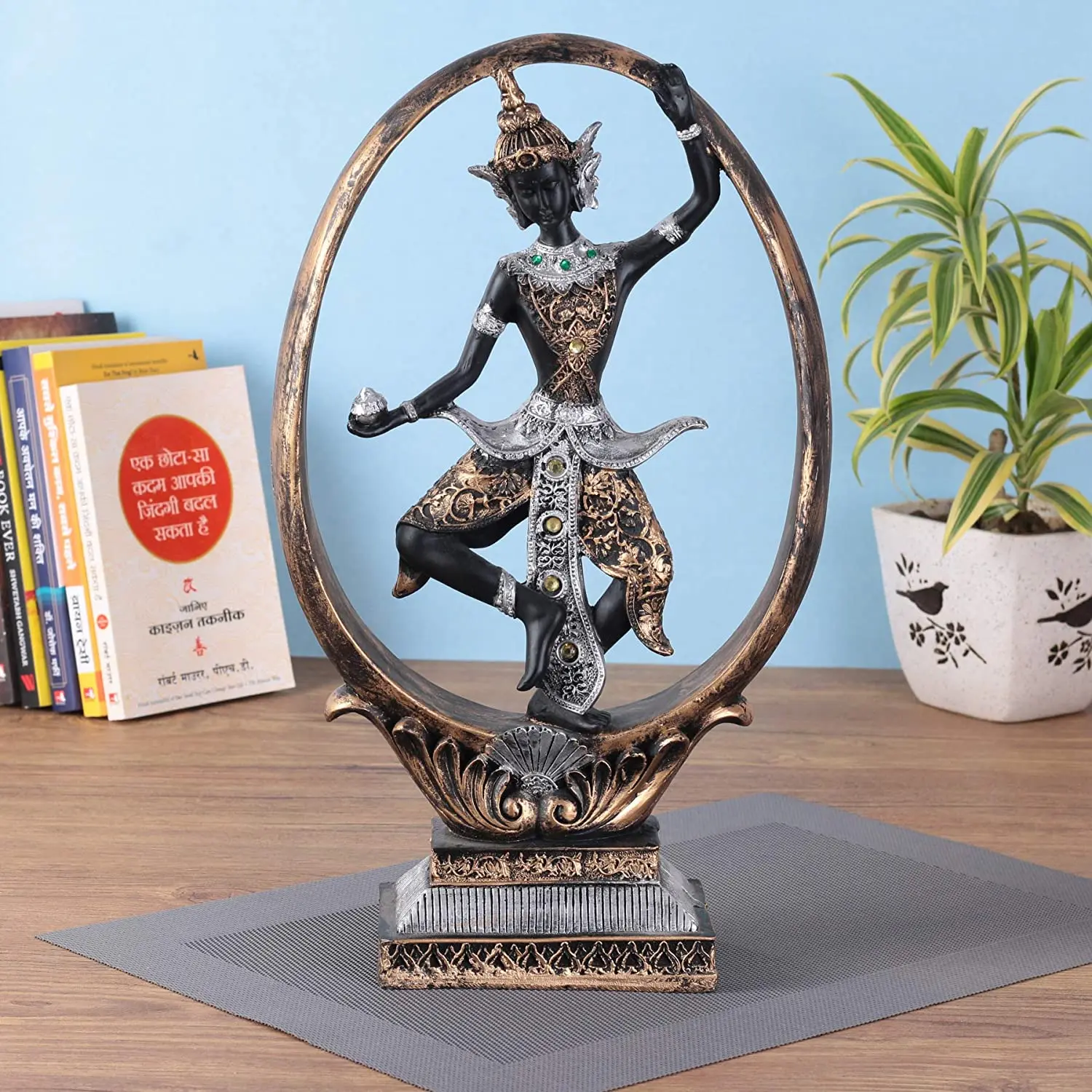 Infuse your living space with an aura of grace and tranquility with our Polyresin Thai Dancing Lady Statue. This magnificent showpiece captures the timeless beauty of traditional Southeast Asian dance, frozen in a moment of elegant movement. The figure is delicately sculpted within an artistic oval frame, creating a harmonious balance between the subject and its surroundings. The statue stands out with its sophisticated color scheme; the deep black body creates a dramatic backdrop for the ornate gold and silver embellishments on the costume and headdress. Whether placed on a console table in your entryway to welcome guests or used to add a touch of Zen to your office desk, this figurine commands attention. It is not just a decorative item but a piece of art that reflects refined taste. Durable, easy to clean, and visually captivating, it is the perfect upgrade for modern and traditional interiors alike.