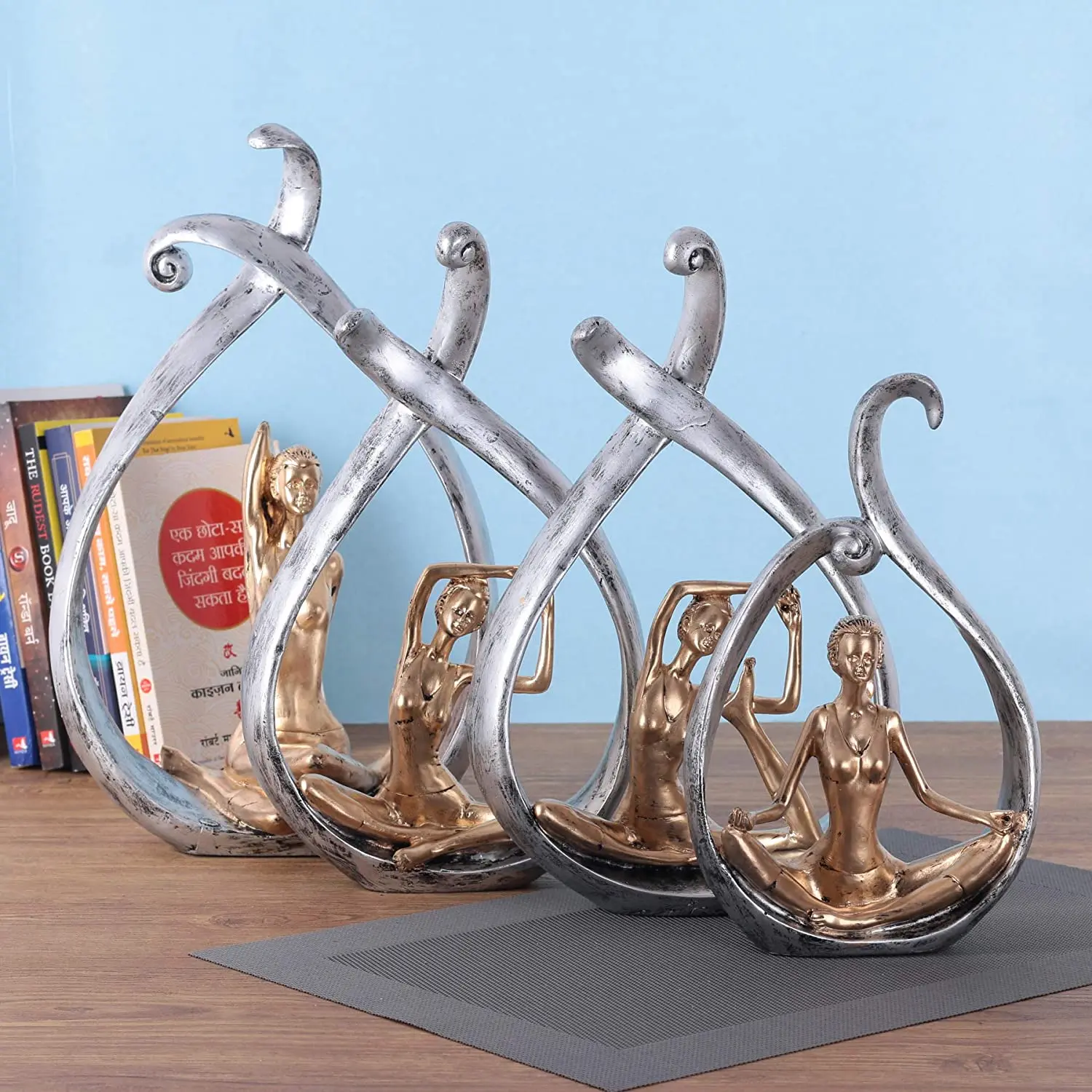 Elevate the spiritual and aesthetic vibe of your living space with our Set of 4 Polyresin Yoga Lady Figurines. This exquisite collection captures the essence of tranquility and physical grace, featuring four distinct figures performing traditional yoga asanas. Each piece is a work of modern art, where the fluid lines of the human form are encased within a stylized, antique silver teardrop frame. The striking contrast between the shimmering gold body of the yoginis and the rustic, textured silver frame creates a luxurious look that fits both contemporary and traditional interiors. Whether displayed side-by-side on a mantelpiece or separated across different shelves, these statues serve as a daily reminder of balance and inner peace. Perfect for yoga studios, office desks, or your personal sanctuary, this set is a must-have for anyone looking to add a touch of sophistication and mindfulness to their home decor.