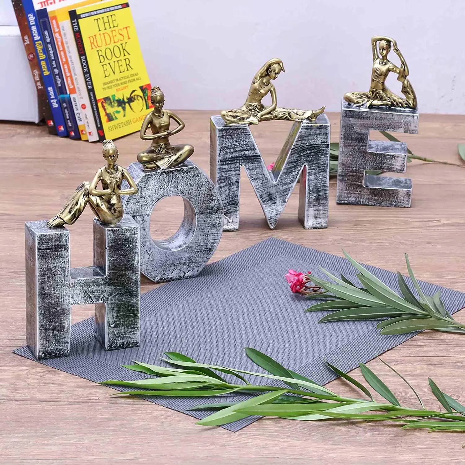 Create a welcoming and peaceful atmosphere in your living space with our Polyresin HOME Letters with Yoga Figurines. This unique decor set reimagines the classic "HOME" sign by integrating elements of mindfulness and physical grace. The set consists of four separate letter blocks—H, O, M, E—finished in a stylish antique silver texture that mimics weathered metal. Perched atop each letter is a beautifully sculpted golden yoga lady, each captured in a different pose of meditation or stretching. The contrast between the cool silver base and the warm gold figures adds a touch of modern luxury to any room. Whether arranged together on a shelf or spread out across a console table, this showpiece serves as a gentle reminder to breathe, relax, and find comfort in your own home. It is an ideal gift for yoga lovers or new homeowners.